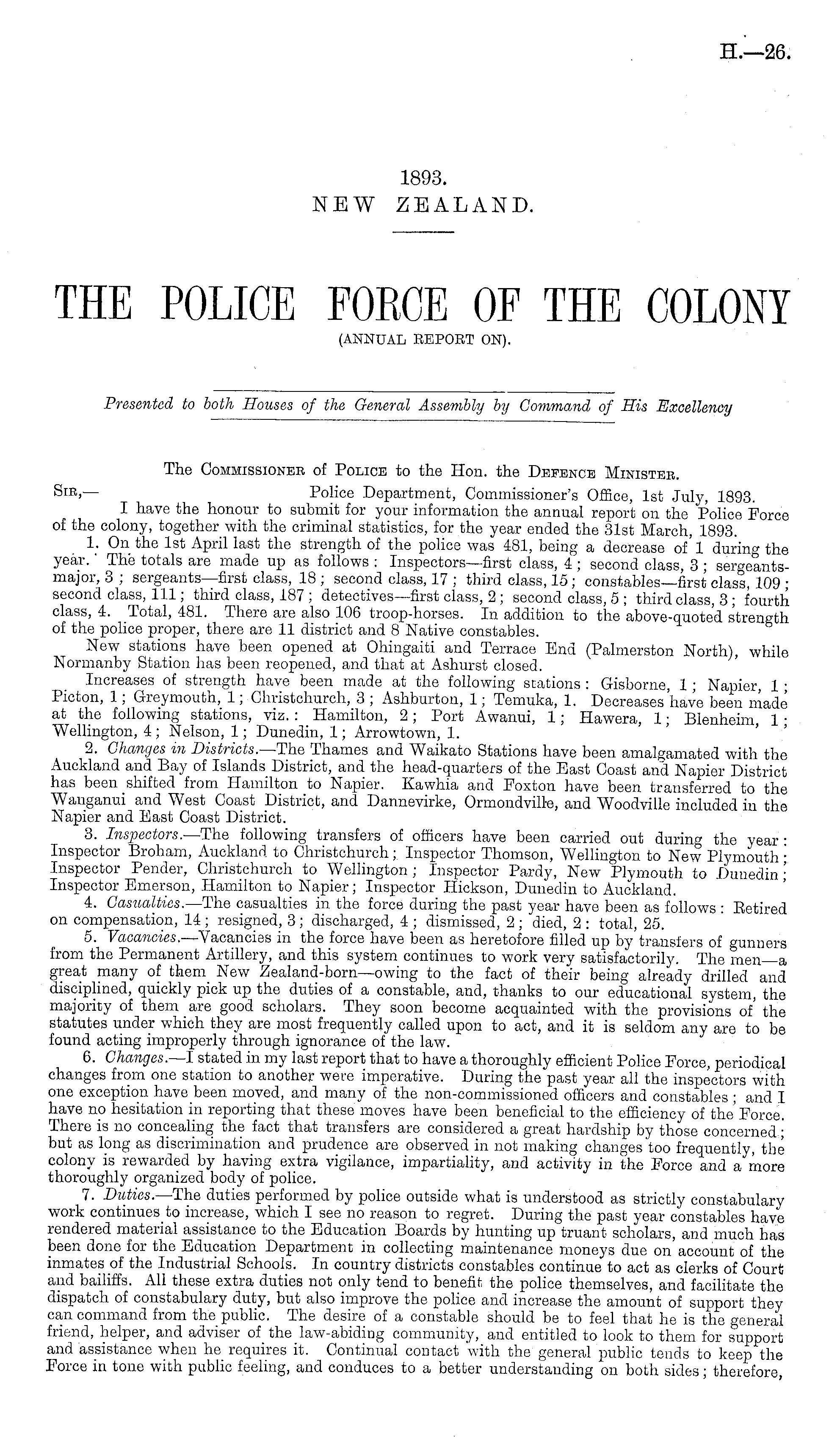 The Commissioneb of Police to the Hon. the Defence Ministee. Sib,— Police Department, Commissioner's Office, Ist July, 1893. I have the honour to submit for your information the annual report on the Police Force of the colony, together with the criminal statistics, for the year ended the 31st March, 1893. 1. On the Ist April last the strength of the police was 481, being a decrease of'l during the year.' The totals are made up as follows : Inspectors—first class, 4 ; second class, 3 ; sergeantsmajor, 3 ; sergeants—first class, 18 ; second class, 17 ; third class, 15; constables—first class, 109 ; second class, 111; third class, 187 ; detectives—first class, 2 ; second class, 5 ; third class, 3; fourth class, 4. Total, 481. There are also 106 troop-horses. In addition to the above-quoted strength of the police proper, there are 11 district and 8 Native constables. New stations have been opened at Ohingaiti and Terrace End (Palmerston North), while Normanby Station has been reopened, and that at Ashurst closed. Increases of strength have been made at the following stations : Gisborne, 1; Napier, 1 ; Picton, 1; Greymouth, 1; Christchurch, 3 ; Ashburton, 1; Temuka, 1. Decreases have been made at the following stations, viz. : Hamilton, 2; Port Awanui, 1; Hawera, 1; Blenheim 1 ■ Wellington, 4; Nelson, 1; Dunedin, 1; Arrowtown, 1. 2. Changes %n Districts. —The Thames and Waikato Stations have been amalgamated with the Auckland and Bay of Islands District, and the head-quarters of the East Coast and Napier District has been shifted from Hamilton to Napier. Kawhia and Foxton have been transferred to the Wanganui and West Coast District, and Dannevirke, Ormondville, and Woodville included in the Napier and East Coast District. 3. Inspectors. —The following transfers of officers have been carried out the year : Inspector Broham, Auckland to Christchurch; Inspector Thomson, Wellington to New Plymouth; Inspector Pender, Christchurch to Wellington ; Inspector Pardy, New Plymouth to Dunedin ; Inspector Emerson, Hamilton to Napier; Inspector Hickson, Dunedin to Auckland. 4. Casualties. —The casualties in the force during the past year have been as follows : Eetired on compensation, 14 ; resigned, 3 ; discharged, 4 ; dismissed, 2 ; died, 2 : total, 25. 5. Vacancies.— Vacancies in the force have been as heretofore filled up by transfers of gunners from the Permanent Artillery, and this system continues to work very satisfactorily. The men—a great many of them New Zealand-born—owing to the fact of their being already drilled and disciplined, quickly pick up the duties of a constable, and, thanks to our educational system, the majority of them are good scholars. They soon become acquainted with the provisions of' the statutes under which they are most frequently called upon to act, and it is seldom any are to be found acting improperly through ignorance of the law. 6. Changes.—l stated in my last report that to have a thoroughly efficient Police Force, periodical changes from one station to another were imperative. During the past year all the inspectors with one exception have been moved, and many of the non-commissioned officers and constables; and I have no hesitation in reporting that these moves have been beneficial to the efficiency of the'Force. There is no concealing the fact that transfers are considered a great hardship by those concerned ' but as long as discrimination and prudence are observed in not making changes too frequently, the colony is rewarded by having extra vigilance, impartiality, and activity in the Force and a more thoroughly organized body of police. 7. Duties. —The duties performed by police outside what is understood as strictly constabulary work continues to increase, which I see no reason to regret. During the past year constables have rendered material assistance to the Education Boards by hunting up truant scholars, and much has been done for the Education Department in collecting maintenance moneys due on account of the inmates of the Industrial Schools. In country districts constables continue to act as clerks of Court and bailiffs. All these extra duties not only tend to benefit the police themselves, and facilitate the dispatch of constabulary duty, but also improve the police and increase the amount of support they can command from the public. The desire of a constable should be to feel that he is the general friend, helper, and adviser of the law-abiding community, and entitled to look to them for support and assistance when he requires it. Continual contact with the general public tends to keep the Force in tone with public feeling, and conduces to a better understanding on both sides; therefore,
