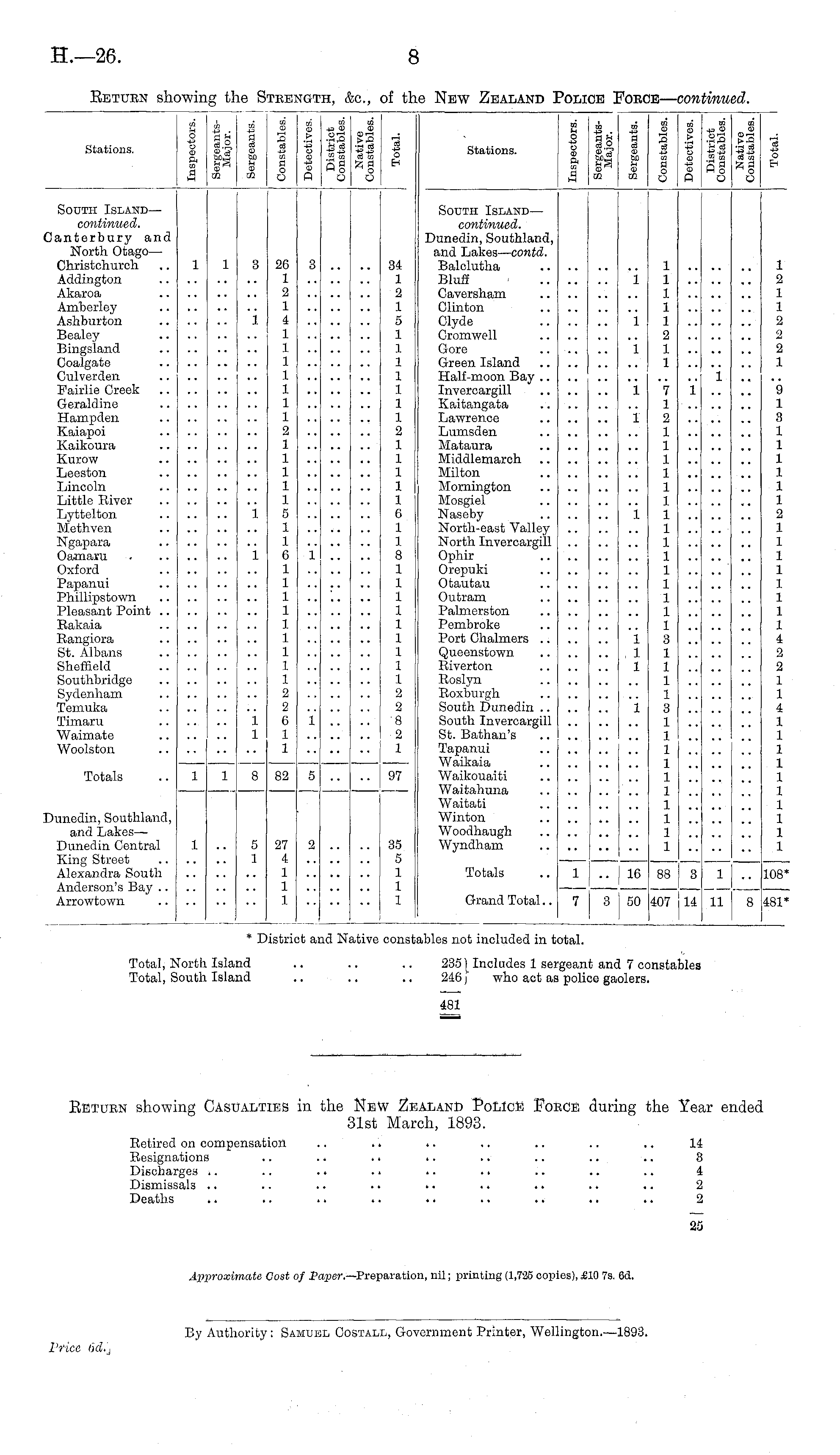 Betuen showing Casualties in the New Zealand IPoLIce Foece during the Year ended 31st March, 1893. Retired on compensation .. .. .. .. .. .. .. 14 Resignations .. .. .. .. .. .. .. .. S Discharges .. .. .. .. .. .. .. .. .. 4 Dismissals .. .. .. .. .. .. .. .. .. 2 Deaths .. .. .. .. .. .. .. .. .. 2 25 Approximate Cost of Paper.—Preparation, nil; printing (1,725 copies), £10 7s. 6d.