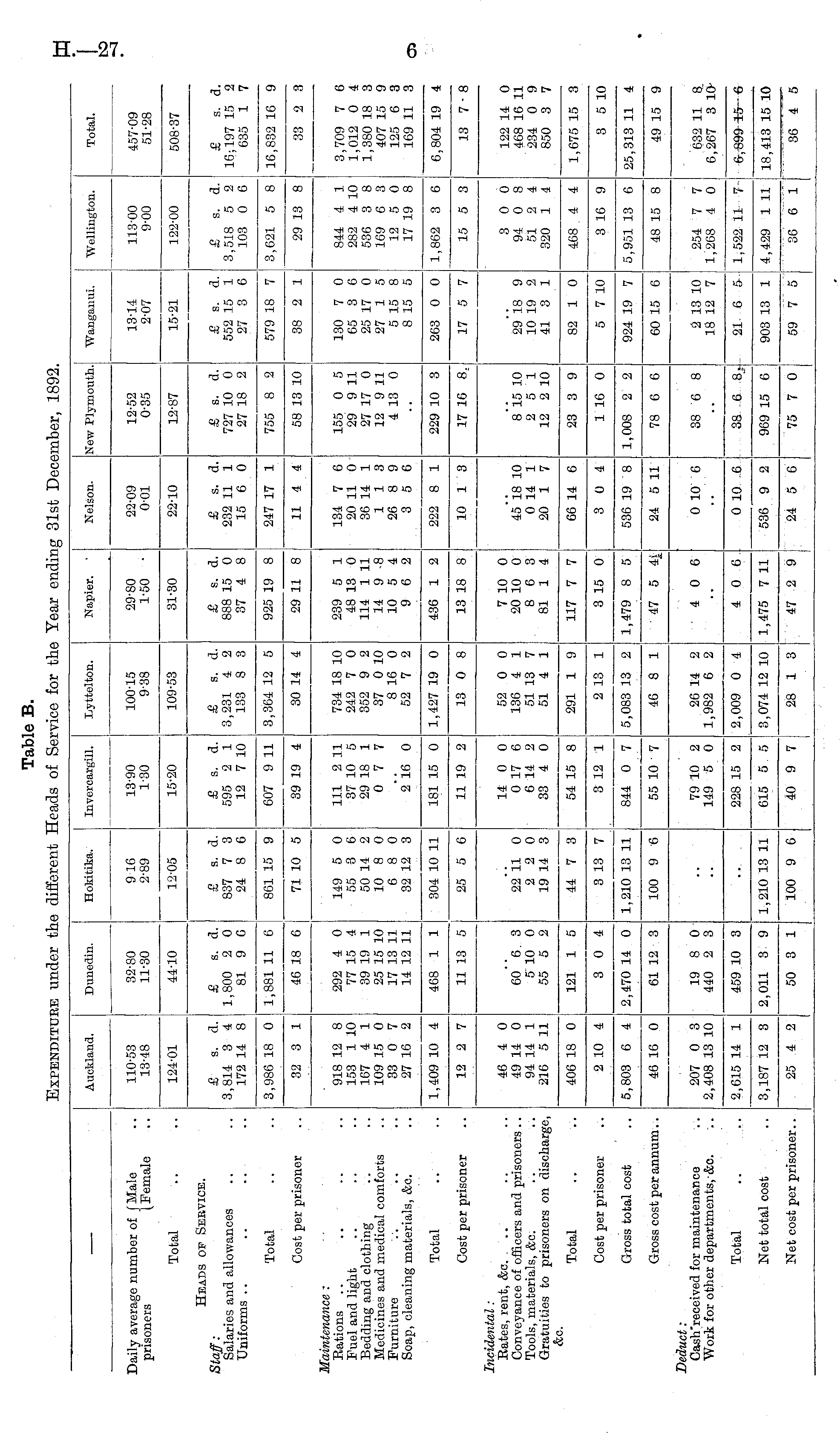 Table B. Expenditure under the different Heads of Service for the Year ending 31st December, 1892.