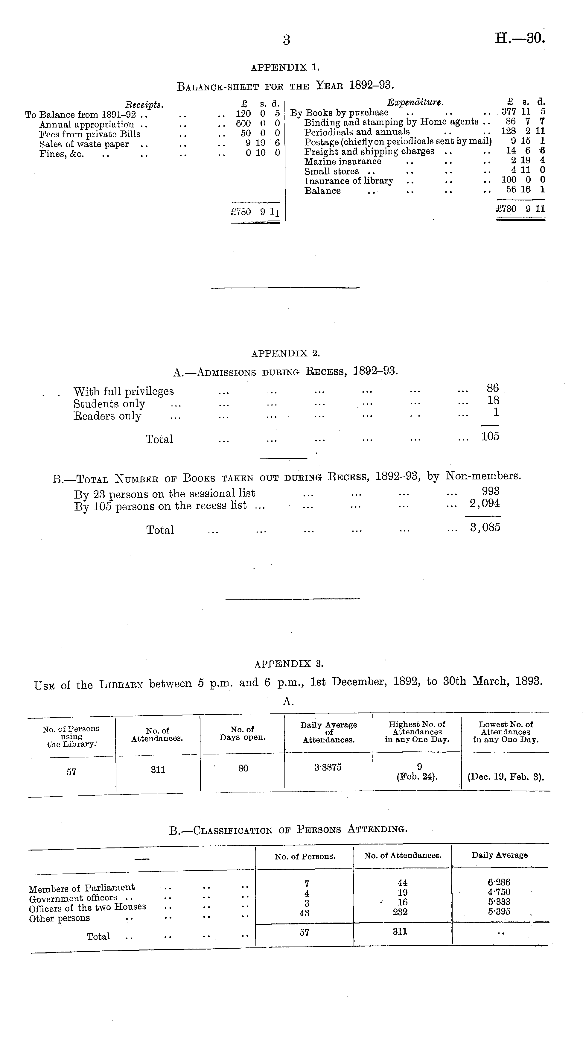 APPENDIX 3. Use of the Library between 5 p.m. and 6 p.m., 1st December, 1892, to 30th March, 1893. A.