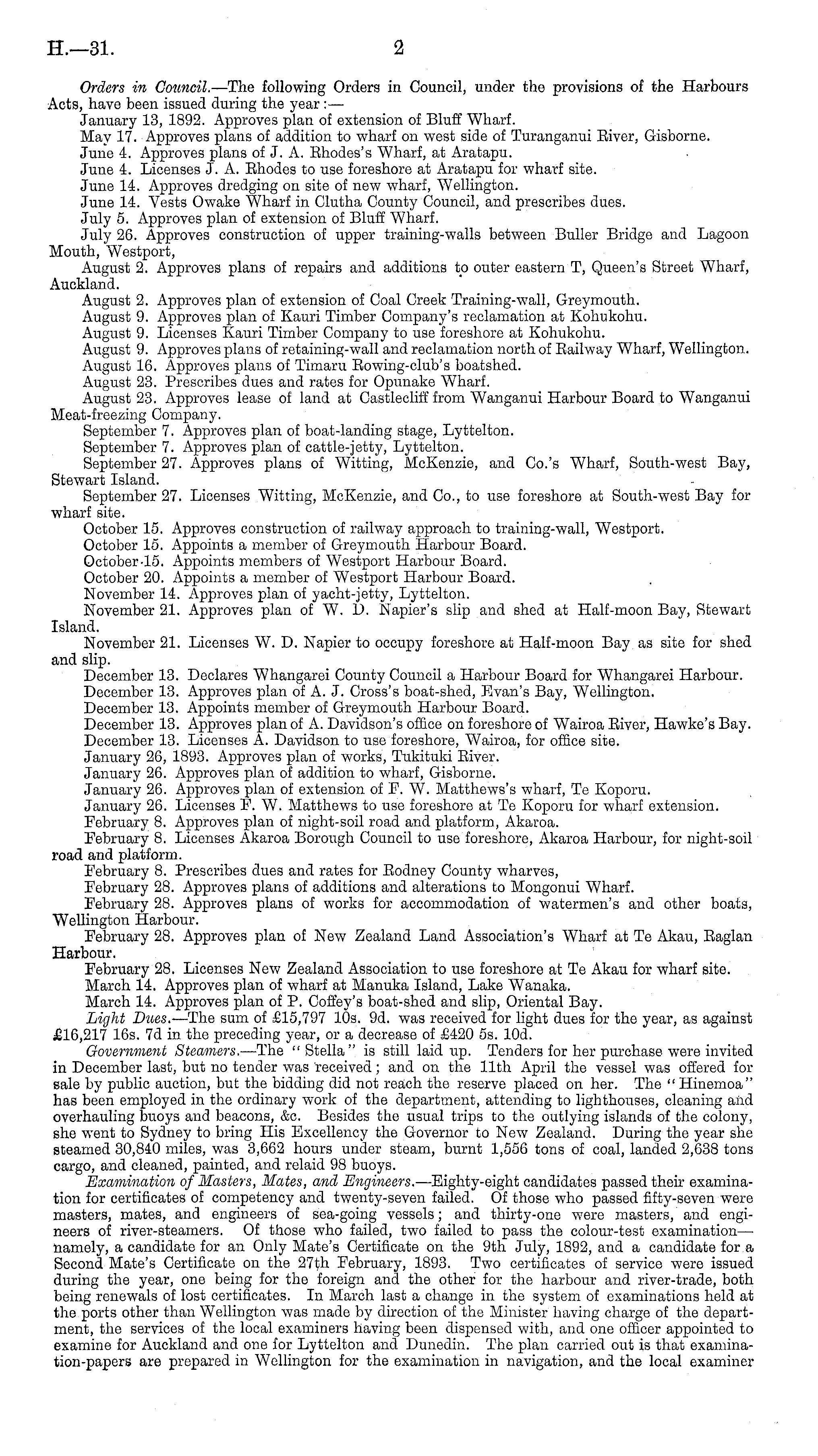 Orders in Council. —The following Orders in Council, under the provisions of the Harbours Acts, have been issued during the year : — January 13, 1892. Approves plan of extension of Bluff Wharf. May 17. Approves plans of addition to wharf on west side of Turanganui Eiver, Gisborne. June 4. Approves plans of J. A. Bhodes's Wharf, at Aratapu. June 4. Licenses J. A. Bhodes to use foreshore at Aratapu for wharf site. June 14. Approves dredging on site of new wharf, Wellington. June 14. Vests Owake Wharf in Clutha County Council, and prescribes dues. July 5. Approves plan of extension of Bluff Wharf. July 26. Approves construction of upper training-walls between Buller Bridge and Lagoon Mouth, Westport, August 2. Approves plans of repairs and additions to outer eastern T, Queen's Street Wharf, Auckland. August 2. Approves plan of extension of Coal Creek Training-wall, Greymouth. August 9. Approves plan of Kauri Timber Company's reclamation at Kohukohu. August 9. Licenses Kauri Timber Company to use foreshore at Kohukohu. August 9. Approves plans of retaining-wall and reclamation north of Bailway Wharf, Wellington. August 16. Approves plans of Timaru Bowing-club's boatshed. August 23. Prescribes dues and rates for Opunake Wharf. August 23. Approves lease of land at Castlecliff from Wanganui Harbour Board to Wanganui Meat-freezing Company. September 7. Approves plan of boat-landing stage, Lyttelton. September 7. Approves plan of cattle-jetty, Lyttelton. September 27. Approves plans of Witting, McKenzie, and Co.'s Wharf, South-west Bay, Stewart Island. September 27. Licenses Witting, McKenzie, and Co., to use foreshore at South-west Bay for wharf site. October 15. Approves construction of railway approach to training-wall, Westport. October 15. Appoints a member of Greymouth Harbour Board. October-15. Appoints members of Westport Harbour Board. October 20. Appoints a member of Westport Harbour Board. November 14. Approves plan of yacht-jetty, Lyttelton. November 21. Approves plan of W. D. Napier's slip and shed at Half-moon Bay, Stewart Island. November 21. Licenses W. D. Napier to occupy foreshore at Half-moon Bay as site for shed and slip. December 13. Declares Whangarei County Council a Harbour Board for Whangarei Harbour. December 13. Approves plan of A. J. Cross's boat-shed, Evan's Bay, Wellington. December 13. Appoints member of Greymouth Harbour Board. December 13. Approves plan of A. Davidson's office on foreshore of Wairoa Eiver, Hawke's Bay. December 13. Licenses A. Davidson to use foreshore, Wairoa, for office site. January 26, 1893. Approves plan of works, Tukituki Eiver. January 26. Approves plan of addition to wharf, Gisborne. January 26. Approves plan of extension of F. W. Matthews's wharf, Te Koporu. January 26. Licenses F. W. Matthews to use foreshore at To Koporu for wharf extension. February 8. Approves plan of night-soil road and platform, Akaroa. February 8. Licenses Akaroa Borough Council to use foreshore, Akaroa Harbour, for night-soil road and platform. February 8. Prescribes dues and rates for Bodney County wharves, February 28. Approves plans of additions and alterations to Mongonui Wharf. February 28. Approves plans of works for accommodation of watermen's and other boats, Wellington Harbour. February 28. Approves plan of New Zealand Land Association's Wharf at Te Akau, Baglan Harbour. February 28. Licenses New Zealand Association to use foreshore at Te Akau for wharf site. March 14. Approves plan of wharf at Manuka Island, Lake Wanaka. March 14. Approves plan of P. Coffey's boat-shed and slip, Oriental Bay. Light Dues. —The sum of £15,797 10s. 9d. was received for light dues for the year, as against £16,217 16s. 7d in the preceding year, or a decrease of £420 ss. lOd. Government Steamers. —The "Stella" is still laid up. Tenders for her purchase were invited in December last, but no tender was received; and on the 11th April the vessel was offered for sale by public auction, but the bidding did not reach the reserve placed on her. The " Hinemoa" has been employed in the ordinary work of the department, attending to lighthouses, cleaning and overhauling buoys and beacons, &c. Besides the usual trips to the outlying islands of the colony, she went to Sydney to bring His Excellency the Governor to New Zealand. During the year she steamed 30,840 miles, w r as 3,662 hours under steam, burnt 1,556 tons of coal, landed 2,638 tons cargo, and cleaned, painted, and relaid 98 buoys. Examination of Masters, Mates, and Engineers. —Eighty-eight candidates passed their examination for certificates of competency and twenty-seven failed. Of those who passed fifty-seven were masters, mates, and engineers of sea-going vessels; and thirty-one were masters, and engineers of river-steamers. Of those who failed, two failed to pass the colour-test examination — namely, a candidate for an Only Mate's Certificate on the 9th July, 1892, and a candidate for a Second Mate's Certificate on the 27th February, 1893. Two certificates of service were issued during the year, one being for the foreign and the other for the harbour and river-trade, both being renewals of lost certificates. In March last a change in the system of examinations held at the ports other than Wellington was made by direction of the Minister having charge of the department, the services of the local examiners having been dispensed with, and one officer appointed to examine for Auckland and one for Lyttelton and Dunedin. The plan carried out is that examina-tion-papers are prepared in Wellington for the examination in navigation, and the local examiner