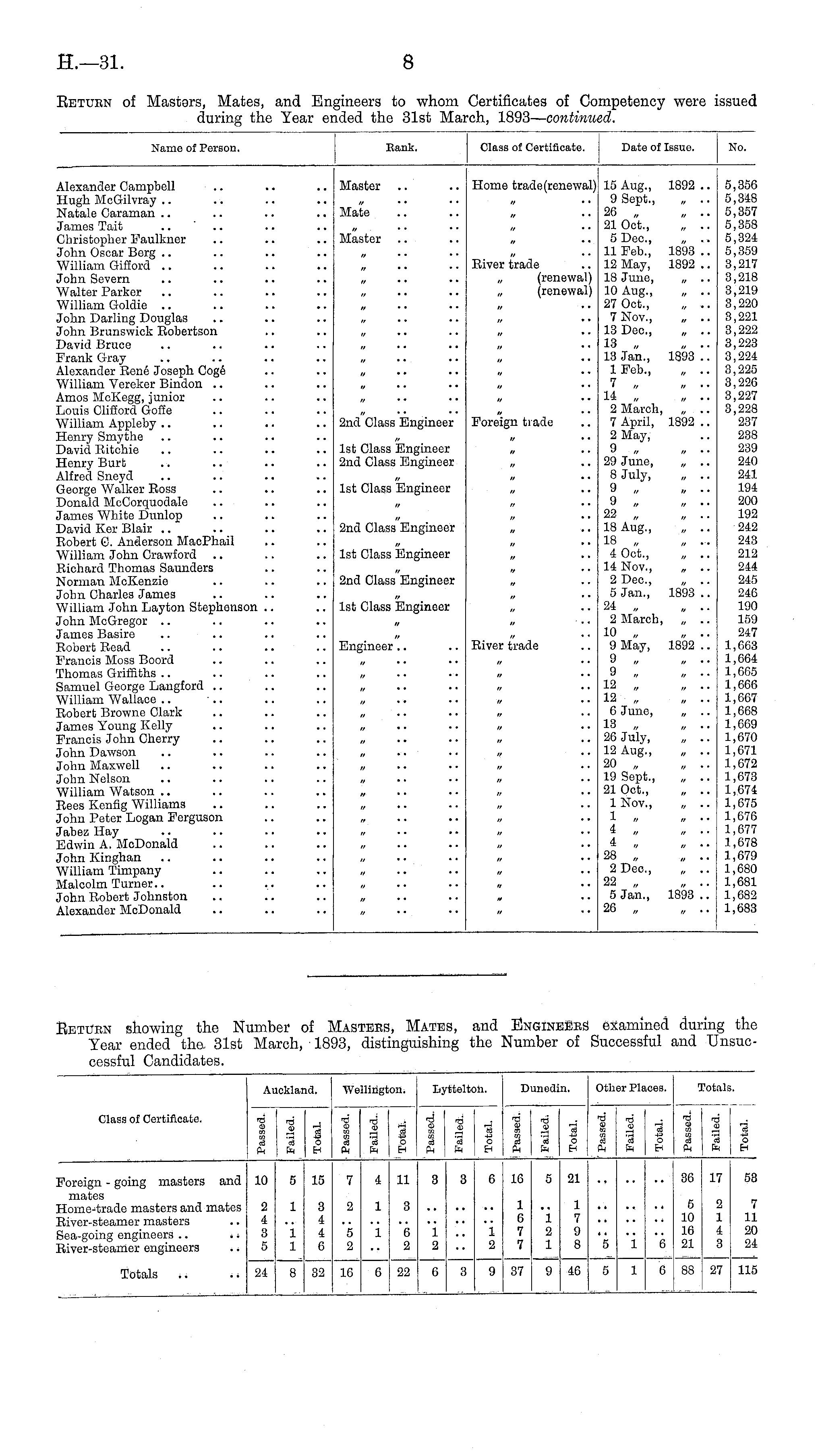 Return of Masters, Mates, and Engineers to whom Certificates of Competency were issued during the Year ended the 31st March, 1893— continued.