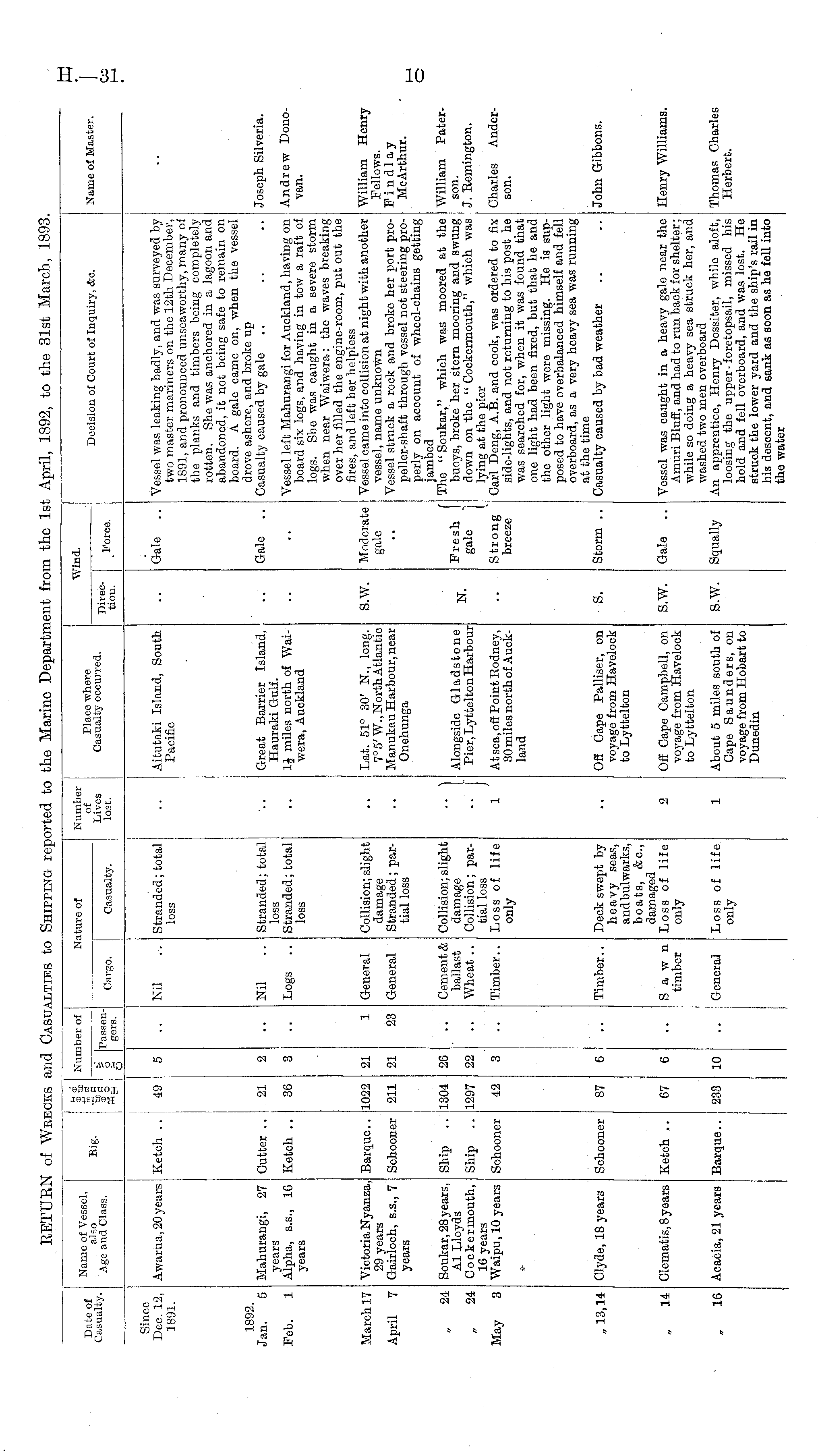 Name of Vessel, also Age and Class. Big. j o §3 Number of Nature of Number of Lives lost. 'ind. Date of Casualty. Place where Casualty occurred. Direction. Decision of Court of Inquiry, &c. Name of Master. ~r 2 Passen<g gers. Cargo. Casualty. Force. Since Dec. 12, 1891. Awarua, 20 years Ketch .. 49 Nil Stranded; total loss Aitutaki Island, South Pacific Gale Vessel was leaking badly, and was surveyea by two master mariners on the 12th December, 1891, and pronounced unseaworthy, many of the planks and timbers being completely rotten. She was anchored in a lagoon and abandoned, it not being safe to remain on board. A gale came on, when the vessel drove ashore, and broke up Casualty caused by gale Mahurangi, 27 years Alpha, s.s., 16 years Stranded; total loss Stranded; total loss Great Barrier Island, Hauraki Gulf. 1J miles north of Waiwera, Aucklana Joseph Silveria. 1892. Jan. 5 Cutter . . 21 o Nil Gale Feb. 1 March 17 April 7 24 Victoria Ny anza, 29 years Gairloch, s.s., 7 years Soukar, 28 years, AI Lloyds Cockerrnouth, 16 years Waipu, 10 years Ketch .. Barque.. Schooner Ship .. 1022 211 1304 36 21 21 26 3 1 23 Logs General General Cement & ballast Wheat .. Collision; slight damage Stranded; partial loss Collision; slight damage Collision; partial loss Loss of life only Lat. 51° 30' N., long. 7° 5'W., North Atlantic Manukau Harbour, near Onehunga Alongside Gladstone Pier, Lyttelton Harbour s.w. Moderate gale Fresh | gale j Vessel left Mahurangi for Auckland, having on board six logs, and having in tow a raft of logs. She was caught in a severe storm when near Waiwera: the waves breaking over her filled the engine-room, put out the fires, and left her helpless Vessel came into collision at night with another vessel, name unknown Vessel struck a rock and broke her port pro-peller-shaft through vessel not steering properly on account of wheel-chains getting jambed The "Soukar," which was moored at the buoys, broke her stern mooring and swung down on the " Cockerrnouth," which was lying at the pier Carl Deng, A.B. and cook, was ordered to fix side-lights, and not returning to his post he was searched for, when it was found that one light had been fixed, but that he and the other light were missing. He is supposed to have overbalanced himself and fell overboard, as a very heavy sea was running at the time Casualty caused by bad weather Andrew Donovan. William Henry Fellows. F i n dlay McArthur. William Pater24 Ship .. 1297 22 N. son. J. Bemington. May 3 Schooner 42 3 Timber.. 1 At sea, off Point Bodney, 30 miles north of Auckland Strong breeze Charles Anderson. • Clyde, 18 years Off Cape Palliser, on voyage from Havelock to Lyttelton John Gibbons. „ 13,14 Schooner S7 Timber.. Deck swept by heavy seas, and bulwarks, boats, &c, damaged Loss of life only ■ S. Storm .. tt 14 Clematis, 8 years Ketch .. 67 Sawn timber 2 Off Cape Campbell, on voyage from Havelock to Lyttelton s.w. Gale .. Vessel was caught in a heavy gale near the Amuri Bluff, and had to run back for shelter; while so doing a heavy sea struck her, and washed two men overboard An apprentice, Henry Dossiter, while aloft, loosing the upper -fore topsail, missed his hold and fell overboard, and was lost. He struck the lower yard and the ship's rail in his descent, and sank as soon as he fell into the water Henry Williams. » 16 Acacia, 21 years Barque.. General Loss of life only 1 About 5 miles south of Cape Saunders, on voyage from Hobart to Dunedin s.w. Squally Thomas Charles Herbert. 233 10
