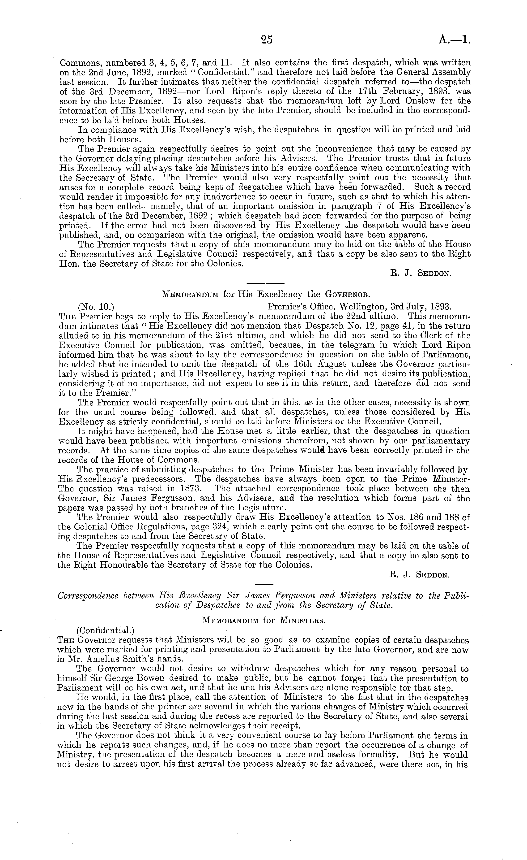 Memoeandum for His Excellency the Governor. (No. 10.) Premier's Office, Wellington, 3rd July, 1893. The Premier begs to reply to His Excellency's memorandum of the 22nd ultimo. This memorandum intimates that " His Excellency did not mention that Despatch No. 12, page 41, in the return alluded to in his memorandum of the 21st ultimo, and which he did not send to the Clerk of the Executive Council for publication, was omitted, because, in the telegram in which Lord Bipon informed him that he was about to lay the correspondence in question on the table of Parliament, he added that he intended to omit the despatch of the 16th August unless the Governor particularly wished it printed ; and His Excellency, having replied that he did not desire its publication, considering it of no importance, did not expect to see it in this return, and therefore did not send it to the Premier." The Premier would respectfully point out that in this, as in the other cases, necessity is shown for the usual course being followed, and that all despatches, unless those considered by His Excellency as strictly confidential, should be laid before Ministers or the Executive Council. It might have happened, had the House met a little earlier, that the despatches in question would have been published with important omissions therefrom, not shown by our parliamentary records. At the same time copies of the same despatches would have been correctly printed in the records of the House of Commons. The practice of submitting despatches to the Prime Minister has been invariably followed by His Excellency's predecessors. The despatches have always been open to the Prime MinisterThe question Was raised in 1873. The attached correspondence took place between the then Governor, Sir James Fergusson, and his Advisers, and the resolution which forms part of the papers was passed by both branches of the Legislature. The Premier would also respectfully draw His Excellency's attention to Nos. 186 and 188 of the Colonial Office Begulations, page 324, which clearly point out the course to be followed respecting despatches to and from the Secretary of State. The Premier respectfully requests that a copy of this memorandum may be laid on the table of the House of Bepresentatives and Legislative Council respectively, and that a copy be also sent to the Bight Honourable the Secretary of State for the Colonies. B. J. Seddon.