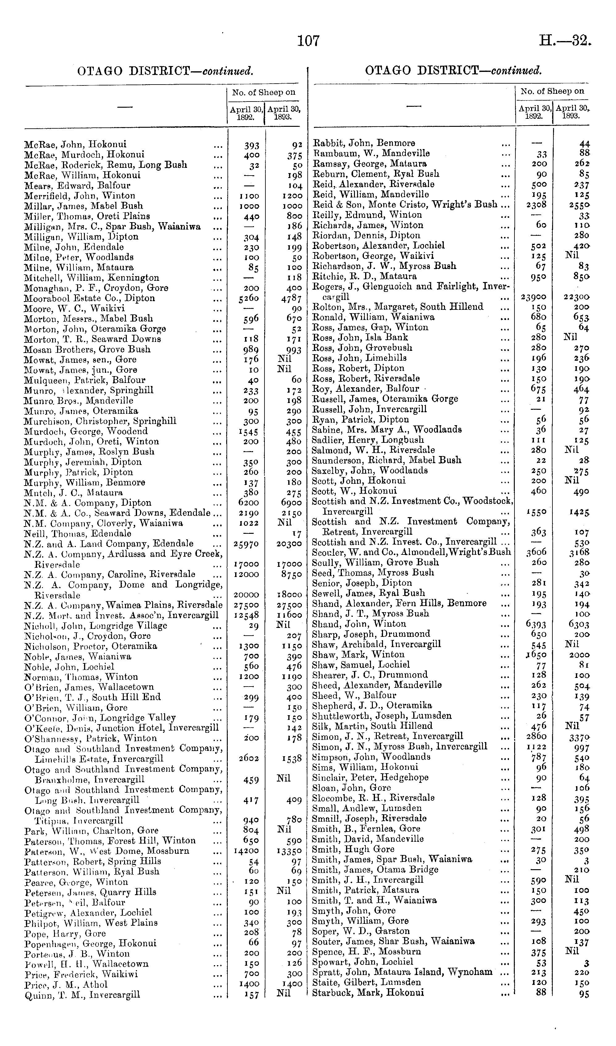 No. of Sheep on April 30, April 30, 1892. 1893. McRae, John, Hokonui McRae, Murdoch, Hokonui McRae, Roderick, Remu, Long Bush McRae, William, Hokonui Mears, Edward, Balfour Merrifield, John, Winton Millar, James, Mabel Bush Miller, Thomas, Oreti Plains Milligan, Mrs. C, Spar Bush, Waianiwa Milligan, William, Dipton Milne, John, Edendale Milne, Peter, Woodlands Milne, William, Mataura Mitchell, William, Kennington Monaghan, P. F., Croydon, Gore Moorabool Estate Co., Dipton Moore, W. C, Waikivi Morton, Messrs., Mabel Bush Morton, John, Oteramika Gorge Morton, T. R., Seaward Downs Mosan Brothers, Grove B ush Mowat, James, sen., Gore Mowat, James, jun., Gore Mulqueen, Patrick, Balfour Munro, I lexander, SpringhiU Munro. Bros., Mandeville Munro, James, Oteramika Murehison. Christopher, Springhill Murdoch, George, Woodend Murdoch, John, Oreti, Winton Murphy, James, Roslyn Bush Murphy, Jeremiah, Dipton Murphy, Patrick, Dipton Murphy, William, Benmore Mutch, J. C, Mataura N.M. & A. Company, Dipton N.M. & A. Co., Seaward Downs, Edendale ... N.M. Company, Cloverly, Waianiwa Neill, Thomas, Edendale N.Z. and A. Land Company, Edendale N.Z. A. Company, Ardlussa and Eyre Creek, Riversdale N.Z. A. Company, Caroline, Riversdale N.Z. A. Company, Dome and Longridge, Riversdale N.Z. A. Company, Waimea Plains, Riversdale N.Z. Murt. and Invest. Assoc'n, Invercargill Nieholl, John, Longridge Village Nicholson, J., Croydon, Gore Nicholson, Proctor, Oteramika Noble, James, Waianiwa Noble, John, Loehiel Norman, Thomas, Winton O'iSrien, James, Wallacetown O'Krien, T. J., South Hill End O'Brien, William, Gore O'Connor, Join, Longridge Valley O'Keefe, Denis, Junction Hotel, Invercargill O'Shannessy, Patrick, Winton Otago and Southland Investment Company, Limehills Estate, Invercargill Otago and Southland Investment Company, Branxholme, Invercargill Otago anil Southland Investment Company, Long Busb. Invercargill Otago and Southland Investment Company, Titipua, Invercargill Park, William, Charlton, Gore Paterson, Thomas, Forest Hill, Winton Paterson, W., vVest Dome, Mossburn Patterson, Robert, Spring Hills Patterson, William, Ryal Bush Pearee, George, Winton Petersen, James, Quarry Hills Petersen, "eil, Balfour Petigrew, Alexander, Loehiel Philpot, William, West Plains Pope, Harry, Gore Popenhageii, George, Hokonui PorteoUB, J. B., Winton Powell, tl. IT, Wallacetown Price, Frederick, Waikiwi Price, J. M., Athol Quinn, T. M., Invercargill 393 400 32 I IOO IOOO 44° 304 230 100 1 S 200 5260 596 n8 989 176 10 40 233 200 95 300 •545 200 350 260 •37 380 6200 2190 1022 25970 17000 12000 92 375 5° 198 104 1200 IOOO 800 186 148 •99 5° IOO 118 400 4787 90 670 52 171 993 Nil Nil 60 172 198 290 300 455 480 200 300 200 180 275 6900 2150 Nil •7 20300 17000 875° 20000 27500 12548 29 18000 27500 11600 Nil 207 1150 39° 476 1190 300 400 150 •5° 142 178 1300 700 560 1200 299 '79 200 2602 1538 459 Nil 4'7 409 94° 804 650 14200 780 Nil 59° •335° 97 69 '5° Nil 54 60 120 •5' 90 100 34o 208 66 200 100 '93 300 78 97 200 126 '5° 700 1400 •57 300 1400 Nil