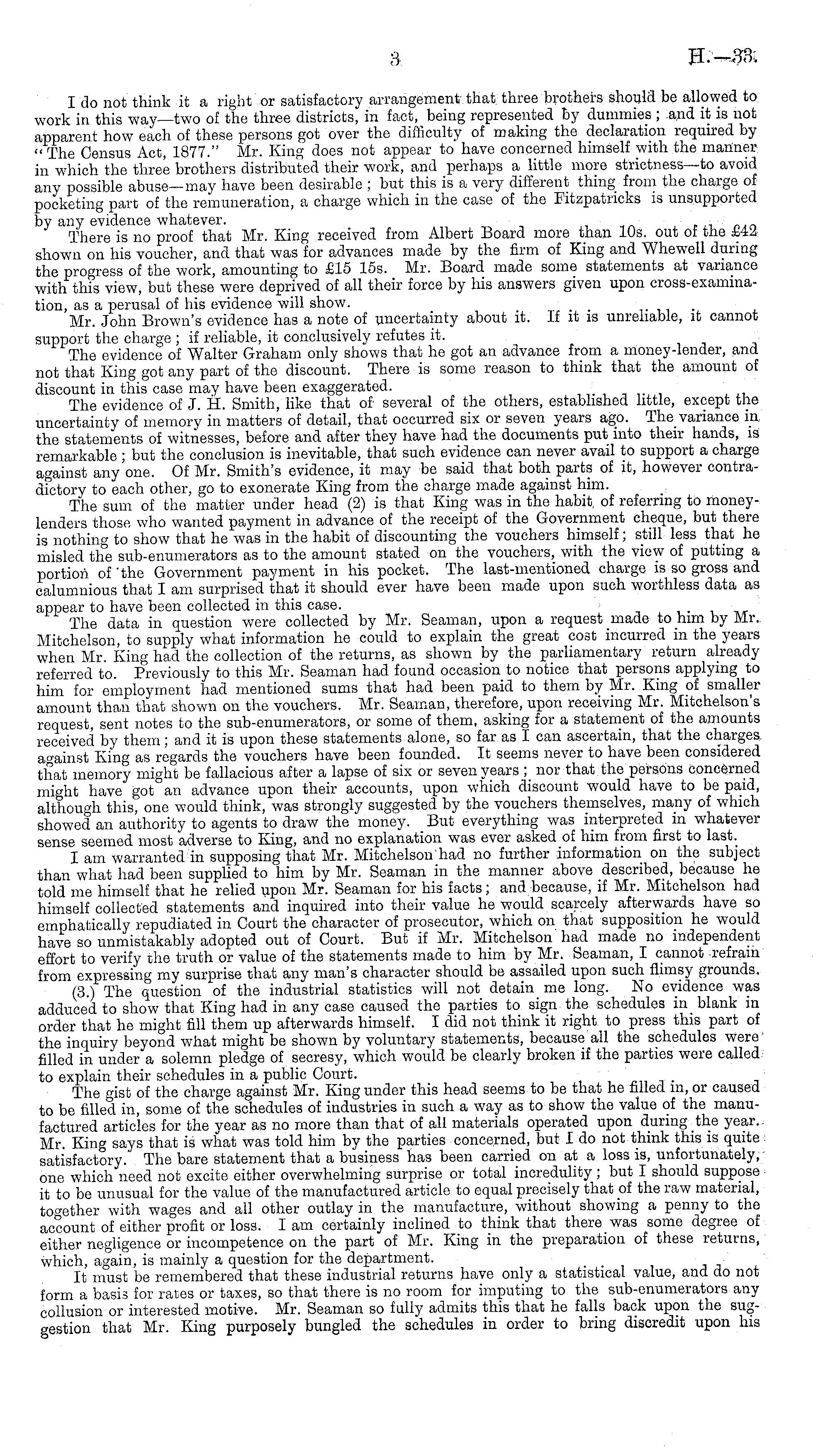 I do not think it a right or satisfactory arrangement that three brothers should be allowed to work in this way—two of the three districts, in fact, being represented by dummies; and it is not apparent how each of these persons got over the difficulty of making the declaration required by "The Census Act, 1877." Mr. King does not appear to have concerned himself with the manner in which the three brothers distributed their work, and perhaps a little more strictness—to avoid any possible abuse—may have been desirable ; but this is a very different thing from the charge of pocketing part of the remuneration, a charge which in the case of the Fitzpatricks is unsupported by any evidence whatever. There is no proof that Mr. King received from Albert Board more than 10s. out ot the LiA shown on his voucher, and that was for advances made by the firm of King and Whewell during the progress of the work, amounting to £15 15s. Mr. Board made some statements at variance with this view, but these were deprived of all their force by his answers given upon cross-examina-tion, as a perusal of his evidence will show. Mr. John Brown's evidence has a note of uncertainty about it. If it is unreliable, it cannot support the charge ; if reliable, it conclusively refutes it. The evidence of Walter Graham only shows that he got an advance from a money-lender, and not that King got any part of the discount. There is some reason to think that the amount of discount in this case may have been exaggerated. The evidence of J. H. Smith, like that of several of the others, established little, except the uncertainty of memory in matters of detail, that occurred six or seven years ago. The variance m the statements of witnesses, before and after they have had the documents put into their hands, is remarkable ; but the conclusion is inevitable, that such evidence can never avail to support a charge against any one. Of Mr. Smith's evidence, it may be said that both parts of it, however contradictory to each other, go to exonerate King from the charge made against him. The sum of the matter under head (2) is that King was in the habit of referring to moneylenders those who wanted payment in advance of the receipt of the Government cheque, but there is nothing to show that he was in the habit of discounting the vouchers himself; still less that he misled the sub-enumerators as to the amount stated on the vouchers, with the view of putting a portion of 'the Government payment in his pocket. The last-mentioned charge is so gross and calumnious that I am surprised that it should ever have been made upon such worthless data as appear to have been collected in this case. . The data in question were collected by Mr. Seaman, upon a request made to him by Mr. Mitchelson, to supply what information he could to explain the great cost incurred m the years when Mr. King had the collection of the returns, as shown by the parliamentary return already referred to. Previously to this Mr. Seaman had found occasion to notice that persons applying to him for employment had mentioned sums that had been paid to them by Mr. King of smaller amount than that shown on the vouchers. Mr. Seaman, therefore, upon receiving Mr. Mitchelson's request, sent notes to the sub-enumerators, or some of them, asking for a statement of the amounts received by them; and it is upon these statements alone, so far as I can ascertain, that the charges against King as regards the vouchers have been founded. It seems never to have been considered that memory might be fallacious after a lapse of six or seven years ; nor that the persons concerned might have got an advance upon their accounts, upon which discount would have to be paid, although this, one would think, was strongly suggested by the vouchers themselves, many of which showed an authority to agents to draw the money. But everything was interpreted in whatever sense seemed most adverse to King, and no explanation was ever asked of him from first to last. I am warranted in supposing that Mr. Mitchelson had no further information on the subject than what had been supplied to him by Mr. Seaman in the manner above described, because he told me himself that he relied upon Mr. Seaman for his facts; and because, if Mr. Mitchelson had himself collected statements and inquired into their value he would scarcely afterwards have so emphatically repudiated in Court the character of prosecutor, which on that supposition he would have so unmistakably adopted out of Court. But if Mr. Mitchelson had made no independent effort to verify the truth or value of the statements made to him by Mr. Seaman, I cannot refrain from expressing my surprise that any man's character should be assailed upon such flimsy grounds. (3.) The question of the industrial statistics will not detain me long. No evidence was adduced to show that King had in any case caused the parties to sign the schedules in blank in order that he might fill them up afterwards himself. I did not think it right to press this part of the inquiry beyond what might be shown by voluntary statements, because all the schedules were filled in under a solemn pledge of secresy, which would be clearly broken if the parties were called to explain their schedules in a public Court. The gist of the charge against Mr. King under this head seems to be that he filled m, or caused to be filled in, some of the schedules of industries in such a way as to show the value of the manufactured articles for the year as no more than that of all materials operated upon during the year. Mr. King says that is what was told him by the parties concerned, but I do not think this is quite satisfactory. The bare statement that a business has been carried on at a loss is, unfortunately, one which need not excite either overwhelming surprise or total incredulity ; but I should suppose it to be unusual for the value of the manufactured article to equal precisely that of the raw material, together wi