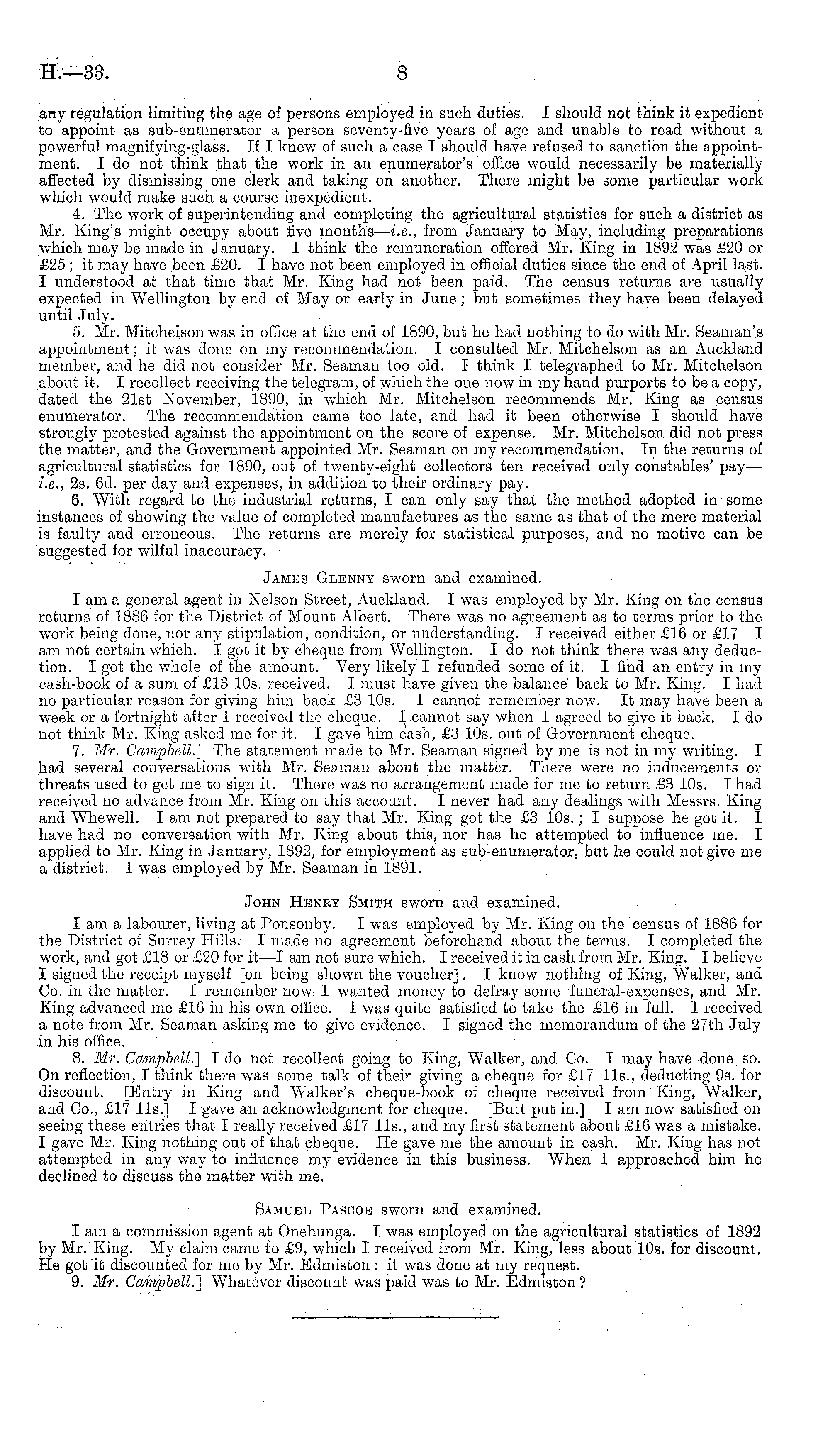 any regulation limiting the age of persons employed in such duties. I should not think it expedient to appoint as sub-enumerator a person seventy-five years of age and unable to read without a powerful magnifying-glass. If I knew of such a case I should have refused to sanction the appointment. I do not think that the work in an enumerator's office would necessarily be materially affected by dismissing one clerk and taking on another. There might be some particular work which would make such a course inexpedient. 4. The work of superintending and completing the agricultural statistics for such a district as Mr. King's might occupy about five months— i.e., from January to May, including preparations which may be made in January. I think the remuneration offered Mr. King in 1892 was £20 or £25 ; it may have been £20. I have not been employed in official duties since the end of April last. I understood at that time that Mr. King had not been paid. The census returns are usually expected in Wellington by end of May or early in June ; but sometimes they have been delayed until July. 5. Mr. Mitchelson was in office at the end of 1890, but he had nothing to do with Mr. Seaman's appointment; it was done on my recommendation. I consulted Mr. Mitchelson as an Auckland member, and he did not consider Mr. Seaman too old. I think I telegraphed to Mr. Mitchelson about it. I recollect receiving the telegram, of which the one now in my hand purports to be a copy, dated the 21st November, 1890, in which Mr. Mitchelson recommends Mr. King as census enumerator. The recommendation came too late, and had it been otherwise I should have strongly protested against the appointment on the score of expense. Mr. Mitchelson did not press the matter, and the Government appointed Mr. Seaman on my recommendation. In the returns of agricultural statistics for 1890, out of twenty-eight collectors ten received only constables' pay— i.e., 2s. 6d. per day and expenses, in addition to their ordinary pay. 6. With regard to the industrial returns, I can only say that the method adopted in some instances of showing the value of completed manufactures as the same as that of the mere material is faulty and erroneous. The returns are merely for statistical purposes, and no motive can be suggested for wilful inaccuracy. James Glenny sworn and examined. lam a general agent in Nelson Street, Auckland. I was employed by Mr. King on the census returns of 1886 for the District of Mount Albert. There was no agreement as to terms prior to the work being done, nor any stipulation, condition, or understanding. I received either £16 or £17—I am not certain which. I got it by cheque from Wellington. I do not think there was any deduction. I got the whole of the amount. Very likely I refunded some of it. I find an entry in my cash-book of a sum of £13 10s. received. I must have given the balance back to Mr. King. I had no particular reason for giving him back £3 10s. I cannot remember now. It may have been a week or a fortnight after I received the cheque. 1 cannot say when I agreed to give it back. Ido not think Mr. King asked me for it. I gave him cash, £3 10s. out of Government cheque. 7. Mr. Campbell.'] The statement made to Mr. Seaman signed by me is not in my writing. I had several conversations with Mr. Seaman about the matter. There were no inducements or threats used to get me to sign it. There was no arrangement made for me to return £3 10s. I had received no advance from Mr. King on this account. I never had any dealings with Messrs. King and Whewell. lam not prepared to say that Mr. King got the £3 10s.; I suppose he got it. I have had no conversation with Mr. King about this, nor has he attempted to influence me. I applied to Mr. King in January, 1892, for employment as sub-enumerator, but he could not give me a district. I was employed by Mr. Seaman in 1891. John Heney Smith sworn and examined. lam a labourer, living at Ponsonby. I was employed by Mr. King on the census of 1886 for the District of Surrey Hills. I made no agreement beforehand about the terms. I completed the work, and got £18 or £20 for it—l am not sure which. I received it in cash from Mr. King. I believe I signed the receipt myself [on being shown the voucher]. I know nothing of King, Walker, and Co. in the matter. I remember now I wanted money to defray some funeral-expenses, and Mr. King advanced me £16 in his own office. I was quite satisfied to take the £16 in full. I received a note from Mr. Seaman asking me to give evidence. I signed the memorandum of the 27th July in his office. 8. Mr. Campbell.] Ido not recollect going to King, Walker, and Co. I may have done so. On reflection, I think there was some talk of their giving a cheque for £17 11s., deducting 9s. for discount. [Entry in King and Walker's cheque-book of cheque received from King, Walker, and Co., £17 11s.] I gave an acknowledgment for cheque. [Butt put in.] lam now satisfied on seeing these entries that I really received £17 11s., and my first statement about £16 was a mistake. I gave Mr. King nothing out of that cheque. Pie gave me the amount in cash. Mr. King has not attempted in any way to influence my evidence in this business. When I approached him he declined to discuss the matter with me. Samuel Pasooe sworn and examined. lam a commission agent at Onehunga. I was employed on the agricultural statistics of 1892 by Mr. King. My claim came to £9, which I received from Mr. King, less about 10s. for discount. He got it discounted for me by Mr. Edmiston : it was done at my request. 9. Mr. Campbell.'] Whatever discount was paid was to Mr. Edmiston ?