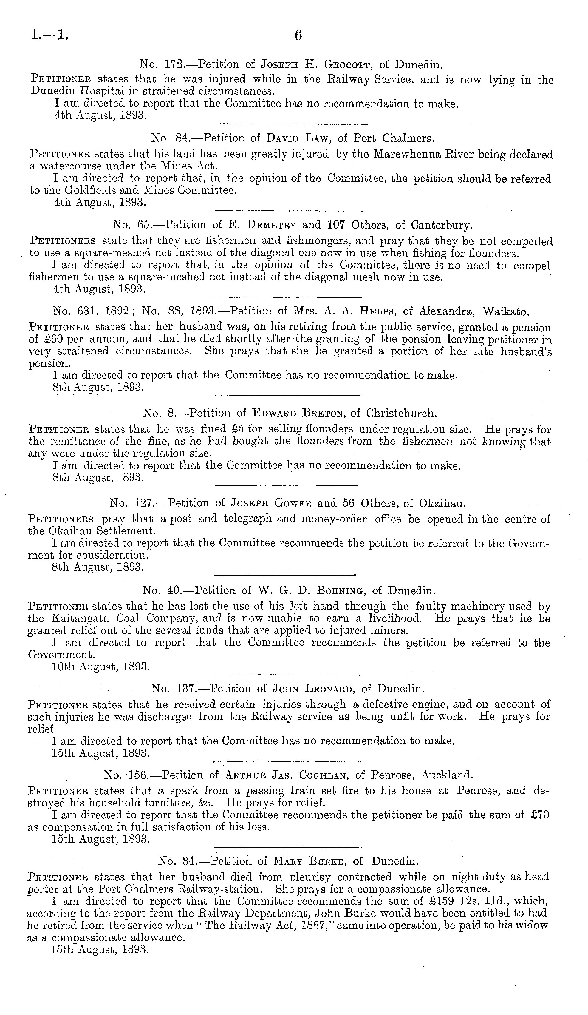 No. 172. —Petition of Joseph H. Geocott, of Dunedin. Petitioner states that he was injured while in the Railway Service, and is now lying in the Duuedin Hospital in straitened circumstances. I am directed to report that the Committee has no recommendation to make. 4th August, 1893.