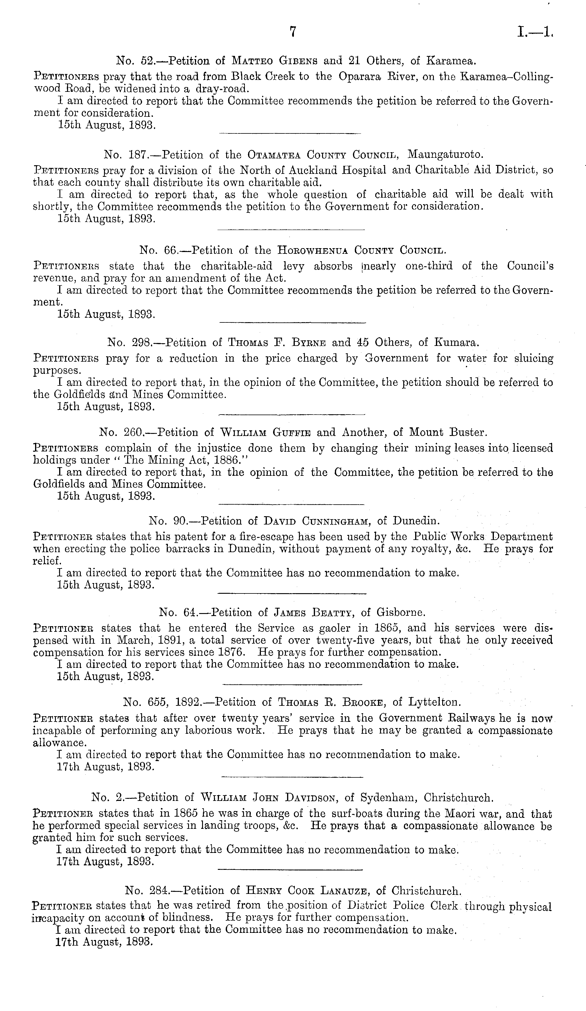 No. 298.—Petition of Thomas F. Byrne and 45 Others, of Kumara. Petitioners pray for a reduction in the price charged by Government for water for sluicing purposes. I am directed to report that, in the opinion of the Committee, the petition should be referred to the Goldfields and Mines Committee. 15th August, 1893.