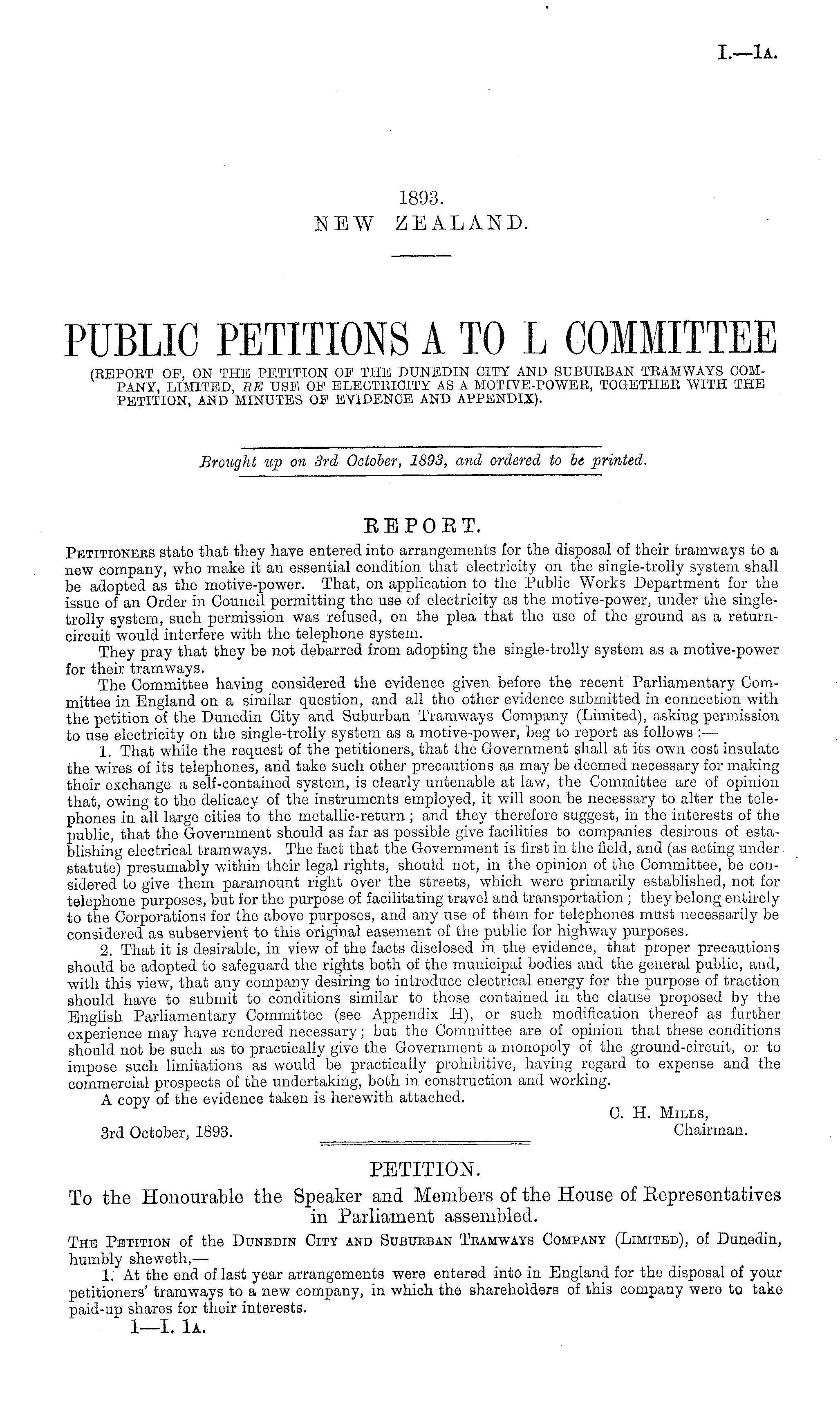 PUBLIC PETITIONS A TO L COMMITTEE (REPORT OF, ON THE PETITION OF THE DUNEDIN CITY AND SUBURBAN TRAMWAYS COMPANY, LIMITED, RE USE OF ELECTRICITY AS A MOTIVE-POWER, TOGETHER WITH THE PETITION, AND MINUTES OF EVIDENCE AND APPENDIX).