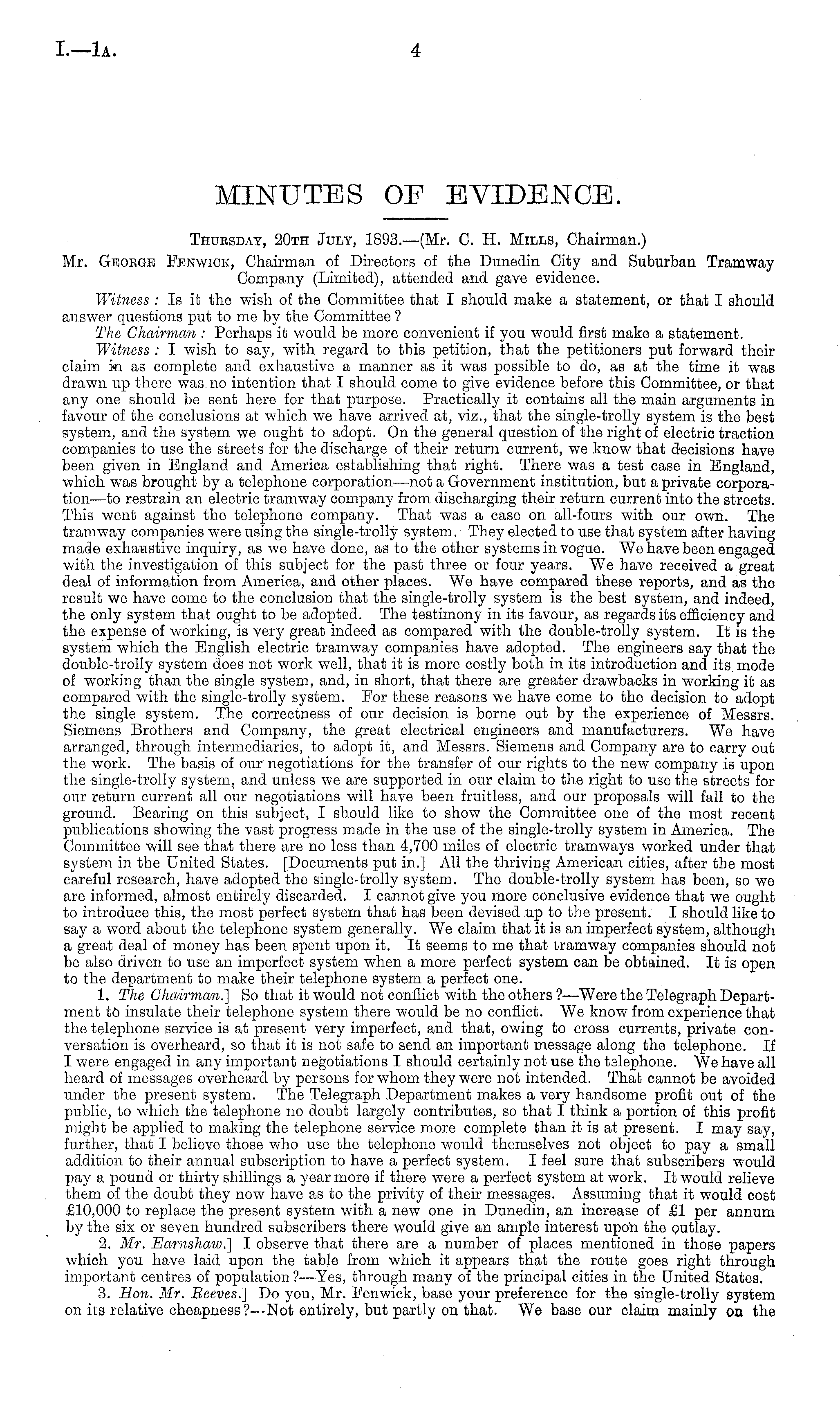Thursday, 20th July, 1893.—(Mr. C. H. Mills, Chairman.) Mr. George Fenwick, Chairman of Directors of the Dunedin City and Suburban Tramway Company (Limited), attended and gavo evidence. Witness : Is it the wish of the Committee that I should make a statement, or that I should answer questions put to me by the Committee ? The Chairman : Perhaps it would be more convenient if you would first make a statement. Witness : I wish to say, with regard to this petition, that the petitioners put forward their claim ki as complete and exhaustive a manner as it was possible to do, as at the time it was drawn up there was. no intention that I should come to give evidence before this Committee, or that any one should be sent here for that purpose. Practically it contains all the main arguments in favour of the conclusions at which we have arrived at, viz., that the single-trolly system is the best system, and the system we ought to adopt. On the general question of the right of electric traction companies to use the streets for the discharge of their return current, wo know that decisions have been given in England and America establishing that right. There was a test case in England, which was brought by a telephone corporation—not a Government institution, but a private corporation—to restrain an electric tramway company from discharging their return current into the streets. This went against the telephone company. That was a case on all-fours with our own. The tramway companies were using the single-trolly system. They elected to use that system after having made exhaustive inquiry, as we have done, as to the other systems in vogue. We have been engaged with the investigation of this subject for the past three or four years. We have received a great deal of information from America, and other places. We have compared these reports, and as tho result we have come to the conclusion that the single-trolly system is the best system, and indeed, the only system that ought to be adopted. The testimony in its favour, as regards its efficiency and the expense of working, is very great indeed as compared with the double-trolly system. It is the system which the English electric tramway companies have adopted. The engineers say that the double-trolly system does not work well, that it is more costly both in its introduction and its mode of working than the single system, and, in short, that there are greater drawbacks in working it as compared with the single-trolly system. For these reasons we have come to the decision to adopt the single system. The correctness of our decision is borne out by the experience of Messrs. Siemens Brothers and Company, the great electrical engineers and manufacturers. We have arranged, through intermediaries, to adopt it, and Messrs. Siemens and Company are to carry out the work. The basis of our negotiations for the transfer of our rights to the new company is upon the single-trolly system, and unless we are supported in our claim to the right to use the streets for our return current all our negotiations will have been fruitless, and our proposals will fall to the ground. Bearing on this subject, I should like to show the Committee one of the most recent publications showing the vast progress made in the use of the single-trolly system in America. The Committee will see that there are no less than 4,700 miles of electric tramways worked under that system in the United States. [Documents put in.] All the thriving American cities, after the most careful research, have adopted the single-trolly system. The double-trolly system has been, so we are informed, almost entirely discarded. I cannot give you more conclusive evidence that we ought to introduce this, the most perfect system that has been devised up to the present. I should like to say a word about the telephone system generally. We claim that it is an imperfect system, although a great deal of money has been spent upon it. It seems to me that tramway companies should not be also driven to use an imperfect system when a more perfect system can be obtained. It is open to the department to make their telephone system a perfect one. 1. The Chairman.] So that it would not conflict with the others?— Were the Telegraph Department to insulate their telephone system there would be no conflict. We know from experience that the telephone service is at present very imperfect, and that, owing to cross currents, private conversation is overheard, so that it is not safe to send an important message along the telephone. If I were engaged in any important negotiations I should certainly not use the talephone. We have all heard of messages overheard by persons for whom they were not intended. That cannot be avoided under the present system. The Telegraph Department makes a very handsome profit out of the public, to which the telephone no doubt largely contributes, so that I think a portion of this profit might be applied to making the telephone service more complete than it is at present. I may say, further, that I believe those who use the telephone would themselves not object to pay a small addition to their annual subscription to have a perfect system. I feel sure that subscribers would pay a pound or thirty shillings a year more if there were a perfect system at work. It would relieve them of the doubt they now have as to the privity of their messages. Assuming that it would cost £10,000 to replace the present system with a new one in Dunedin, an increase of £1 per annum by the six or seven hundred subscribers there would give an ample interest upon the outlay. 2. Mr. Eamshaw.] I observe that there are a number of places mentioned in those papers which you have laid upon the table from which it appears that tho route goes right through important centres of population ? —Yes, through many of the principal cities in the United States. 3. Eon. Mr. Beeves.] Do you, Mr. Fenwick, base your preference for the single-trolly system