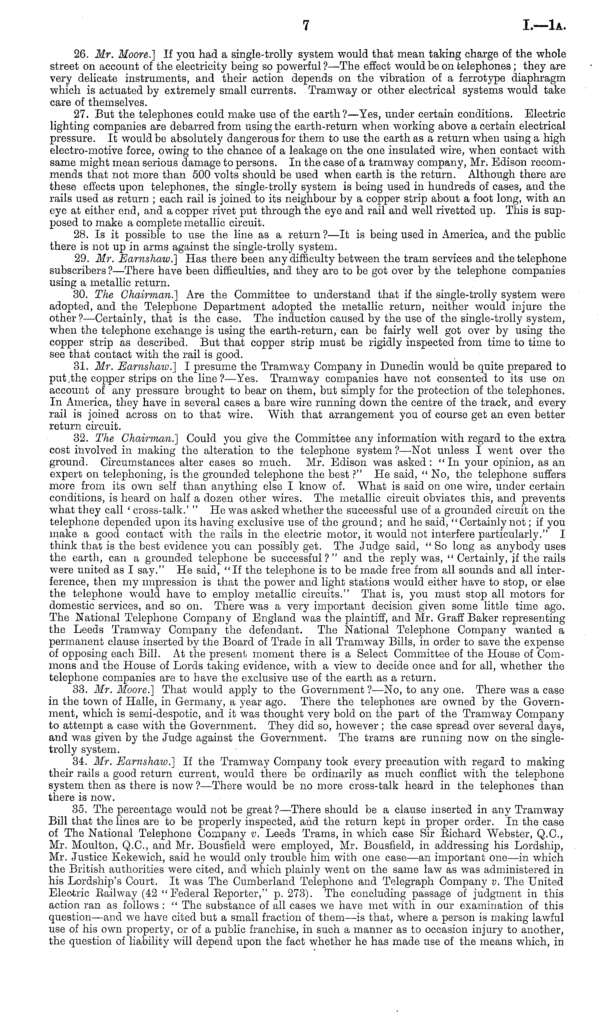 26. Mr. Moore.] If you had a single-trolly system would that mean taking charge of the whole street on account of the electricity being so powerful ? —The effect would be on telephones; they are very delicate instruments, and their action depends on the vibration of a ferrotype diaphragm which is actuated by extremely small currents. Tramway or other electrical systems would take care of themselves. 27. But the telephones could make use of the earth?— Yes, under certain conditions. Electric lighting companies are debarred from using the earth-return when working above a certain electrical pressure. It would be absolutely dangerous for them to use the earth as a return when using a high electro-motive force, owing to the chance of a leakage on the one insulated wire, when contact with same might mean serious damage to persons. In the case of a tramway company, Mr. Edison recommends that not more than 500 volts should be used when earth is the return. Although there are these effects upon telephones, the single-trolly system is being used in hundreds of cases, and the rails used as return ; each rail is joined to its neighbour by a copper strip about a foot long, with an eye at either end, and a copper rivet put through the eye and rail and well rivetted up. This is supposed to make a complete metallic circuit. 28. Is it possible to use the line as a return ?—lt is being used in America, and the public there is not up in arms against the single-trolly system. 29. Mr. Earnshaw.] Has there been any difficulty between the tram services and the telephone subscribers ?—There have been difficulties, and they are to be got over by the telephone companies using a metallic return. 30. The Chairman.] Are the Committee to understand that if the single-trolly system were adopted, and the Telephone Department adopted the metallic return, neither would injure the other ? —Certainly, that is the case. The induction caused by the use of the single-trolly system, when the telephone exchange is using the earth-return, can be fairly well got over by using the copper strip as described. But that copper strip must be rigidly inspected from time to time to see that contact with the rail is good. 31. Mr. Earnshaw.] I presume the Tramway Company in Dunedin would be quite prepared to put .the cop.per strips on the line ? —Yes. Tramway companies have not consented to its use on account of any pressure brought to bear on them, but simply for the protection of the telephones. In America, they have in several cases a bare wire running down the centre of the track, and every rail is joined across on to that wire. With that arrangement you of course get an even better return circuit. 32. The Chairman.] Could you give the Committee any information with regard to the extra cost involved in making the alteration to the telephone system ?—Not unless I went over the ground. Circumstances alter cases so much. Mr. Edison was asked: "In your opinion, as an expert on telephoning, is the grounded telephone the best ?" He said, " No, the telephone suffers more from its own self than anything else I know of. What is said on one wire, under certain conditions, is heard on half a dozen other wires. The metallic circuit obviates this, and prevents what they call ' cross-talk.' " He was asked whether the successful use of a grounded circuit on the telephone depended upon its having exclusive use of the ground; and he said,'' Certainly not; if you make a good contact with the rails in the electric motor, it would not interfere particularly." I think that is the best evidence you can possibly get. The Judge said, "So long as anybody uses the earth, can a grounded telephone be successful?" and the reply was, "Certainly, if the rails were united as I say." He said, "If the telephone is to be made free from all sounds and all interference, then my impression is that the power and light stations would either have to stop, or else the telephone would have to employ metallic circuits." That is, you must stop all motors for domestic services, and so on. There was a very important decision given some little time ago. The National Telephone Company of England was the plaintiff, and Mr. Graff Baker representing the Leeds Tramway Company the defendant. The National Telephone Company wanted a permanent clause inserted by the Board of Trade in all Tramway Bills, in order to save the expense of opposing each Bill. At the present moment there is a Select Committee of the House of Commons and the House of Lords taking evidence, with a view to decide once and for all, whether the telephone companies are to have the exclusive use of the earth as a return. 33. Mr. Moore.] That would apply to the Government ?—No, to any one. There was a case in the town of Halle, in Germany, a year ago. There the telephones are owned by the Government, which is semi-despotic, and it was thought very bold on the part of the Tramway Company to attempt a case with the Government. They did so, however ; the case spread over several days, and was given by the Judge against the Government. The trams are running now on the singletrolly system. 34. Mr. Earnshaw.] If the Tramway Company took every precaution with regard to making their rails a good return current, would there be ordinarily as much conflict with the telephone system then as there is now ? —There would be no more cross-talk heard in the telephones than there is now. 35. The percentage would not be great?— There should be a clause inserted in any Tramway Bill that the lines are to be properly inspected, aiid the return kept in proper order. In the case of The National Telephone Company v. Leeds Trams, in which case Sir Richard Webster, Q.C., Mr. Moulton, Q.C., and Mr. Bousfield were employed, Mr. Bousfield, in addressing his Lordship, Mr. Justice Kekewich, said he would only trouble him with one case —an important one—in which the British authorities were cited, and which plainly went on the sam