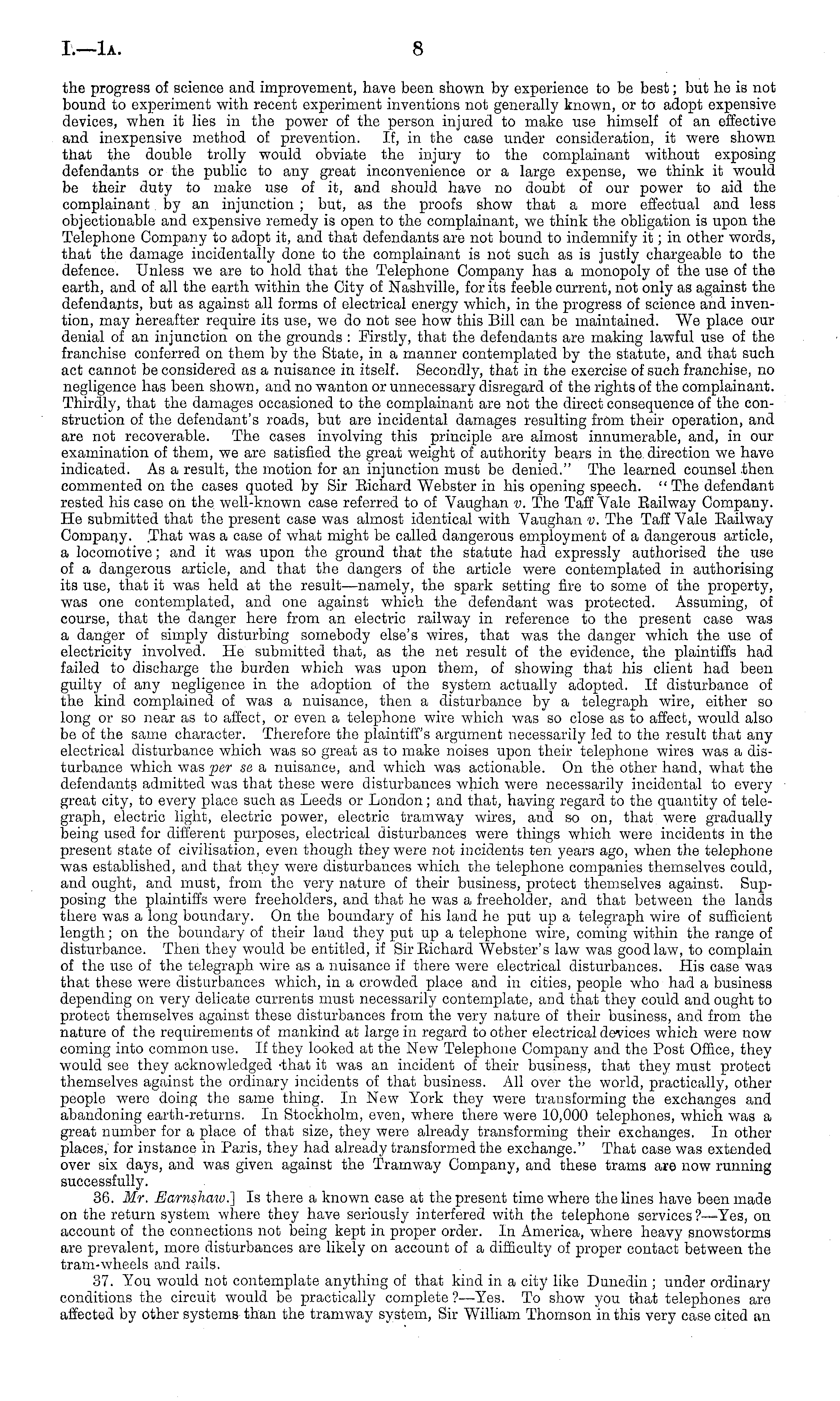the progress of science and improvement, have been shown by experience to be best; but he is not bound to experiment with recent experiment inventions not generally known, or to adopt expensive devices, when it lies in the power of the person injured to make use himself of an effective and inexpensive method of prevention. If, in the case under consideration, it were shown that the double trolly would obviate the injury to the complainant without exposing defendants or the public to any great inconvenience or a large expense, we think it would be their duty to make use of it, and should have no doubt of our power to aid the complainant by an injunction ; but, as the proofs show that a more effectual and less objectionable and expensive remedy is open to the complainant, we think the obligation is upon the Telephone Company to adopt it, and that defendants are not bound to indemnify it; in other words, that the damage incidentally done to the complainant is not such as is justly chargeable to the defence. Unless we are to hold that the Telephone Company has a monopoly of the use of the earth, and of all the earth within the City of Nashville, for its feeble current, not only as against the defendants, but as against all forms of electrical energy which, in the progress of science and invention, may hereafter require its use, we do not see how this Bill can be maintained. Wo place our denial of an injunction on the grounds : Firstly, that the defendants are making lawful use of the franchise conferred on them by the State, in a manner contemplated by the statute, and that such act cannot be considered as a nuisance in itself. Secondly, that in the exercise of such franchise, no negligence has been shown, and no wanton or unnecessary disregard of the rights of the complainant. Thirdly, that the damages occasioned to the complainant are not the direct consequence of the construction of the defendant's roads, but are incidental damages resulting from their operation, and are not recoverable. The cases involving this principle are almost innumerable, and, in our examination of them, we are satisfied the great weight of authority bears in the, direction we have indicated. As a result, the motion for an injunction must be denied." The learned counsel then commented on the cases quoted by Sir Bichard Webster in his opening speech. "The defendant rested his case on the well-known case referred to of Vaughan v. The Taff Vale Railway Company. He submitted that the present case was almost identical with Vaughan v. The Taff Vale Eailway Company. That was a case of what might be called dangerous employment of a dangerous article, a locomotive; and it was upon the ground that the statute had expressly authorised the use of a dangerous article, and that the dangers of the article were contemplated in authorising its use, that it was held at the result—namely, the spark setting fire to some of the property, was one contemplated, and one against which the defendant was protected. Assuming, of course, that the danger here from an electric railway in reference to the present case was a danger of simply disturbing somebody else's wires, that was the danger which the use of electricity involved. He submitted that, as the net result of the evidence, the plaintiffs had failed to discharge the burden which was upon them, of showing that his client had been guilty of any negligence in the adoption of the system actually adopted. If disturbance of the kind complained of was a nuisance, then a disturbance by a telegraph wire, either so long or so near as to affect, or even a telephone wire which was so close as to affect, would also be of the same character. Therefore the plaintiff's argument necessarily led to the result that any electrical disturbance which was so great as to make noises upon their telephone wires was a disturbance which was per sa a nuisance, and which was actionable. On the other hand, what the defendants admitted was that these were disturbances which were necessarily incidental to every great city, to every place such as Leeds or London; and that, having regard to the quantity of telegraph, electric light, electric power, electric tramway wires, and so on, that were gradually being used for different purposes, electrical disturbances were things which were incidents in the present state of civilisation, even though they were not incidents ten years ago, when the telephone was established, and that they were disturbances which the telephone companies themselves could, and ought, and must, from the very nature of their business, protect themselves against. Supposing the plaintiffs were freeholders, and that he was a freeholder, and that between the lands there was a long boundary. On the boundary of his land he put up a telegraph wire of sufficient length; on the boundary of their land they put up a telephone wire, coining within the range of disturbance. Then they would be entitled, if Sir Eichard Webster's law was good law, to complain of the use of the telegraph wire as a nuisance if there were electrical disturbances. His case was that these were disturbances which, in a crowded place and in cities, people who had a business depending on very delicate currents must necessarily contemplate, and that they could and ought to protect themselves against these disturbances from the very nature of their business, and from the nature of the requirements of mankind at large in regard to other electrical devices which were now coming into common use. If they looked at the New Telephone Company and the Post Office, they would see they acknowledged 'that it was an incident of their business, that they must protect themselves against the ordinary incidents of that business. All over the world, practically, other people were doing the same thing. In New York they were transforming the exchanges and abandoning earth-returns. In Stockholm, even, where there were 10,000 telephones, which was a great number