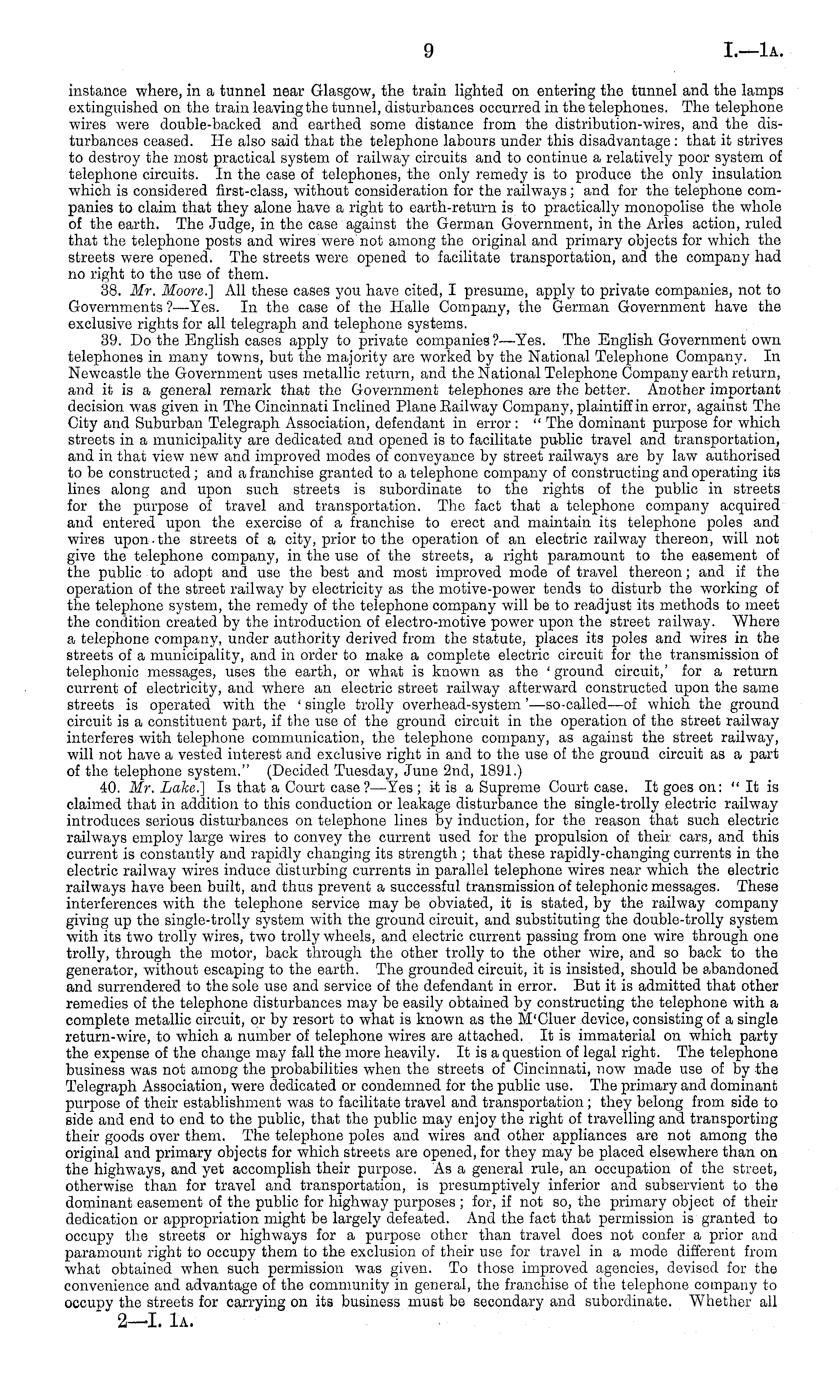 instance where, in a tunnel near Glasgow, the train lighted on entering the tunnel and the lamps extinguished on the train leaving the tunnel, disturbances occurred in the telephones. The telephone wires were double-backed and earthed some distance from the distribution-wires, and the disturbances ceased. He also said that the telephone labours under this disadvantage : that it strives to destroy the most practical system of railway circuits and to continue a relatively poor system of telephone circuits. In the case of telephones, the only remedy is to produce the only insulation which is considered first-class, without consideration for the railways; and for the telephone companies to claim that they alone have a right to earth-return is to practically monopolise the whole of the earth. The Judge, in the case against the German Government, in the Aries action, ruled that the telephone posts and wires were not among the original and primary objects for which the streets were opened. The streets were opened to facilitate transportation, and the company had no right to the use of them. 38. Mr. Moore.] All these cases you have cited, I presume, apply to private companies, not to Governments ? —Yes. In the case of the Halle Company, the German Government have the exclusive rights for all telegraph and telephone systems. 39. Do the English cases apply to private companies ?—Yes. The English Government own telephones in many towns, but the majority are worked by the National Telephone Company. In Newcastle the Government uses metallic return, and the National Telephone Company earth return, and it is a general remark that the Government telephones are the better. Another important decision was given in The Cincinnati Inclined Plane Eailway Company, plaintiff in error, against The City and Suburban Telegraph Association, defendant in error : " The dominant purpose for which streets in a municipality are dedicated and. opened is to facilitate public travel and transportation, and in that view new and improved modes of conveyance by street railways are by law authorised to be constructed; and a franchise granted to a telephone company of constructing and operating its lines along and upon such streets is subordinate to the rights of the public in streets for the purpose of travel and transportation. The fact that a telephone company acquired and entered upon the exercise of a franchise to erect and maintain its telephone poles and wires upon. the streets of a city, prior to the operation of an electric railway thereon, will not give the telephone company, in the use of the streets, a right paramount to the easement of the public to adopt and use the best and most improved mode of travel thereon; and if the operation of the street railway by electricity as the motive-power tends to disturb the working of the telephone system, the remedy of the telephone company will be to readjust its methods to meet the condition created by the introduction of electro-motive power upon the street railway. Where a telephone company, under authority derived from the statute, places its poles and wires in the streets of a municipality, and in order to make a complete electric circuit for the transmission of telephonic messages, uses the earth, or what is known as the ' ground circuit,' for a return current of electricity, and where an electric street railway afterward constructed upon the same streets is operated with the ' single trolly overhead-system ' —so-called —of which the ground circuit is a constituent part, if the use of the ground circuit in the operation of the street railway interferes with telephone communication, the telephone company, as against the street railway, will not have a vested interest and exclusive right in and to the use of the ground circuit as a part of the telephone system." (Decided Tuesday, June 2nd, 1891.) 40. Mr. Lake.} Is that a Court case?— Yes ; it is a Supreme Court case. It goes on: "It is claimed that in addition to this conduction or leakage disturbance the single-trolly electric railway introduces serious disturbances on telephone lines by induction, for the reason that such electric railways employ large wires to convey the current used for the propulsion of their cars, and this current is constantly and rapidly changing its strength ; that these rapidly-changing currents in the electric railway wires induce disturbing currents in parallel telephone wires near which the electric railways have been built, and thus prevent a successful transmission of telephonic messages. These interferences with the telephone service may be obviated, it is stated, by the railway company giving up the single-trolly system with the ground circuit, and substituting the double-trolly system with its two trolly wires, two trolly wheels, and electric current passing from one wire through one trolly, through the motor, back through the other trolly to the other wire, and so back to the generator, without escaping to the earth. The grounded circuit, it is insisted, should be abandoned and surrendered to the sole use and service of the defendant in error. But it is admitted that other remedies of the telephone disturbances may be easily obtained by constructing the telephone with a complete metallic circuit, or by resort to what is known as the M'Cluer device, consisting of a single return-wire, to which a number of telephone wires are attached. It is immaterial on which party the expense of the change may fall the more heavily. It is a question of legal right. The telephone business was not among the probabilities when the streets of Cincinnati, now made use of by the Telegraph Association, were dedicated or condemned for the public use. The primary and dominant purpose of their establishment was to facilitate travel and transportation; they belong from side to side and end to end to the public, that the public may enjoy the right of travelling and transporting their goods over them. The