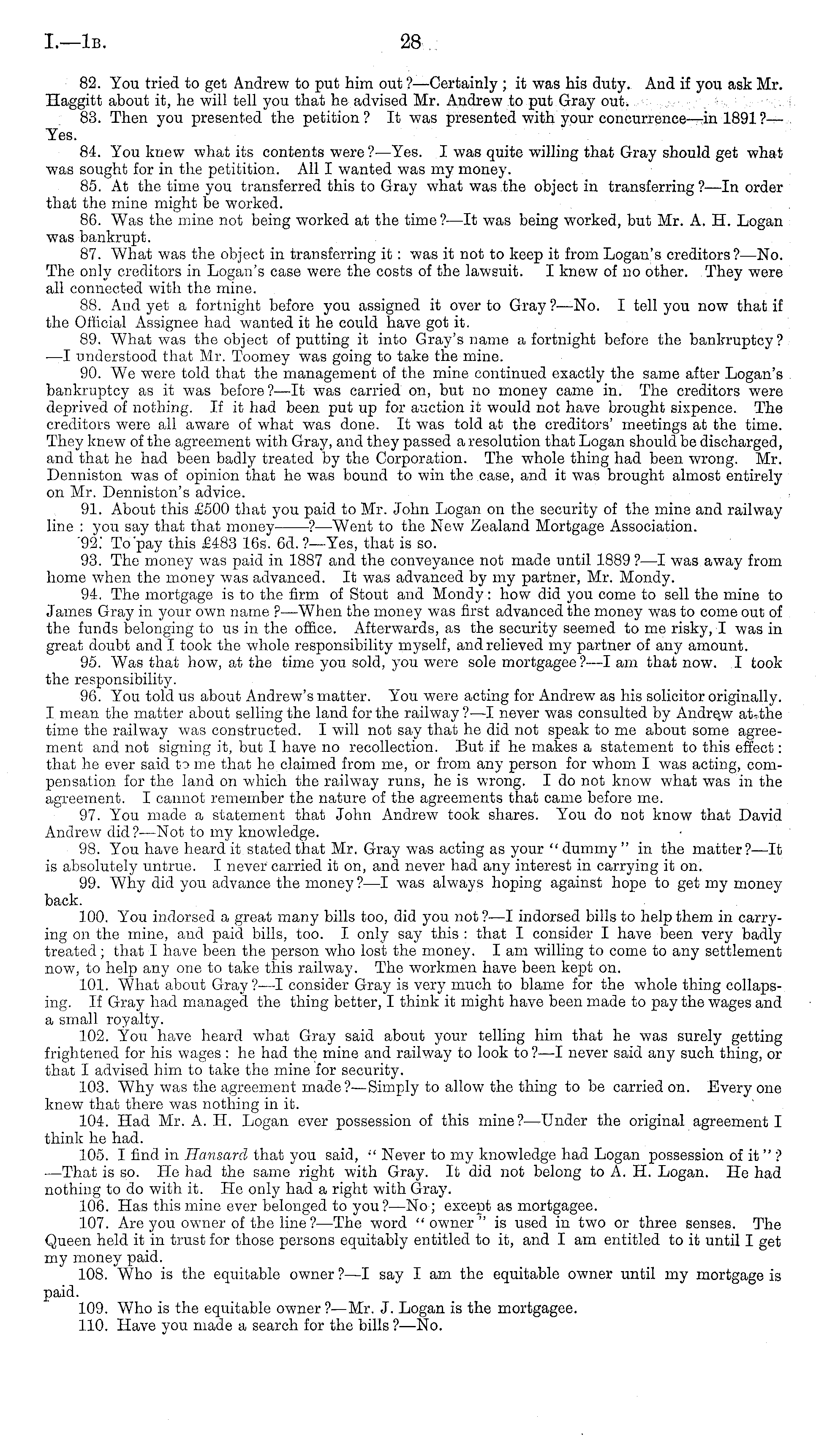 82. You tried to get Andrew to put him out ? —Certainly ; it was his duty. And if you ask Mr. Haggitt about it, he will tell you that he advised Mr. Andrew to put Gray out. 83. Then you presented the petition? It was presented with your concurrence—in 1891? — Yes. 84. You knew what its contents were ?—Yes. I was quite willing that Gray should get what was sought for in the petitition. All I wanted was my money. 85. At the time you transferred this to Gray what was the object in transferring?—ln order that the mine might be worked. 86. Was the mine not being worked at the time ?—lt was being worked, but Mr. A. H. Logan was bankrupt. 87. What was the object in transferring it: was it not to keep it from Logan's creditors?— No. The only creditors in Logan's case were the costs of the lawsuit. I knew of no other. They were all connected with the mine. 88. And yet a fortnight before you assigned it over to Gray ?—No. I tell you now that if the Official Assignee had wanted it he could have got it. 89. What was the object of putting it into Gray's name a fortnight before the bankruptcy? —I understood that Mr. Toomey was going to take the mine. 90. We were told that the management of the mine continued exactly the same after Logan's bankruptcy as it was before ?—lt was carried on, but no money came in. The creditors were deprived of nothing. If it had been put up for auction it would not have brought sixpence. The creditors were all aware of what was done. It was told at the creditors' meetings at the time. They knew of the agreement with Gray, and they passed a resolution that Logan should be discharged, and that he had been badly treated by the Corporation. The whole thing had been wrong. Mr. Denniston was of opinion that he was bound to win the case, and it was brought almost entirely on Mr. Denniston's advice. 91. About this £500 that you paid to Mr. John Logan on the security of the mine and railway line : you say that that money ? —Went to the New Zealand Mortgage Association. '92.' To'pay this £483 16s. 6d. ?—Yes, that is so. 93. The money was paid in 1887 and the conveyance not made until 1889 ? —I was away from home when the money was advanced. It was advanced by my partner, Mr. Mondy. 94. The mortgage is to the firm of Stout and Mondy: how did you come to sell the mine to James Gray in your own name ? —When the money was first advanced the money was to come out of the funds belonging to us in the office. Afterwards, as the security seemed to me risky, I was in great doubt and I took the whole responsibility myself, and relieved my partner of any amount. 95. Was that how, at the time you sold, you were sole mortgagee?—l am that now. I took the responsibility. 96. You told us about Andrew's matter. You were acting for Andrew as his solicitor originally. I mean the matter about selling the land for the railway?—l never was consulted by Andrew at.the time the railway was constructed. I will not say that he did not speak to me about some agreement and not signing it, but I have no recollection. But if he makes a statement to this effect: that he ever said to me that he claimed from me, or from any person for whom I was acting, compensation for the land on which the railway runs, he is wrong. Ido not know what was in the agreement. I cannot remember the nature of the agreements that came before me. 97. You made a statement that John Andrew took shares. You do not know that David Andrew did? —Not to my knowledge. 98. You have heard it stated that Mr. Gray was acting as your "dummy" in the matter?—lt is absolutely untrue. I never carried it on, and never had any interest in carrying it on. 99. Why did you advance the money?—l was always hoping against hope to get my moneyback. 100. You indorsed a great many bills too, did you not ? —I indorsed bills to help them in carrying on the mine, and paid bills, too. I only say this : that I consider I have been very badly treated; that I have been the person who lost the money. lam willing to come to any settlement now, to help any one to take this railway. The workmen have been kept on. 101. What about Gray?—l consider Gray is very much to blame for the whole thing collapsing. If Gray had managed, the thing better, I think it might have been made to pay the wages and a small royalty. 102. You have heard what Gray said about your telling him that he was surely getting frightened for his wages :he had the mine and railway to look to ? —I never said any such thing, or that I advised him to take the mine for security. 103. Why was the agreement made?— Simply to allow the thing to be carried on. Every one knew that there was nothing in it. 104. Had Mr. A. H. Logan ever possession of this mine?— Under the original agreement I think he had. 105. I find in Hansard that you said, " Never to my knowledge had Logan possession of it " ? —That is so. He had the same right with Gray. It did not belong to A. H. Logan. He had nothing to do with it. He only had a right with Gray. 106. Has this mine ever belonged to you? —No; except as mortgagee. 107. Are you owner of the line ?—The word "owner" is used in two or three senses. The Queen held it in trust for those persons equitably entitled to it, and I am entitled to it until I get my money paid. 108. Who is the equitable owner ?—I say I am the equitable owner until my mortgage is paid. 109. Who is the equitable owner ?—Mr. J. Logan is the mortgagee. 110. Have you made a search for the bills ?—No.