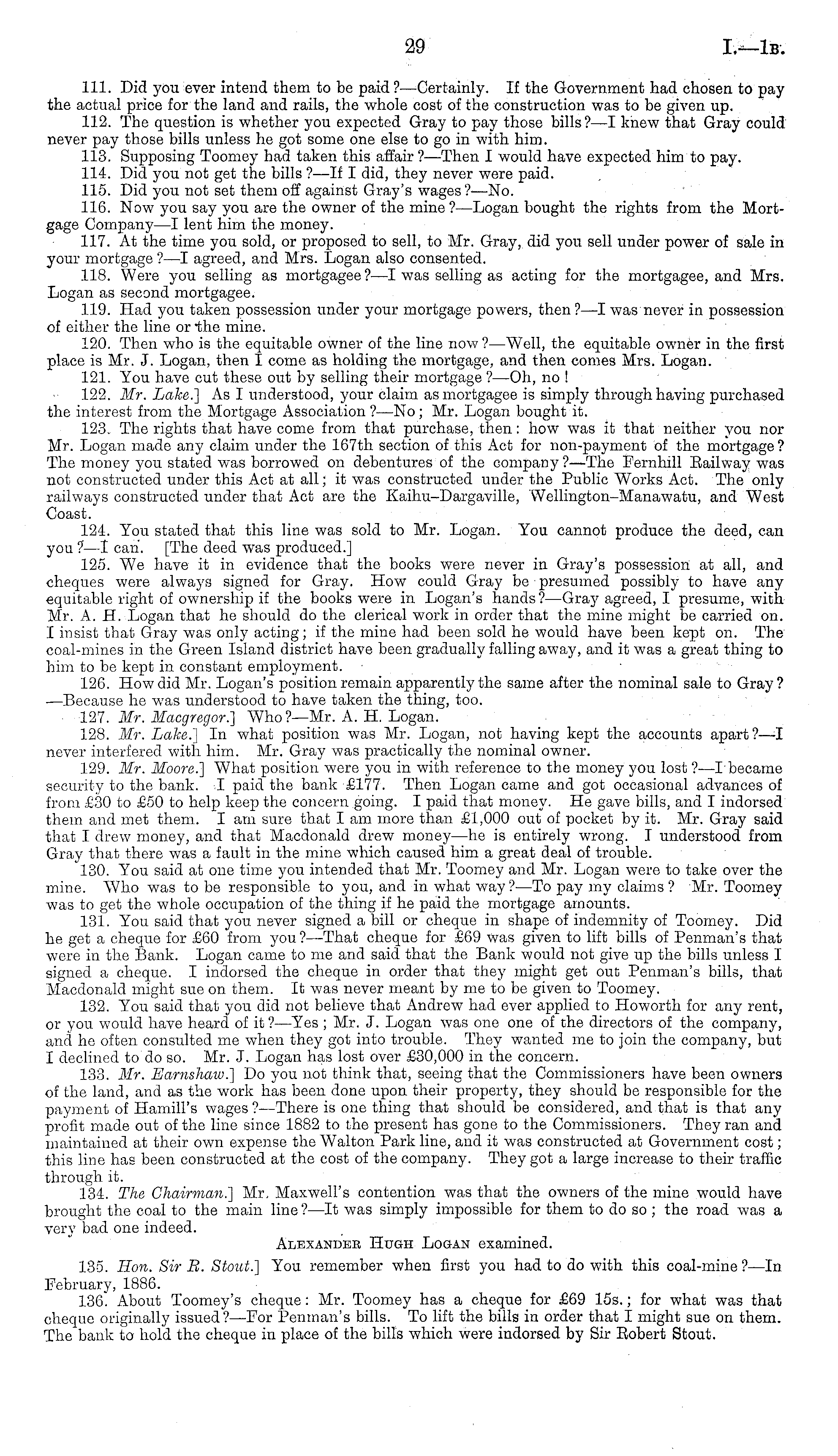 111. Did you ever intend them to be paid?— Certainly. If the Government had chosen to pay the actual price for the land and rails, the whole cost of the construction was to be given up. 112. The question is whether you expected Gray to pay those bills ? —I knew that Gray could never pay those bills unless he got some one else to go in with him. 113. Supposing Toomey had taken this affair ? —Then I would have expected him to pay. 114. Did you not get the bills ? —lf I did, they never were paid. 115. Did you not set them off against Gray's wages ?—No. 116. Now you say you are the owner of the mine?—Logan bought the rights from the Mortgage Company—l lent him the money. 117. At the time you sold, or proposed to sell, to Mr. Gray, did you sell under power of sale in your mortgage ?—I agreed, and Mrs. Logan also consented. 118. Were you selling as mortgagee ? —I was selling as acting for the mortgagee, and Mrs. Logan as second mortgagee. 119. Had you taken possession under your mortgage powers, then ?—I was never in possession of either the line or-the mine. 120. Then who is the equitable owner of the line now? —Well, the equitable owner in the first place is Mr. J. Logan, then I come as holding the mortgage, and then comes Mrs. Logan. 121. You have cut these out by selling their mortgage ? —Oh, no ! 122. Mr. Lake.] As I understood, your claim as mortgagee is simply through having purchased the interest from the Mortgage Association ?—No; Mr. Logan bought it. 123. The rights that have come from that purchase, then: how was it that neither you nor Mr. Logan made any claim under the 167 th section of this Act for non-payment of the mortgage ? The money you stated was borrowed on debentures of the company ?—The Fernhill Bailway was not constructed under this Act at all; it was constructed under the Public Works Act. The only railways constructed under that Act are the Kaihu-Dargaville, Wellington-Manawatu, and West Coast. 124. You stated that this line was sold to Mr. Logan. You cannot produce the deed, can you ?—I can. [The deed was produced.] 125. We have it in evidence that the books were never in Gray's possession at all, and cheques were always signed for Gray. How could Gray be presumed possibly to have any equitable right of ownership if the books were in Logan's hands?— Gray agreed, I presume, with Mr. A. H. Logan that he should do the clerical work in order that the mine might be carried on. I insist that Gray was only acting; if the mine had been sold he would have been kept on. The coal-mines in the Green Island district have been gradually falling away, and it was a great thing to him to be kept in constant employment. 126. How did Mr. Logan's position remain apparently the same after the nominal sale to Gray? —Because he was understood to have taken the thing, too. 127. Mr. Macgregor.] Who?— Mr. A. H. Logan. 128. Mr. Lake.] In what position was Mr. Logan, not having kept the accounts apart?—l never interfered with him. Mr. Gray was practically the nominal owner. 129. Mr. Moore.] What position were you in with reference to the money you lost ? —l'became security to the bank. I paid the bank £177. Then Logan came and got occasional advances of from £30 to £50 to help keep the concern going. I paid that money. He gave bills, and I indorsed them and met them. lam sure that lam more than £1,000 out of pocket by it. Mr. Gray said that I drew money, and that Macdonald drew money—he is entirely wrong. I understood from Gray that there was a fault in the mine which caused him a great deal of trouble. 130. You said at one time you intended that Mr. Toomey and Mr. Logan were to take over the mine. Who was to be responsible to you, and in what way?—To pay my claims ? Mr. Toomey was to get the whole occupation of the thing if he paid the mortgage amounts. 131. You said that you never signed a bill or cheque in shape of indemnity of Toomey. Did he get a cheque for £60 from you ?—That cheque for £69 was given to lift bills of Penman's that were in the Bank. Logan came to me and said that the Bank would not give up the bills unless I signed a cheque. I indorsed the cheque in order that they might get out Penman's bills, that Macdonald might sue on them. It was never meant by me to be given to Toomey. 132. You said that you did not believe that Andrew had ever applied to Howorth for any rent, or you would have heard of it ?—Yes ; Mr. J. Logan was one one of the directors of the company, and he often consulted me when they got into trouble. They wanted me to join the company, but I declined to do so. Mr. J. Logan has lost over £30,000 in the concern. 133. Mr. Earnshaw.] Do you not think that, seeing that the Commissioners have been owners of the land, and as the work has been done upon their property, they should be responsible for the payment of Hamill's wages ?—There is one thing that should be considered, and that is that any profit made out of the line since 1882 to the present has gone to the Commissioners. They ran and maintained at their own expense the Walton Park line, and it was constructed at Government cost; this line has been constructed at the cost of the company. They got a large increase to their traffic through it. 134. The Chairman.] Mr. Maxwell's contention was that the owners of the mine would have brought the coal to the main line ? —lt was simply impossible for them to do so ; the road was a very bad one indeed. Alexander Hugh Logan examined. 135. Hon. Sir B. Stout.] You remember when first you had to do with this coal-mine ?—ln February, 1886. 136. About Toomey's cheque: Mr. Toomey has a cheque for £69 155.; for what was that cheque originally issued?— For Penman's bills. To lift the bills in order that I might sue on them. The bank to hold the cheque in place of the bills which were indorsed by Sir Bobert Stout.