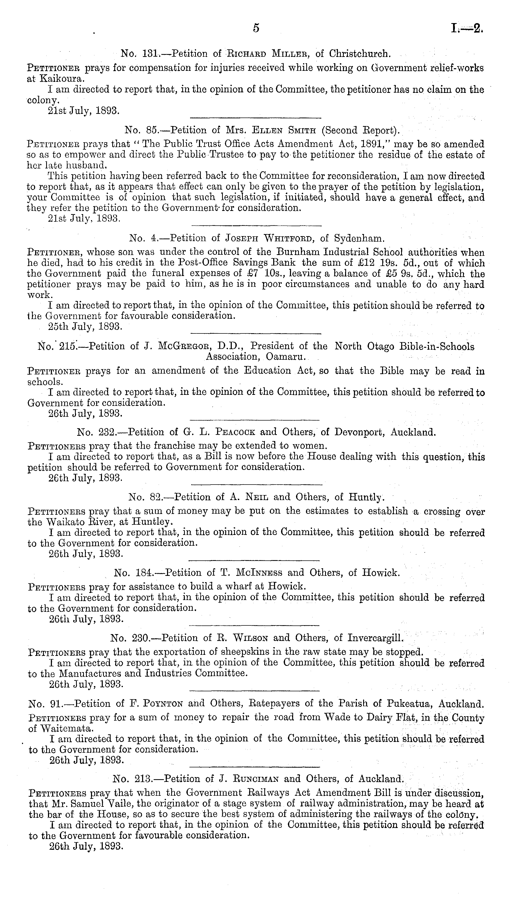 No. 184.—Petition of T. Mclnness and Others, of Howick. Petitionees pray for assistance to build a wharf at Howick. I am directed to report that, in the opinion of the Committee, this petition should be referred to the Government for consideration. 26th July, 1893.