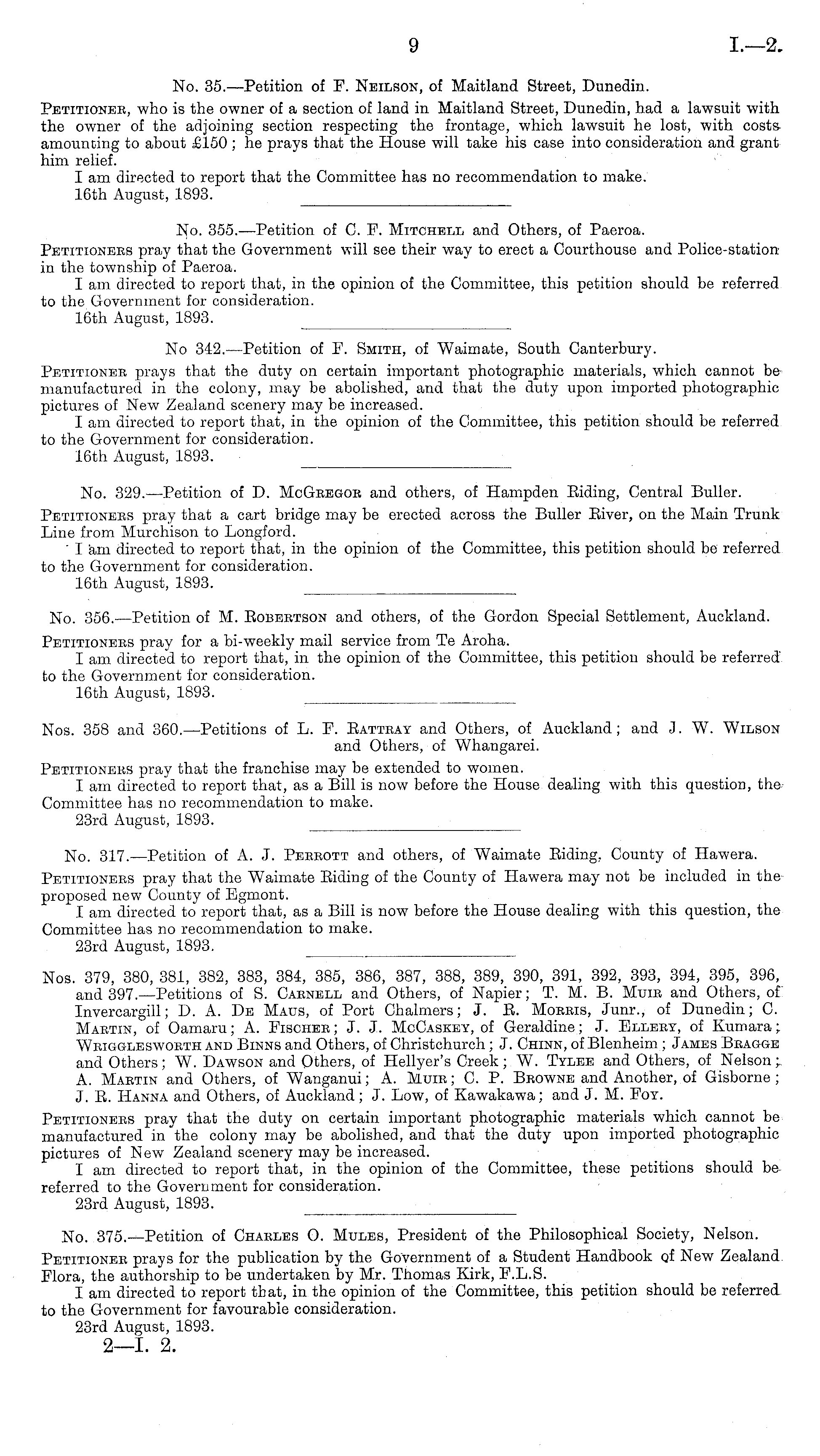 Nos. 379, 380, 381, 382, 383, 384, 385, 386, 387, 388, 389, 390, 391, 392, 393, 394, 395, 396, and 397. —Petitions of S. Carnell and Others, of Napier; T. M. B. Muir and Others, of Invercargill; D. A. De Maus, of Port Chalmers; J. B. Morris, Junr., of Dunedin; C. Martin, of Oamaru; A. Fischer; J. J. McCaskey, of Geraldine; J. Ellery, of Kumara; Wrigglesworth and Binns and Others, of Christchurch ; J. Chirm, of Blenheim ; James Bragge and Others; W. Dawson and Others, of Hellyer's Creek; W. Tylee and Others, of Nelson;.. A. Martin and Others, of Wanganui; A. Muie ; C. P. Beowne and Another, of Gisborne ; J. B. Hanna and Others, of Auckland ; J. Low, of Kawakawa; and J. M. Foy. Petitioners pray that the duty on certain important photographic materials which cannot be manufactured in the colony may be abolished, and that the duty upon imported photographic pictures of New Zealand scenery may be increased. I am directed to report that, in the opinion of the Committee, these petitions should bereferred to the Government for consideration. 23rd August, 1893.