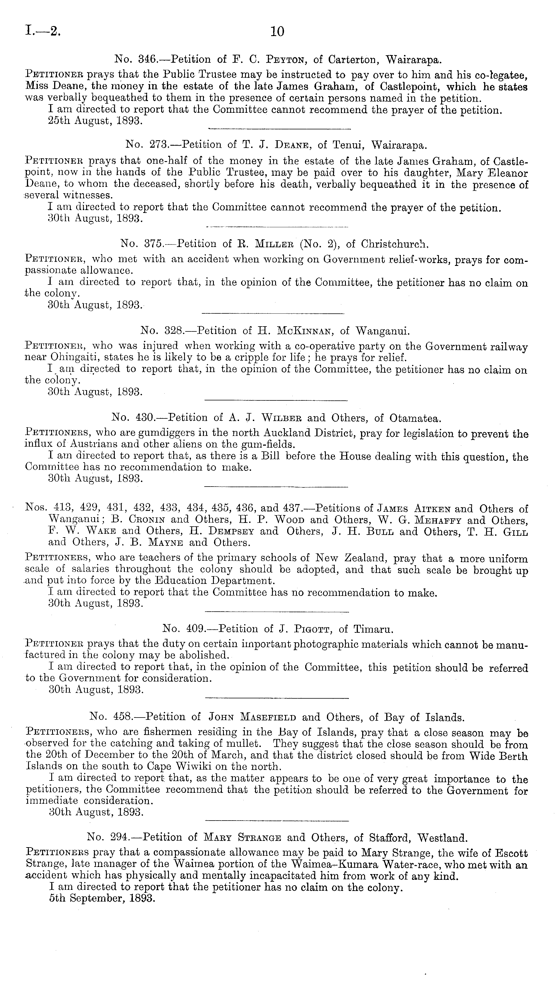 No. 346. —Petition of F. C. Peyton, of Carterton, Wairarapa. Petitioner prays that the Public Trustee may be instructed to pay over to him and his co-legatee, Miss Deane, the money in the estate of the late James Graham, of Castlepoint, which he states was verbally bequeathed to them in the presence of certain persons named in the petition. I am directed to report that the Committee cannot recommend the prayer of the petition. 25th August, 1893.