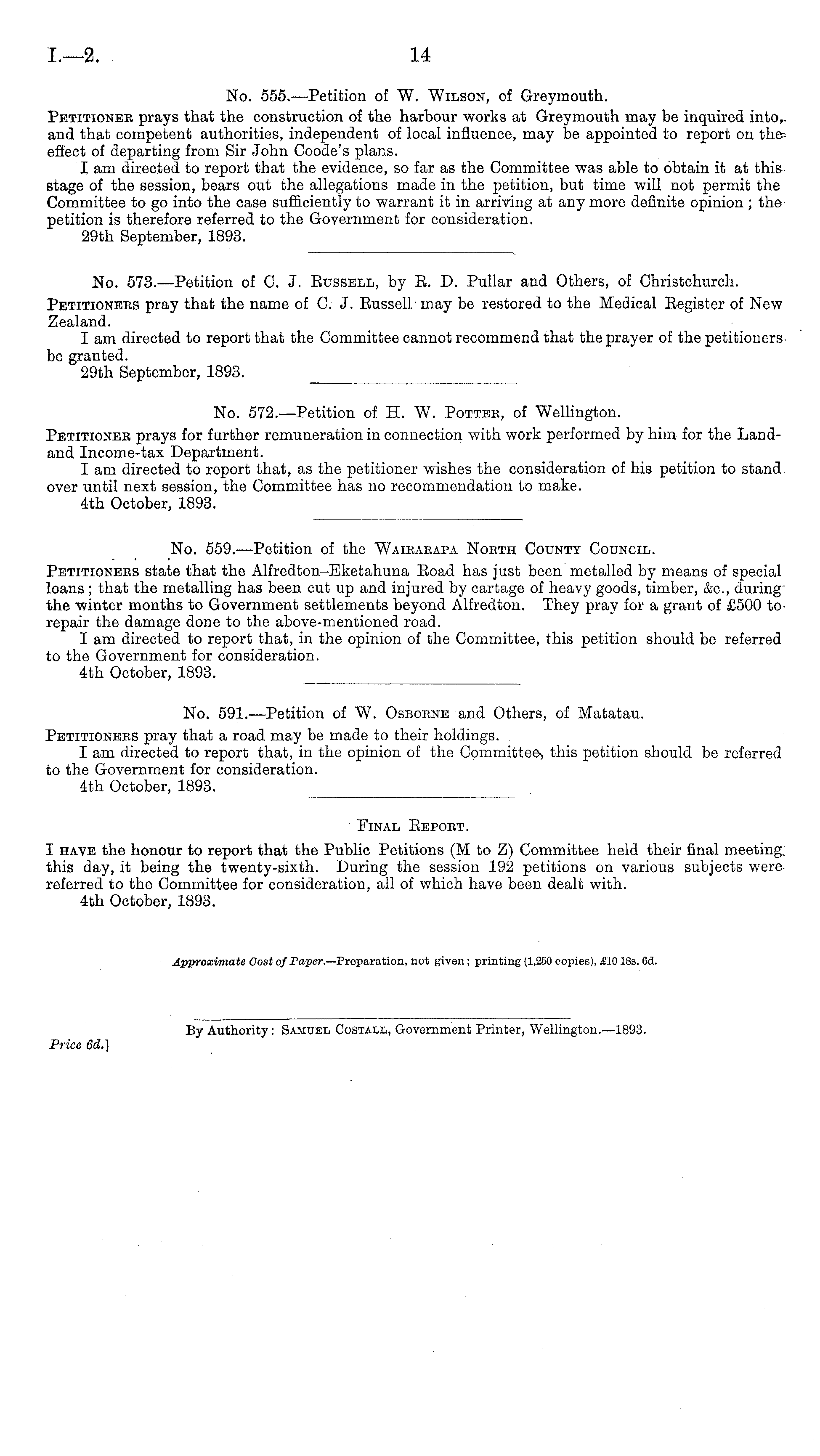 Final Report. I have the honour to report that the Public Petitions (M to Z) Committee held their final meeting, this day, it being the twenty-sixth. During the session 192 petitions on various subjects were referred to the Committee for consideration, all of which have been dealt with. 4th October, 1893.