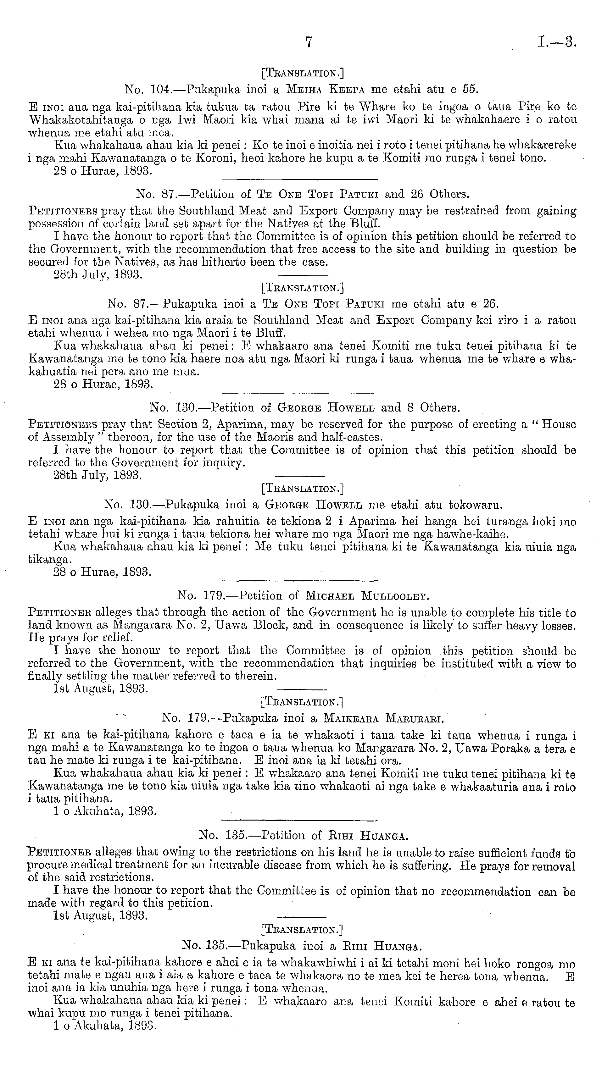No. 179. —Petition of Michael Mullooley. Petitioner alleges that through the action of the Government he is unable to complete his title to land known as Mangarara No. 2, Uawa Block, and in consequence is likely to suffer heavy losses. He prays for relief. I have the honour to report that the Committee is of opinion this petition should be referred to the Government, with the recommendation that inquiries be instituted with a view to finally settling the matter referred to therein. Ist August, 1893. [Translation.] No. 179.—Pukapuka inoi a Maikeaea Maeubari. E Xi ana te kai-pitihana kahore c taea c ia te whakaoti i tana take ki taua whenua i runga i nga mahi a te Kawanatanga ko te ingoa o taua whenua ko Mangarara No. 2, Uawa Poraka a tera c tau he mate ki runga ite kai-pitihana. E inoi ana ia ki tetahi ora. Kua whakahaua ahau kia ki penei: E whakaaro ana tenei Komiti me tuku tenei pitihana kite Kawanatanga me te tono kia uiuia nga take kia tino whakaoti ai nga take c whakaaturia ana i roto i taua pitihana. 1 o Akuhata, 1893.