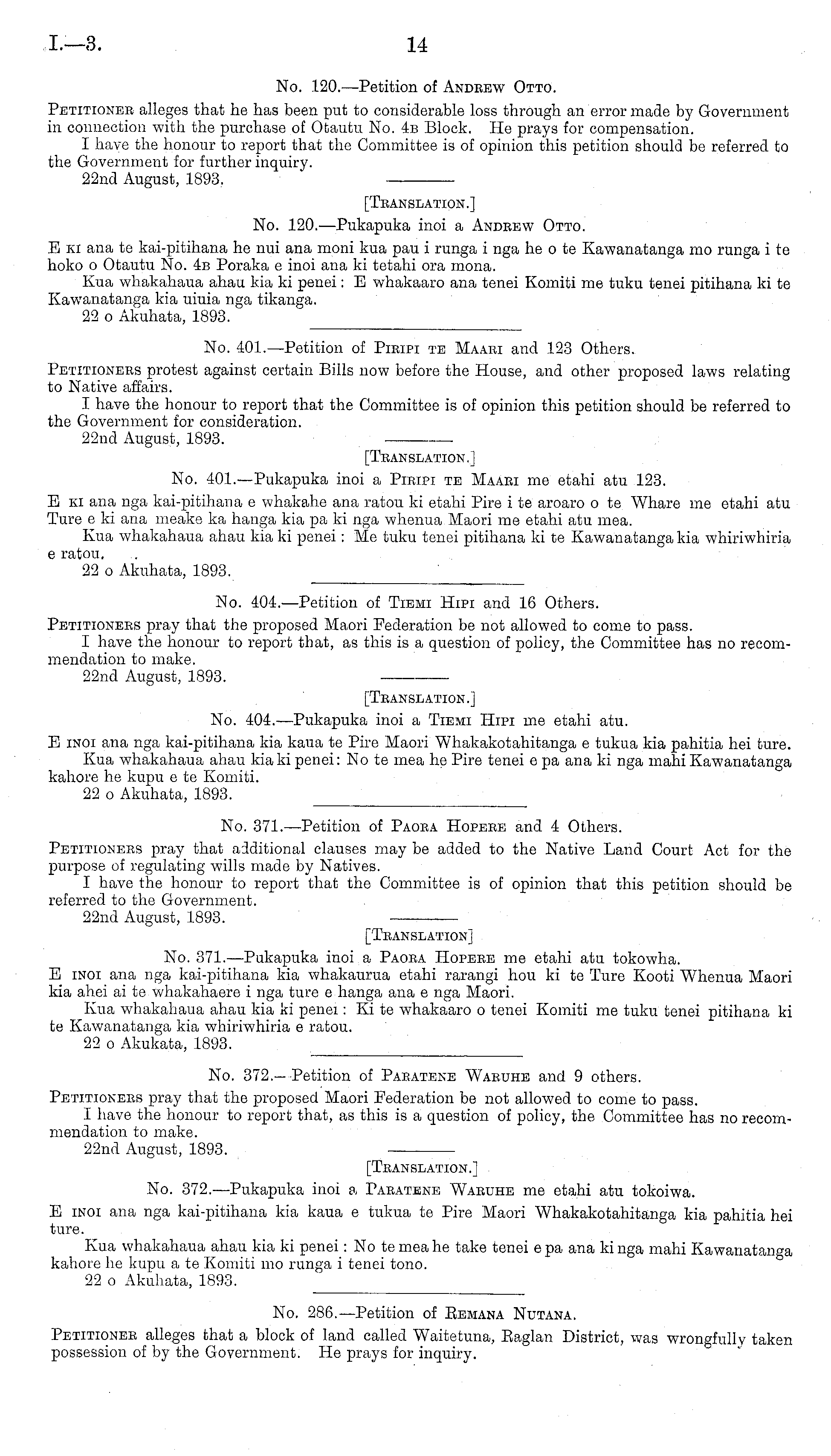 No. 120.—Petition of Andrew Otto. Petitioner alleges that he has been put to considerable loss through an error made by Government in connection with the purchase of Otautu No. 4b Block. He prays for compensation. I have the honour to report that the Committee is of opinion this petition should be referred to the Government for further inquiry. 22nd August, 1893. [Translation.] No. 120. —Pukapuka inoi a Andrew Otto. E ki ana te kai-pitihana he nui ana moni kua pau i runga i nga he o te Kawanatanga mo runga i te hoko o Otautu No. 4b Poraka c inoi ana ki tetahi ora mona. Kua whakahaua ahau kia ki penei: E whakaaro ana tenei Komiti me tuku tenei pitihana kite Kawanatanga kia uiuia nga tikanga. 22 o Akuhata, 1893.