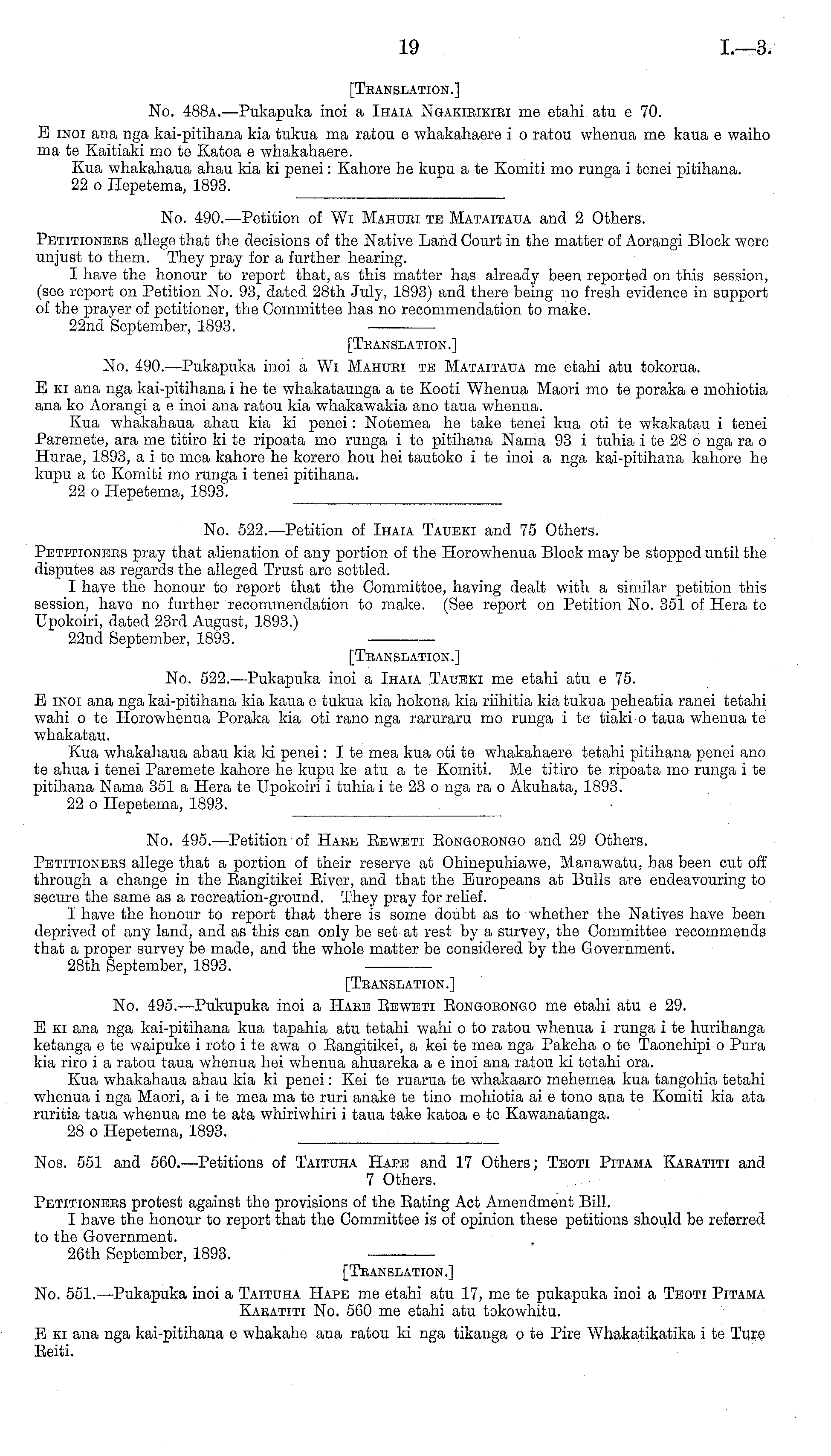 Nos. 551 and 560.—Petitions of Taituha Hape and 17 Others; Teoti Pitama Kabatiti and 7 Others. Petitionebs protest against the provisions of the Eating Act Amendment Bill. I have the honour to report that the Committee is of opinion these petitions should be referred to the Government. 26th September, 1893. [Tbanslation.] No. 551.—Pukapuka inoi a Taituha Hape me etahi atu 17, me te pukapuka inoi a Teoti Pitama Kabatiti No. 560 me etahi atu tokowhitu. B Xi ana nga kai-pitihana c whakahe ana ratou ki nga tikanga o te Pire Whakatikatika i te Ture Eeiti.