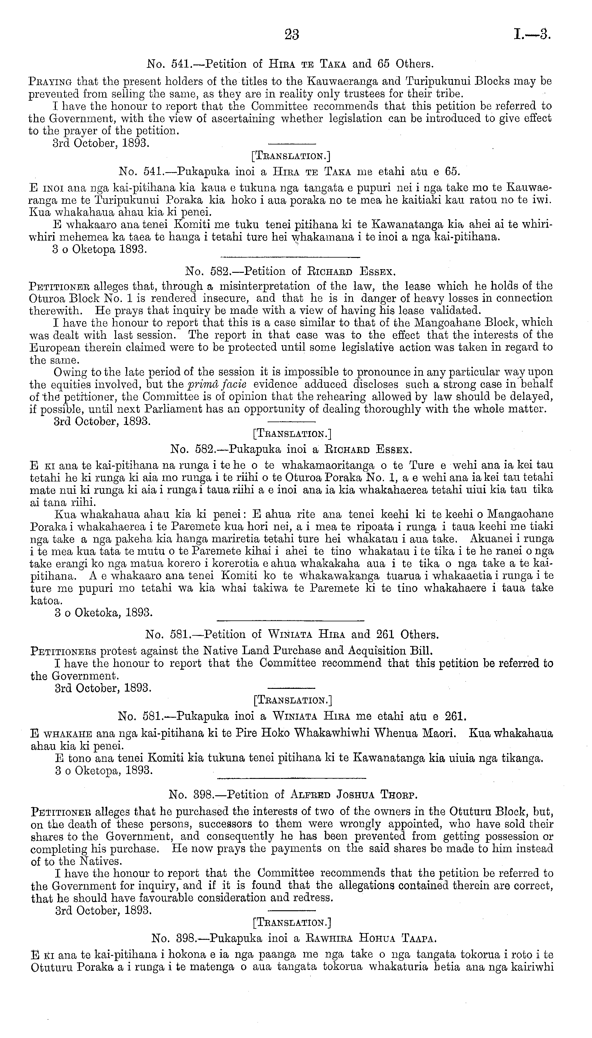 No. 398.—Petition of Alfeed Joshua Thobp. Petitioner alleges that he purchased the interests of two of the owners in the Otuturu Block, but, on the death of these persons, successors to them were wrongly appointed, who have sold their shares to the Government, and consequently he has been prevented from getting possession or completing his purchase. He now prays the payments on the said shares be made to him instead of to the Natives. I have the honour to report that the Committee recommends that the petition be referred to the Government for inquiry, and if it is found that the allegations contained therein are correct, that he should have favourable consideration and redress. 3rd October, 1893. [Translation.] No. 398.—Pukapuka inoi a Eawhiea Hohua Taapa. E ki ana te kai-pitihana i hokona c ia nga paanga me nga take o nga tangata tokorua i roto i te Otuturu Poraka a i runga i te matenga o aua tangata tokorua whakaturia betia ana nga kairiwhi