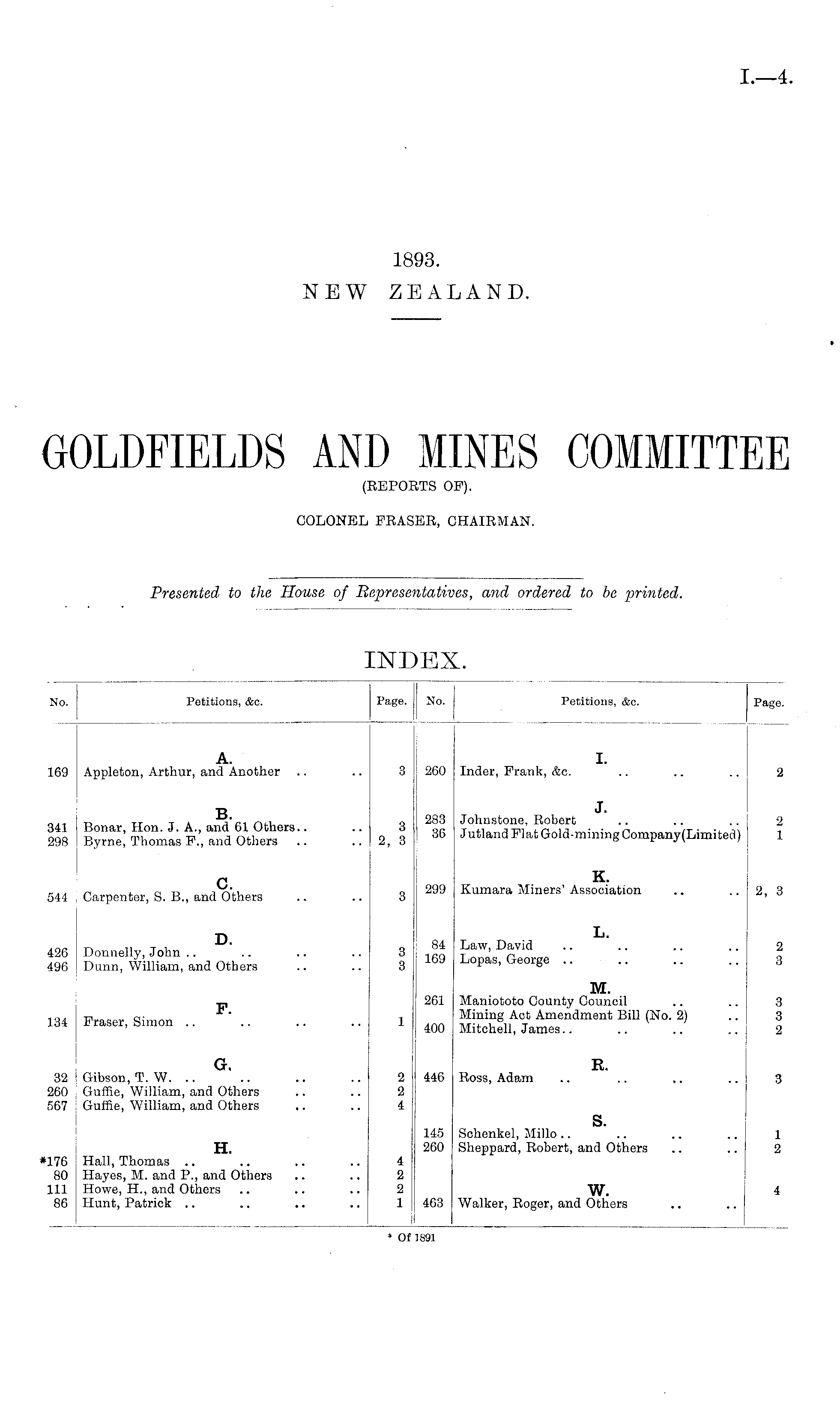 GOLDFIELDS AND MINES COMMITTEE (REPORTS OF). COLONEL FRASER, CHAIRMAN.