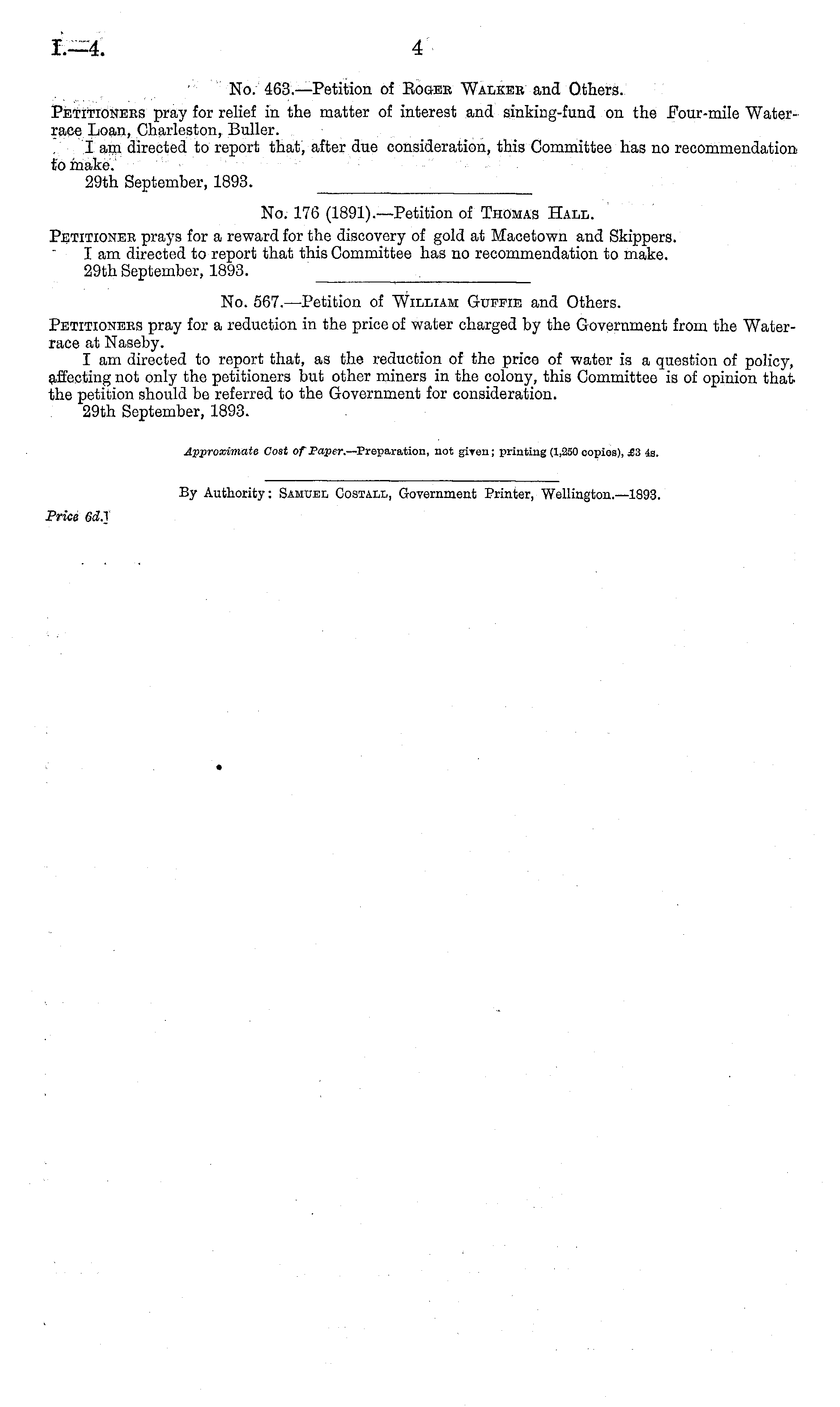 No. 567. —Petition of William Guffie and Others. Petitioners pray for a reduction in the price of water charged by the Government from the Waterrace at Naseby. I am directed to report that, as the reduction of the price of water is a question of policy, affecting not only the petitioners but other miners in the colony, this Committee is of opinion that, the petition should be referred to the Government for consideration. 29th September, 1893. Approximate Cost of Paper.— Preparation, not giyen; printing (1,250 copies), £3 4s.
