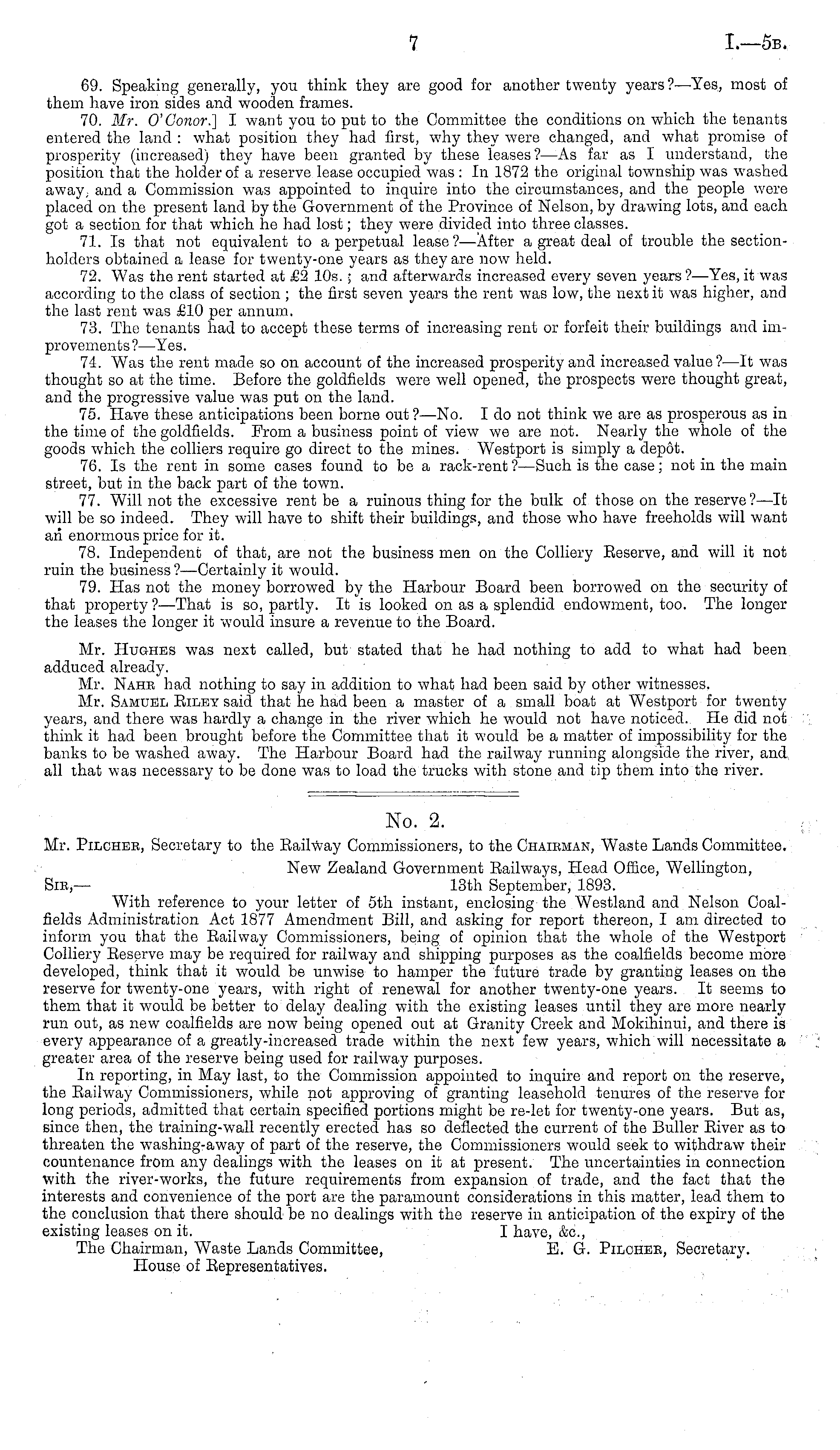69. Speaking generally, you think they are good for another twenty years ? —Yes, most of them have iron sides and wooden frames. 70. Mr. o'Conor.] I want you to put to the Committee the conditions on which the tenants entered the land : what position they had first, why they were changed, and what promise of prosperity (increased) they have been granted by these leases? —As far as I understand, the position that the holder of a reserve lease occupied was : In 1872 the original township was washed away ; and a Commission was appointed to inquire into the circumstances, and the people wore placed on the present land by the Government of the Province of Nelson, by drawing lots, and each got a section for that which he had lost; they were divided into three classes. 71. Is that not equivalent to a perpetual lease?— After a great deal of trouble the sectionholders obtained a lease for twenty-one years as they arc now held. 72. Was the rent started at £2 10s. ■ and afterwards increased every seven years ?—Yes, it was according to the class of section ; the first seven years the rent was low, the next it was higher, and the last rent was £10 per annum. 73. The tenants had to accept these terms of increasing rent or forfeit their buildings and improvements ?—Yes. 74. Was the rent made so on account of the increased prosperity and increased value ?—lt was thought so at the time. Before the goldfields were well opened, the prospects were thought great, and the progressive value was put on the land. 75. Have these anticipations been borne out ? —No. I do not think we are as prosperous as in the time of the goldfields. From a business point of view we are not. Nearly the whole of the goods which the colliers require go direct to the mines. Westport is simply a depot. 76. Is the rent in some cases found to be a rack-rent? —Such is the case; not in the main street, but in the back part of the town. 77. Will not the excessive rent be a ruinous thing for the bulk of those on the reserve? —It will be so indeed. They will have to shift their buildings, and those who have freeholds will want aii enormous price for it. 78. Independent of that, are not the business men on the Colliery Eeserve, and will it not ruin the business?— Certainly it would. 79. Has not the money borrowed by the Harbour Board been borrowed on the security of that property ? —That is so, partly. It is looked on as a splendid endowment, too. The longer the leases the longer it would insure a revenue to the Board. Mr. Hughes was next called, but stated that he had nothing to add to what had been adduced already. Mr. Nahb had nothing to say in addition to what had been said by other witnesses. Mr. Samuel Eiley said that he had been a master of a small boat at Westport for twenty years, and there was hardly a change in the river which he would not have noticed. He did not think it had been brought before the Committee that it would be a matter of impossibility for the banks to be washed away. The Harbour Board had the railway running alongside the river, and, all that was necessary to be done was to load the trucks with stone and tip them into the river.
