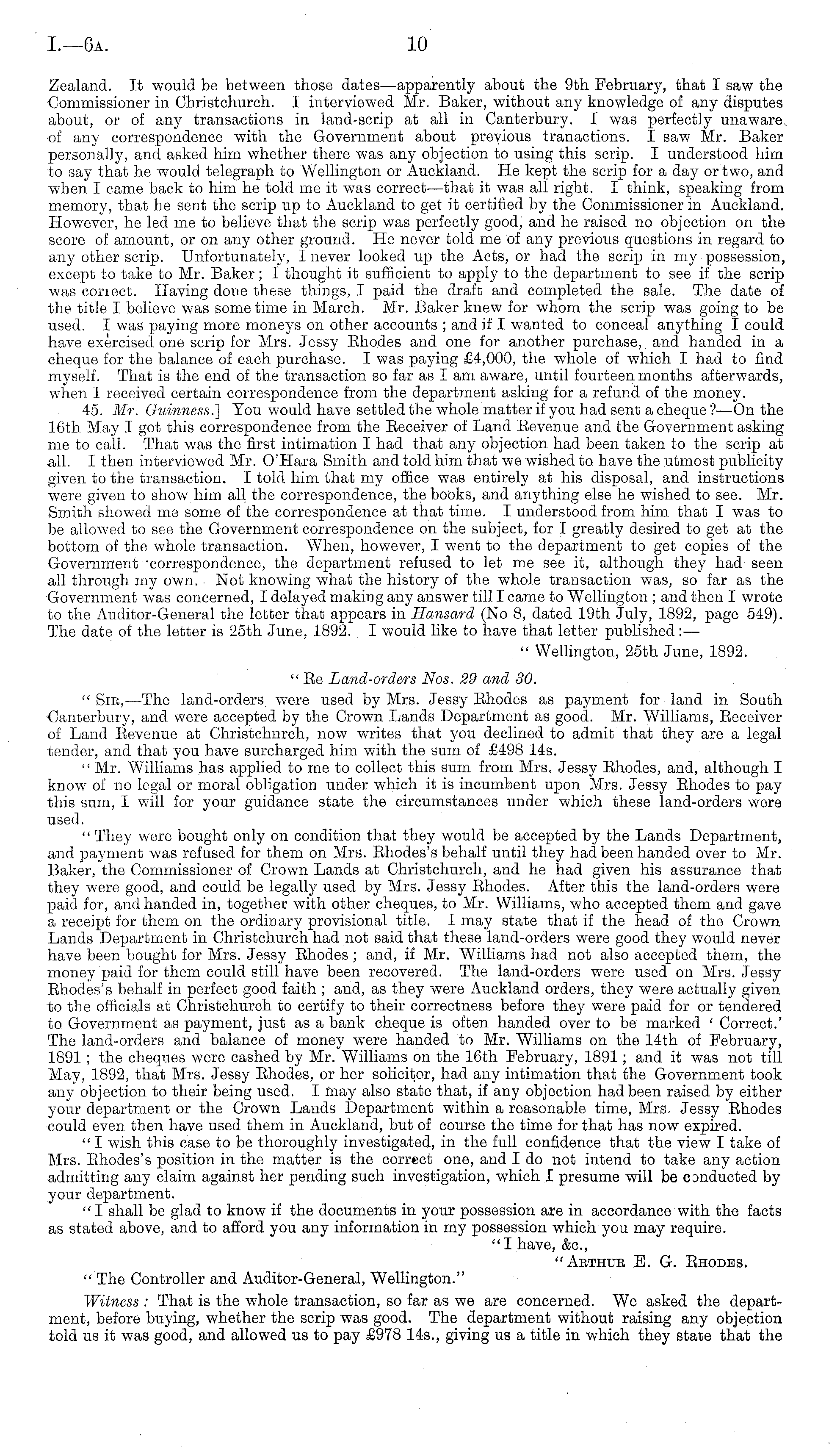 Zealand. It would be between those dates—apparently about the 9th February, that I saw the Commissioner in Christchurch. I interviewed Mr. Baker, without any knowledge of any disputes about, or of any transactions in land-scrip at all in Canterbury. I was perfectly unaware of any correspondence with the Government about previous tranactions. I saw Mr. Baker personally, and asked him whether there was any objection to using this scrip. I understood him to say that he would telegraph to Wellington or Auckland. He kept the scrip for a day or two, and when I came back to him he told me it was correct—that it was all right. I think, speaking from memory, that he sent the scrip up to Auckland to get it certified by the Commissioner in Auckland. However, he led me to believe that the scrip was perfectly good, and he raised no objection on the score of amount, or on any other ground. He never told me of any previous questions in regard to any other scrip. Unfortunately, I never looked up the Acts, or had the scrip in my possession, except to take to Mr. Baker; I thought it sufficient to apply to the department to see if the scrip was conect. Having done these things, I paid the draft and completed the sale. The date of the title I believe was sometime in March. Mr. Baker knew for whom the scrip was going to be used. I was paying more moneys on other accounts ; and if I wanted to conceal anything I could have exercised one scrip for Mrs. Jessy Rhodes and one for another purchase, and handed in a cheque for the balance of each purchase. I was paying £4,000, the whole of which I had to find myself. That is the end of the transaction so far as lam aware, until fourteen months afterwards, when I received certain correspondence from the department asking for a refund of the money. 45. Mr. Guinness.] You would have settled the whole matter if you had sent a cheque ?—On the 16th May I got this correspondence from the Receiver of Land Revenue and the Government asking me to call. That was the first intimation I had that any objection had been taken to the scrip at all. I then interviewed Mr. O'Hara Smith and told him that we wished to have the utmost publicity given to the transaction. I told him that my office was entirely at his disposal, and instructions were given to show him all the correspondence, the books, and anything else he wished to see. Mr. Smith showed me some of the correspondence at that time. I understood from him that I was to be allowed to see the Government correspondence on the subject, for I greatly desired to get at the bottom of the whole transaction. When, however, I went to the department to get copies of the Government •correspondence, the department refused to let me see it, although they had seen all through my own. Not knowing what the history of the whole transaction was, so far as the Government was concerned, I delayed making any answer till I came to Wellington ; and then I wrote to the Auditor-General the letter that appears in Hansard (No 8, dated 19th July, 1892, page 549). The date of the letter is 25th June, 1892. I would like to have that letter published : — " Wellington, 25th June, 1892. " Re Land-orders Nos. 29 and 30. " Sic, —The land-orders were used by Mrs. Jessy Rhodes as payment for land in South Canterbury, and were accepted by the Crown Lands Department as good. Mr. Williams, Receiver of Land Revenue at Christchnrch, now writes that you declined to admit that they are a legal tender, and that you have surcharged him with the sum of £498 14s. " Mr. Williams has applied to me to collect this sum from Mrs, Jessy Rhodes, and, although I know of no legal or moral obligation under which it is incumbent upon Mrs. Jessy Rhodes to pay this sum, I will for your guidance state the circumstances under which these land-orders were used. " They were bought only on condition that they would be accepted by the Lands Department, and payment was refused for them on Mrs. Rhodes's behalf until they had been handed over to Mr. Baker, the Commissioner of Crown Lands at Christchurch, and he had given his assurance that they were good, and could be legally used by Mrs. Jessy Rhodes. After this the land-orders were paid for, and handed in, together with other cheques, to Mr. Williams, who accepted them and gave a receipt for them on the ordinary provisional title. I may state that if the head of the Crown Lands Department in Christchurch had not said that these land-orders were good they would never have been bought for Mrs. Jessy Rhodes ; and, if Mr. Williams had not also accepted them, the money paid for them could still have been recovered. The land-orders were used on Mrs. Jessy Rhodes's behalf in perfect good faith ; and, as they were Auckland orders, they were actually given to the officials at Christchurch to certify to their correctness before they were paid for or tendered to Government as payment, just as a bank cheque is often handed over to be marked ' Correct.' The land-orders and balance of money were handed to Mr. Williams on the 14th of February, 1891 ; the cheques were cashed by Mr. Williams on the 16th February, 1891; and it was not till May, 1892, that Mrs. Jessy Rhodes, or her solicitor, had. any intimation that the Government took any objection to their being used. I may also state that, if any objection had been raised by either your department or the Crown Lands Department within a reasonable time, Mrs. Jessy Rhodes could even then have used them in Auckland, but of course the time for that has now expired. " I wish this case to be thoroughly investigated, in the full confidence that the view I take of Mrs. Rhodes's position in the matter is the correct one, and I do not intend to take any action admitting any claim against her pending such investigation, which I presume will be conducted by your department. " I shall be glad to know if the documents in your possession are in accordance with the facts as stated above, and to afford you any inf