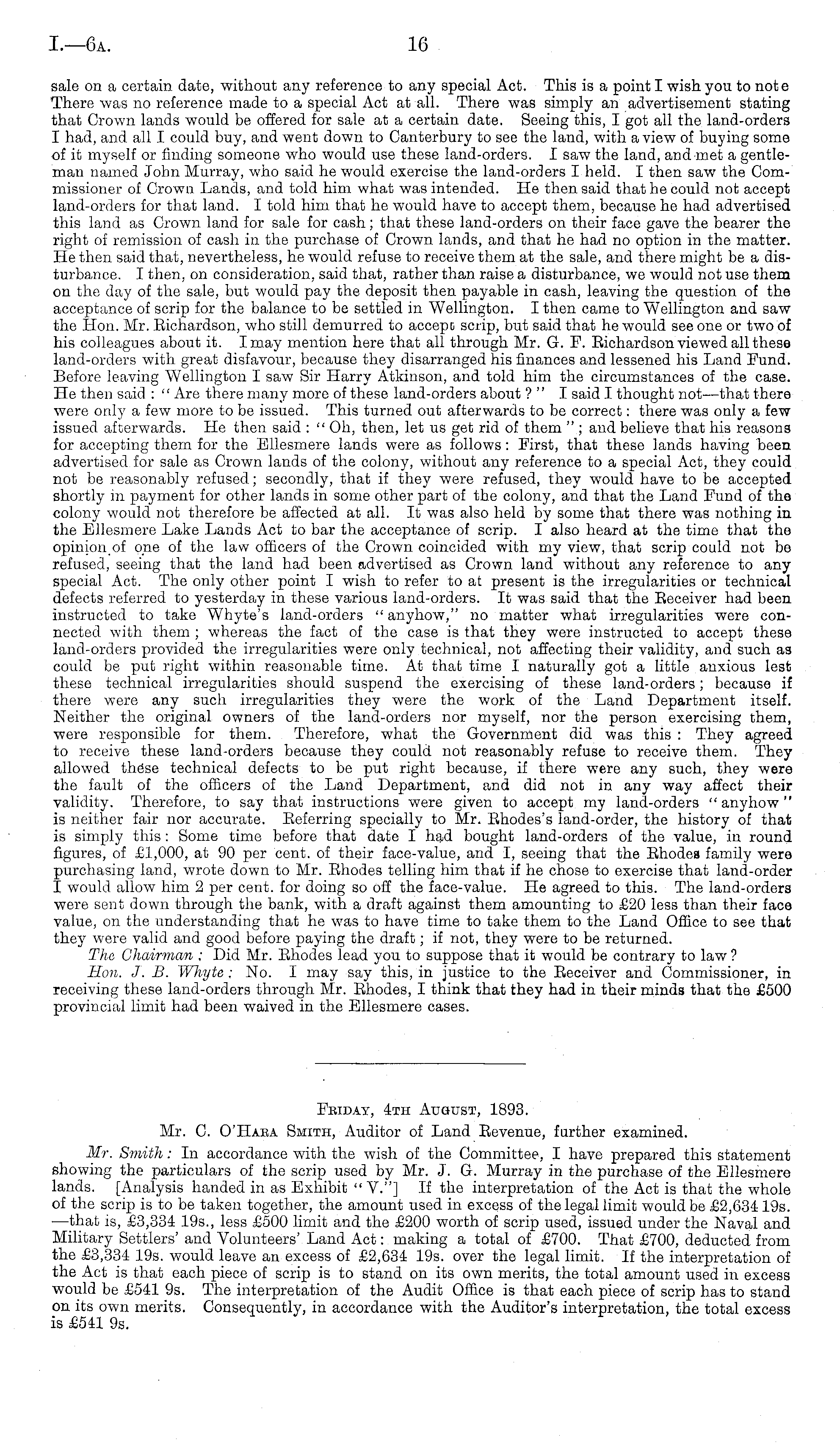 Friday, 4th Auoust, 1893. Mr. C. O'Haba Smith, Auditor of Land Eevenue, further examined. Mr. Smith: In accordance with the wish of the Committee, I have prepared this statement showing the particulars of the scrip used by Mr. J. G. Murray in the purchase of the Ellesmere lands. [Analysis handed in as Exhibit "V."] If the interpretation of the Act is that the whole of the scrip is to be taken together, the amount used in excess of the legal limit would be £2,634 19s. —that is, £3,334 195., less £500 limit and the £200 worth of scrip used, issued under the Naval and Military Settlers' and Volunteers' Land Act: making a total of £700. That £700, deducted from the £3,334 19s. would leave an excess of £2,634 19s. over the legal limit. If the interpretation of the Act is that each piece of scrip is to stand on its own merits, the total amount used in excess would be £541 9s. The interpretation of the Audit Office is that each piece of scrip has to stand on its own merits. Consequently, in accordance with the Auditor's interpretation, the total excess is £541 9s.