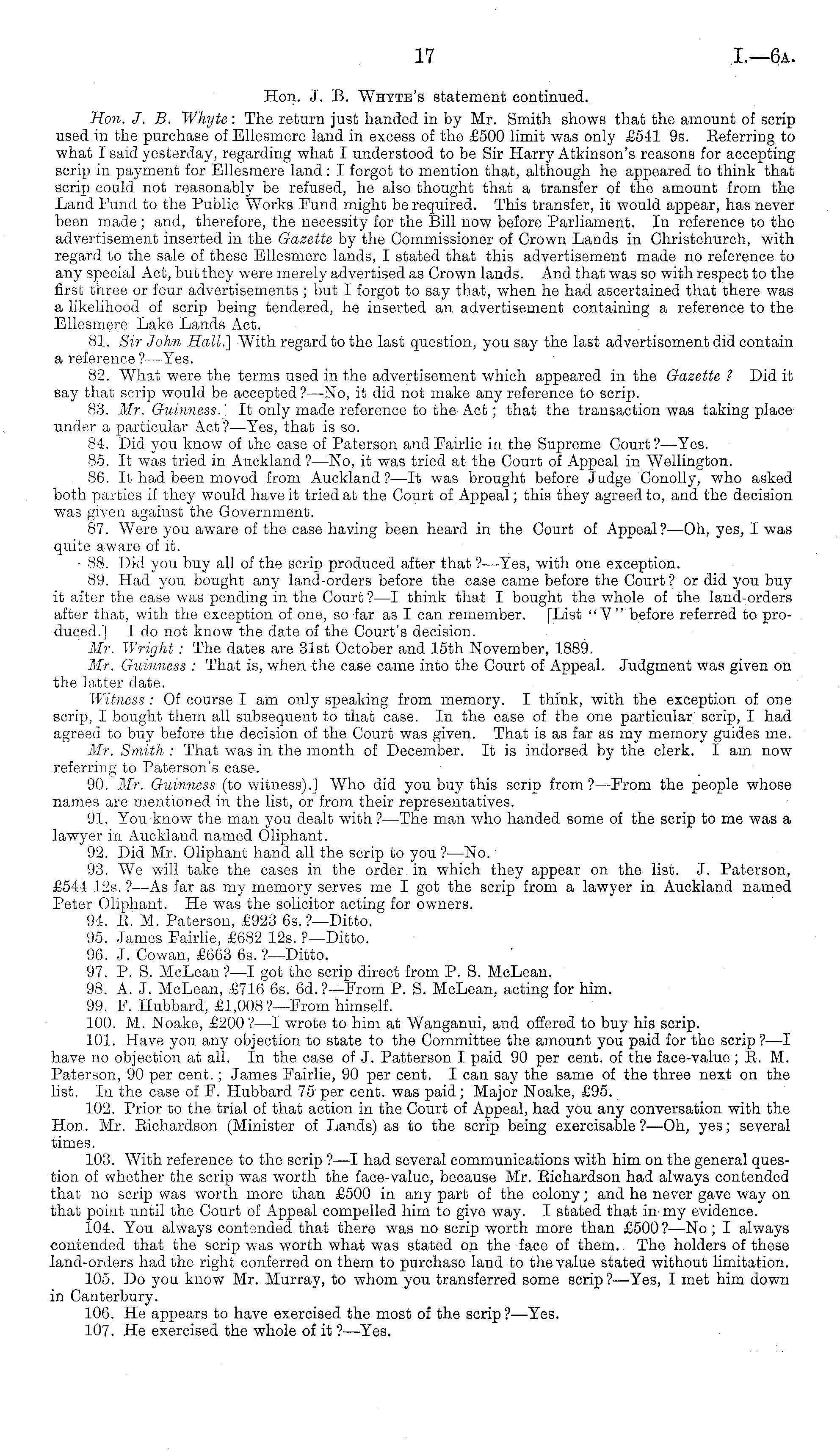 Hon. J. B. Whyte's statement continued. Hon. J. B. Whyte : The return just handed in by Mr. Smith shows that the amount of scrip used in the purchase of Ellesmere land in excess of the £500 limit was only £541 9s. Eeferring to what I said yesterday, regarding what I understood to be Sir Harry Atkinson's reasons for accepting scrip in payment for Ellesmere land: I forgot to mention that, although he appeared to think that scrip could not reasonably be refused, he also thought that a transfer of the amount from the Land Fund to the Public Works Fund might be required. This transfer, it would appear, has never been made ; and, therefore, the necessity for the Bill now before Parliament. In reference to the advertisement inserted in the Gazette by the Commissioner of Crown Lands in Christchurch, with regard to the sale of these Ellesmere lands, I stated that this advertisement made no reference to any special Act, but they were merely advertised as Crown lands. And that was so with respect to the first three or four advertisements ; but I forgot to say that, when he had ascertained that there was a likelihood of scrip being tendered, he inserted an advertisement containing a reference to the Ellesmere Lake Lands Act. 81. Sir John Hall.] "With regard to the last question, you say the last advertisement did contain a reference ?—Yes. 82. What were the terms used in the advertisement which appeared in the Gazette ? Did it say that scrip would be accepted ? —No, it did not make any reference to scrip. 83. Mr. Guinness.'] It only made reference to the Act; that the transaction was taking place under a particular Act ?—Yes, that is so. 84. Did you know of the case of Paterson and Fairlie in the Supreme Court ?—Yes. 85. It was tried in Auckland ?—No, it was tried at the Court of Appeal in Wellington. 86. It had been moved from Auckland ?—lt was brought before Judge Conolly, who asked both parties if they would have it tried at the Court of Appeal; this they agreed to, and the decision was given against the Government. 87. Were you aware of the case having been heard in the Court of Appeal?—Oh, yes, I was quite aware of it. • 83. Did you buy all of the scrip produced after that ?—Yes, with one exception. 89. Had you bought any land-orders before the case came before the Court ? or did you buy it after the case was pending in the Court ?—I think that I bought the whole of the land-orders after that, with the exception of one, so far as I can remember. [List "V" before referred to produced.] Ido not know the date of the Court's decision. Mr. Wright: The dates are 31st October and 15th November, 1889. Mr. Guinness : That is, when the case came into the Court of Appeal. Judgment was given on the latter date. Witness : Of course I am only speaking from memory. I think, with the exception of one scrip, I bought them all subsequent to that case. In the case of the one particular scrip, I had agreed to buy before the decision of the Court was given. That is as far as my memory guides me. Mr. Smith : That was in the month of December. It is indorsed by the clerk. I am now referring to Paterson's case. 90. Mr. Guinness (to witness).] Who did you buy this scrip from ?—From the people whose names are mentioned in the list, or from their representatives. 91. You know the man you dealt with?— The man who handed some of the scrip to me was a lawyer in Auckland named Oliphant. 92. Did Mr. Oliphant hand all the scrip to you?— No. 93. We will take the cases in the order in which they appear on the list. J. Paterson, £544 12s. ?—As far as my memory serves me I got the scrip from a lawyer in Auckland named Peter Oliphant. He was the solicitor acting for owners. 94. E. M. Paterson, £923 6s.?—Ditto. 95. James Fairlie, £682 12s. ?—Ditto. 96. J. Cowan, £663 6s. ?—Ditto. 97. P. S. McLean ?—I got the scrip direct from P. S. McLean. 98. A. J. McLean, £716 6s. 6d.?—From P. S. McLean, acting for him. 99. F. Hubbard, £1,008?— From himself. 100. M. Noake, £200 ?—I wrote to him at Wanganui, and offered to buy his scrip. 101. Have you any objection to state to the Committee the amount you paid for the scrip?—l have no objection at all. In the case of J. Patterson I paid 90 per cent, of the face-value ;E. M. Paterson, 90 per cent.; James Fairlie, 90 per cent. I can say the same of the three next on the list. In the case of F. Hubbard 75 1 per cent, was paid; Major Noake, £95. 102. Prior to the trial of that action in the Court of Appeal, had you any conversation with the Hon. Mr. Richardson (Minister of Lands) as to the scrip being exercisable ? —Oh, yes; several times. 103. With reference to the scrip ?—I had several communications with him on the general question of whether the scrip was worth the face-value, because Mr. Bichardson had always contended that no scrip was worth more than £500 in any part of the colony; and he never gave way on that point until the Court of Appeal compelled him to give way. I stated that in my evidence. 104. You always contended that there was no scrip worth more than £500? —No ; I always contended that the scrip was worth what was stated on the face of them. The holders of these land-orders had the right conferred on them to purchase land to the value stated without limitation. 105. Do you know Mr. Murray, to whom you transferred some scrip ? —Yes, I met him down in Canterbury. 106. He appears to have exercised the most of the scrip?— Yes. 107. He exercised the whole of it ?—Yes.