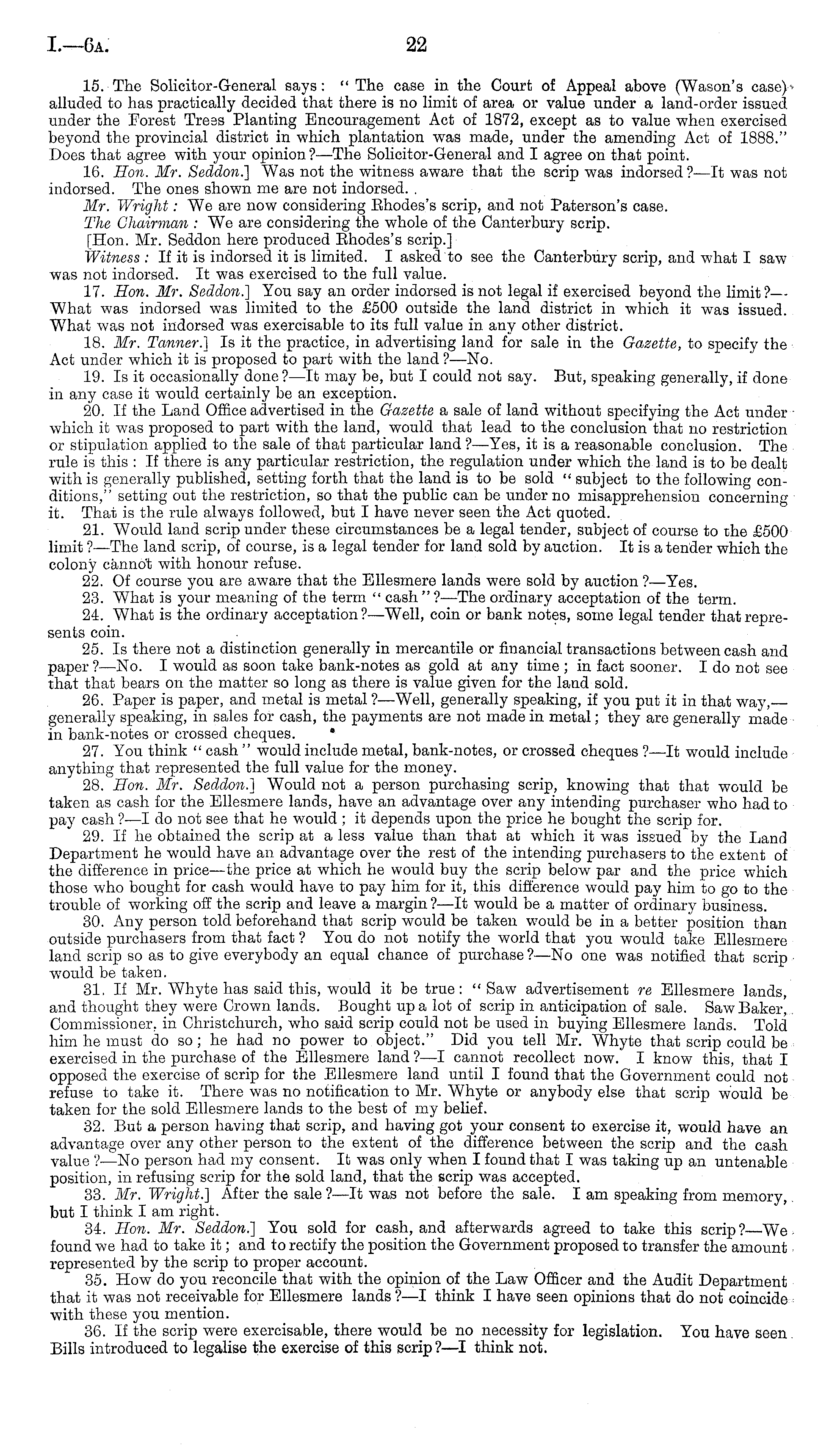 15. The Solicitor-General says: "The case in the Court of Appeal above (Wason's case) alluded to has practically decided that there is no limit of area or value under a land-order issued under the Forest Tress Planting Encouragement Act of 1872, except as to value when exercised beyond the provincial district in which plantation was made, under the amending Act of 1888." Does that agree with your opinion ? —The Solicitor-General and I agree on that point. 16. Hon. Mr. Seddon.] "Was not the witness aware that the scrip was indorsed?—lt was not indorsed. The ones shown me are not indorsed. Mr. Wright: We are now considering Ehodes's scrip, and not Paterson's case. The Chairman : We are considering the whole of the Canterbury scrip. [Hon. Mr. Seddon here produced Ehodes's scrip.] Witness : If it is indorsed it is limited. I asked to see the Canterbury scrip, and what I saw was not indorsed. It was exercised to the full value. 17. Hon. Mr. Seddon.] You say an order indorsed is not legal if exercised beyond the limit?— What was indorsed was limited to the £500 outside the land district in which it was issued. What was not indorsed was exercisable to its full value in any other district. 18. Mr. Tanner.] Is it the practice, in advertising land for sale in the Gazette, to specify the Act under which it is proposed to part with the land ?—No. 19. Is it occasionally done ? —lt may be, but I could not say. But, speaking generally, if done in any case it would certainly be an exception. 20. If the Land Office advertised in the Gazette a sale of land without specifying the Act under which it was proposed to part with the land, would that lead to the conclusion that no restriction or stipulation applied to the sale of that particular land ?—Yes, it is a reasonable conclusion. The rule is this : If there is any particular restriction, the regulation under which the land is to be dealt with is generally published, setting forth that the land is to be sold " subject to the following conditions," setting out the restriction, so that the public can be under no misapprehension concerning it. That is the rule always followed, but I have never seen the Act quoted. 21. Would land scrip under these circumstances be a legal tender, subject of course to the £500 limit ? —The land scrip, of course, is a legal tender for land sold by auction. It is a tender which the colony cannot with honour refuse. 22. Of course you are aware that the Ellesmere lands were sold by auction ?—Yes. 23. What is your meaning of the term " cash " ? —The ordinary acceptation of the term. 24. What is the ordinary acceptation?— Well, coin or bank notes, some legal tender that represents coin. 25. Is there not a distinction generally in mercantile or financial transactions between cash and paper?— No. I would as soon take bank-notes as gold at any time ; in fact sooner. Ido not see that that bears on the matter so long as there is value given for the land sold. 26. Paper is paper, and metal is metal ?—Well, generally speaking, if you put it in that way, generally speaking, in sales for cash, the payments are not made in metal; they are generally made in bank-notes or crossed cheques. 27. You think " cash " would include metal, bank-notes, or crossed cheques ?—lt would include anything that represented the full value for the money. 28. Hon. Mr. Seddon.] Would not a person purchasing scrip, knowing that that would be taken as cash for the Ellesmere lands, have an advantage over any intending purchaser who had to pay cash ?—I do not see that he would ;it depends upon the price he bought the scrip for. 29. If he obtained the scrip at a less value than that at which it was issued by the Land Department he would have an advantage over the rest of the intending purchasers to the extent of the difference in price—the price at which he would buy the scrip below par and the price which those who bought for cash would have to pay him for it, this difference would pay him to go to the trouble of working off the scrip and leave a margin ? —lt would be a matter of ordinal-}' business. 30. Any person told beforehand that scrip would be taken would be in a better position than outside purchasers from that fact ? You do not notify the world that you would take Ellesmere land scrip so as to give everybody an equal chance of purchase ?—No one was notified that scrip would be taken. 31. If Mr. Whyte has said this, would it be true: "Saw advertisement re Ellesmere lands, and thought they were Crown lands. Bought up a lot of scrip in anticipation of sale. Saw Baker, Commissioner, in Christchurch, who said scrip could not be used in buying Ellesmere lands. Told him he must do so; he had no power to object." Did you tell Mr. Whyte that scrip could be exercised in the purchase of the Ellesmere land ?—I cannot recollect now. I know this, that I opposed the exercise of scrip for the Ellesmere land until I found that the Government could not refuse to take it. There was no notification to Mr. Whyte or anybody else that scrip would be taken for the sold Ellesmere lands to the best of my belief. 32. But a person having that scrip, and having got your consent to exercise it, would have an advantage over any other person to the extent of the difference between the scrip and the cash value ?—No person had my consent. It was only when I found that I was taking up an untenable position, in refusing scrip for the sold land, that the scrip was accepted. 33. Mr. Wright.] After the sale ?—lt was not before the sale. lam speaking from memory, but I think I am right. 34. Hon. Mr. Seddon.] You sold for cash, and afterwards agreed to take this scrip?—We found we had to take it; and to rectify the position the Government proposed to transfer the amount - represented by the scrip to proper account. 35. How do you reconcile that with the opinion of the Law Officer and the Audit Department that it was not receivable for Ellesmere lands ? —I