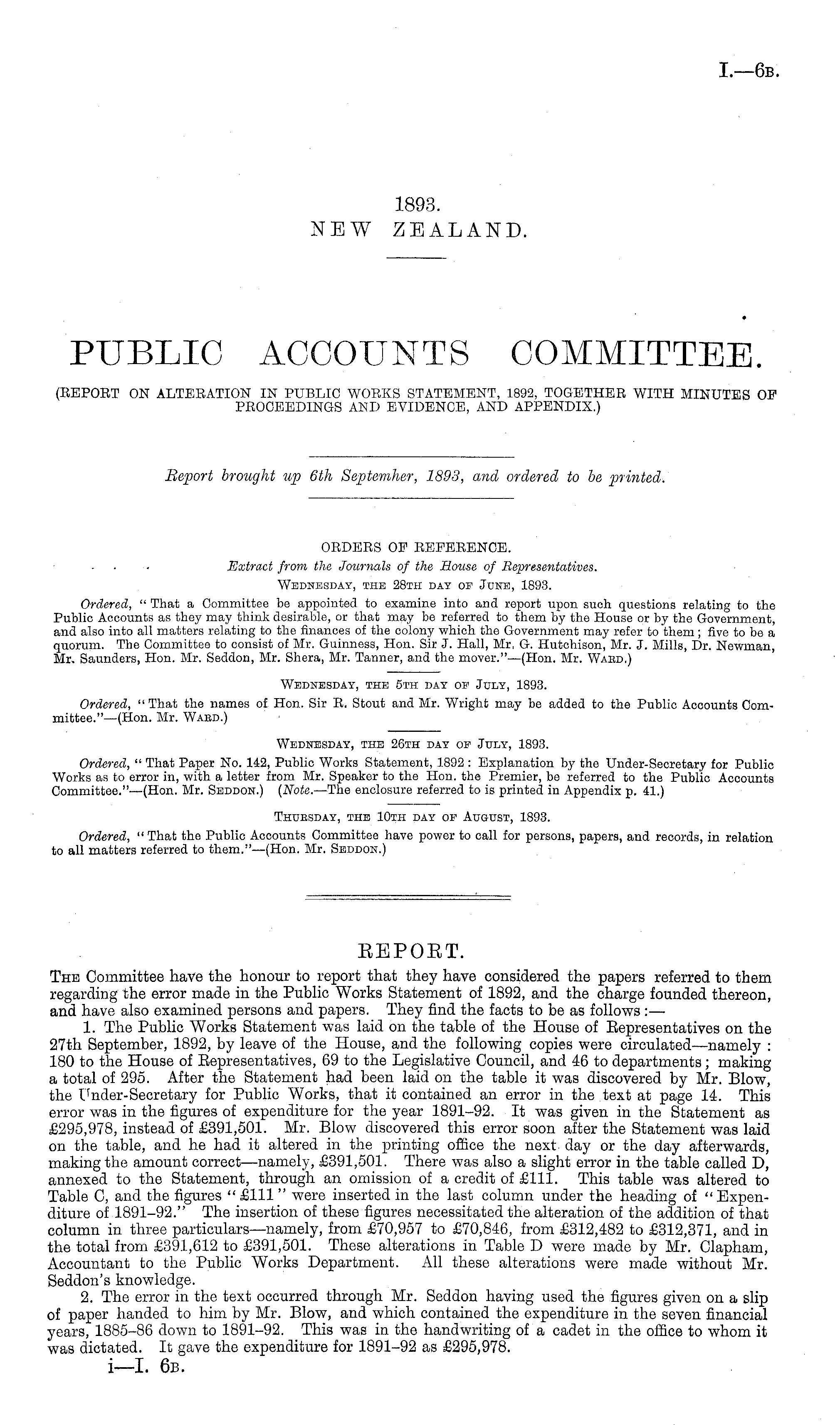 EEPOET. The Committee have the honour to report that they have considered the papers referred to them regarding the error made in the Public Works Statement of 1892, and the charge founded thereon, and have also examined persons and papers. They find the facts to be as follows :— 1. The Public Works Statement was laid on the table of the House of Bepresentatives on the 27th September, 1892, by leave of the House, and the following copies were circulated—namely : 180 to the House of Bepresentatives, 69 to the Legislative Council, and 46 to departments; making a total of 295. After the Statement had been laid on the table it was discovered by Mr. Blow, the Under-Secretary for Public Works, that it contained an error in the text at page 14. This error was in the figures of expenditure for the year 1891-92. It was given in the Statement as £295,978, instead of £391,501. Mr. Blow discovered this error soon after the Statement was laid on the table, and he had it altered in the printing office the next day or the day afterwards, making the amount correct —namely, £391,501. There was also a slight error in the table called D, annexed to the Statement, through an omission of a credit of £111. This table was altered to Table C, and the figures "£111" were inserted in the last column under the heading of "Expenditure of 1891-92." The insertion of these figures necessitated the alteration of the addition of that column in three particulars—namely, from £70,957 to £70,846, from £312,482 to £312,371, and in the total from £391,612 to £391,501. These alterations in Table D were made by Mr. Clapham, Accountant to the Public Works Department. All these alterations were made without Mr. Seddon's knowledge. 2. The error in the text occurred through Mr. Seddon having used the figures given on a slip of paper handed to him by Mr. Blow, and which contained the expenditure in the seven financial years, 1885-86 down to 1891-92. This was in the handwriting of a cadet in the office to whom it was dictated. It gave the expenditure for 1891-92 as £295,978.