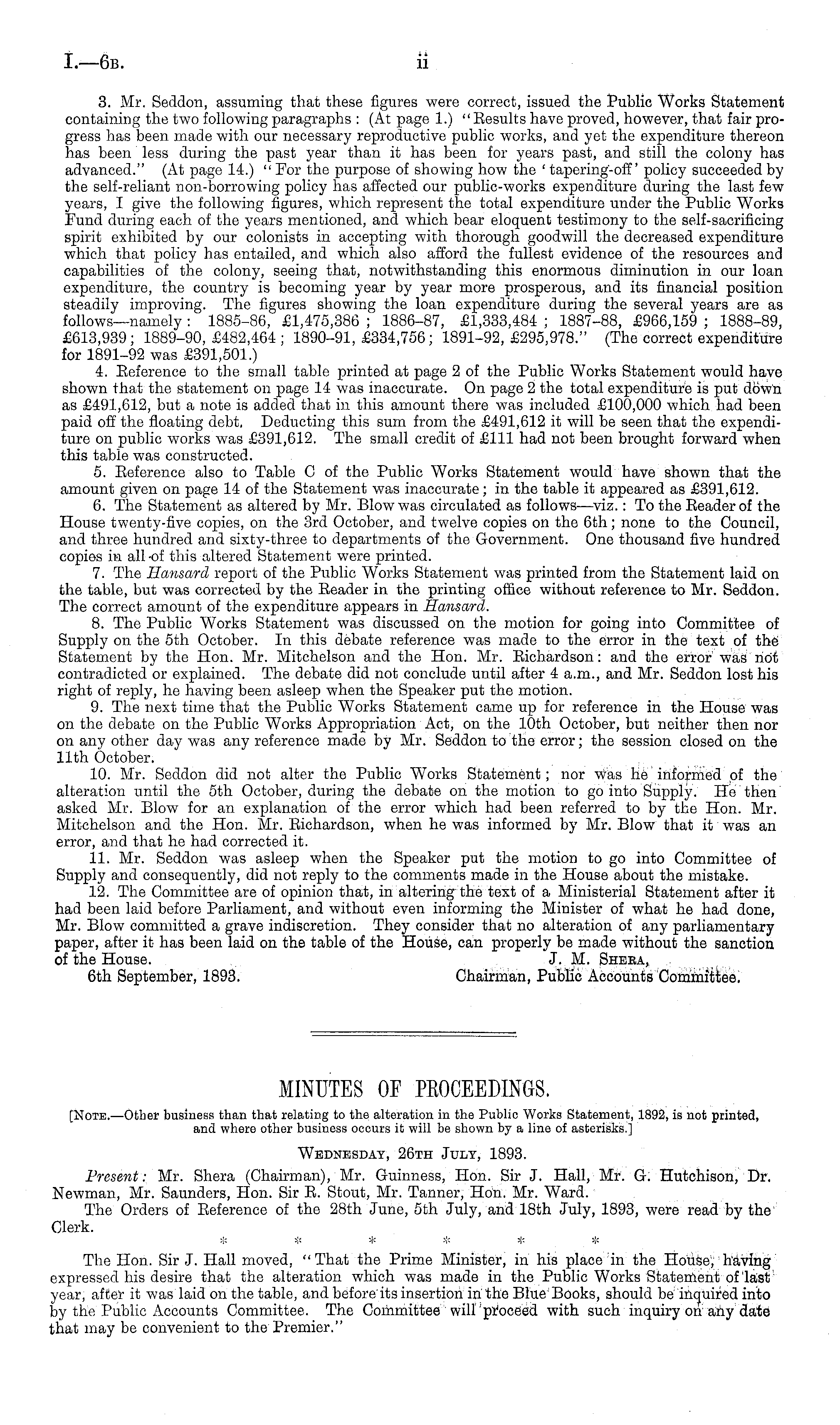 3. Mr. Seddon, assuming that these figures were correct, issued the Public Works Statement containing the two following paragraphs : (At page 1.) " Besults have proved, however, that fair progress has been made with our necessary reproductive public works, and yet the expenditure thereon has been less during the past year than it has been for years past, and still the colony has advanced." (At page 14.) " For the purpose of showing how the ' tapering-off' policy succeeded by the self-reliant non-borrowing policy has affected our public-works expenditure during the last few years, I give the following figures, which represent the total expenditure under the Public Works Fund during each of the years mentioned, and which bear eloquent testimony to the self-sacrificing spirit exhibited by our colonists in accepting with thorough goodwill the decreased expenditure which that policy has entailed, and which also afford the fullest evidence of the resources and capabilities of the colony, seeing that, notwithstanding this enormous diminution in our loan expenditure, the country is becoming year by year more prosperous, and its financial position steadily improving. The figures showing the loan expenditure during the several years are as follows—namely : 1885-86, £1,475,386 ; 1886-87, £1,333,484 ; 1887-88, £966,159 ; 1888-89, £613,939; 1889-90, £482,464 ; 1890-91, £334,756; 1891-92, £295,978." (The correct expenditure for 1891-92 was £391,501.) 4. Beference to the small table printed at page 2 of the Public Works Statement would have shown that the statement on page 14 was inaccurate. On page 2 the total expenditure is put down as £491,612, but a note is added that in this amount there was included £100,000 which had been paid off the floating debt. Deducting this sum from the £491,612 it will be seen that the expenditure on public works was £391,612. The small credit of £111 had not been brought forward when this table was constructed. 5. Beference also to Table C of the Public Works Statement would have shown that the amount given on page 14 of the Statement was inaccurate; in the table it appeared as £391,612. 6. The Statement as altered by Mr. Blow was circulated as follows—viz.: To the Eeader of the House twenty-five copies, on the 3rd October, and twelve copies on the 6th; none to the Council, and three hundred and sixty-three to departments of the Government. One thousand five hundred copies in all-of this altered Statement were printed. 7. The Hansard report of the Public Works Statement was printed from the Statement laid on the table, but was corrected by the Eeader in the printing office without reference to Mr. Seddon. The correct amount of the expenditure appears in Hansard. 8. The Public Works Statement was discussed on the motion for going into Committee of Supply on the sth October. In this debate reference was made to the error in the text of the Statement by the Hon. Mr. Mitchelson and the Hon. Mr. Eichardson: and the error was not contradicted or explained. The debate did not conclude until after 4 a.m., and Mr. Seddon lost his right of reply, he having been asleep when the Speaker put the motion. 9. The next time that the Public Works Statement came up for reference in the House was on the debate on the Public Works Appropriation Act, on the 10th October, but neither then nor on any other day was any reference made by Mr. Seddon to the error; the session closed on the 11th October. 10. Mr. Seddon did not alter the Public Works Statement; nor was he informed of the alteration until the sth October, during the debate on the motion to go into Supply. He then asked Mr. Blow for an explanation of the error which had been referred to by the Hon. Mr. Mitchelson and the Hon. Mr. Eichardson, when he was informed by Mr. Blow that it was an error, and that he had corrected it. 11. Mr. Seddon was asleep when the Speaker put the motion to go into Committee of Supply and consequently, did not reply to the comments made in the House about the mistake. 12. The Committee are of opinion that, in altering the text of a Ministerial Statement after it had been laid before Parliament, and without even informing the Minister of what he had done, Mr. Blow committed a grave indiscretion. They consider that no alteration of any parliamentary paper, after it has been laid on the table of the House, can properly be made without the sanction of the House. J. M. Sheea, 6th September, 1893. Chairman, Public Accounts Committee.