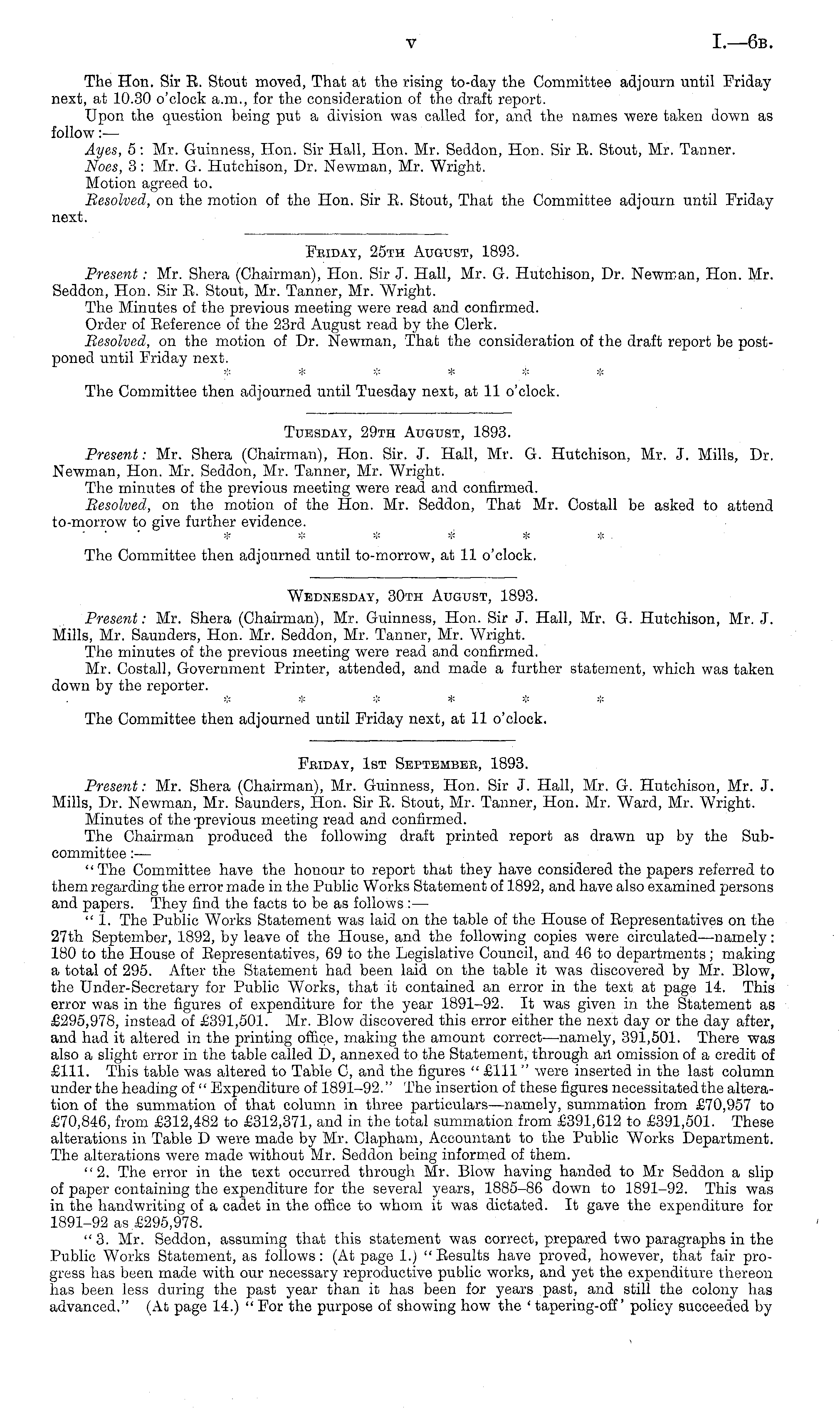 Friday, Ist September, 1893. Present: Mr. Shera (Chairman), Mr. Guinness, Hon. Sir J. Hall, Mr. G. Hutchison, Mr. J. Mills, Dr. Newman, Mr. Saunders, Hon. Sir E. Stout, Mr. Tanner, Hon. Mr. Ward, Mr. Wright. Minutes of the previous meeting read and confirmed. The Chairman produced the following draft printed report as drawn up by the Subcommittee :— "The Committee have the honour to report that they have considered the papers referred to them regarding the error made in the Public Works Statement of 1892, and have also examined persons and papers. They find the facts to be as follows : — "1. The Public Works Statement was laid on the table of the House of Bepresentatives on the 27th September, 1892, by leave of the House, and the following copies were circulated—namely: 180 to the House of Bepresentatives, 69 to the Legislative Council, and 46 to departments; making a total of 295. After the Statement had been laid on the table it was discovered by Mr. Blow, the Under-Secretary for Public Works, that it contained an error in the text at page 14. This error was in the figures of expenditure for the year 1891-92. It was given in the Statement as £295,978, instead of £391,501. Mr. Blow discovered this error either the next day or the day after, and had it altered in the printing office, making the amount correct —namely, 391,501. There was also a slight error in the table called D, annexed to the Statement, through ari omission of a credit of £111. This table was altered to Table C, and the figures " £111" were inserted in the last column under the heading of " Expenditure of 1891-92." The insertion of these figures necessitatedthe alteration of the summation of that column in three particulars—namely, summation from £70,957 to £70,846, from £312,482 to £312,371, and in the total summation from £391,612 to £391,501. These alterations in Table D were made by Mr. Clapham, Accountant to the Public Works Department. The alterations were made without Mr. Seddon being informed of them. "2. The error in the text occurred through Mr. Blow having handed to Mr Seddon a slip of paper containing the expenditure for the several years, 1885-86 down to 1891-92. This was in the handwriting of a cadet in the office to whom it was dictated. It gave the expenditure for 1891-92 as £295,978. "3. Mr. Seddon, assuming that this statement was correct, prepared two paragraphs in the Public Works Statement, as follows: (At page 1.) " Besults have proved, however, that fair progress has been made with our necessary reproductive public works, and yet the expenditure thereon has been less during the past year than it has been for years past, and still the colony has advanced." (At page 14.) " For the purpose of showing how the ' tapering-off' policy succeeded by