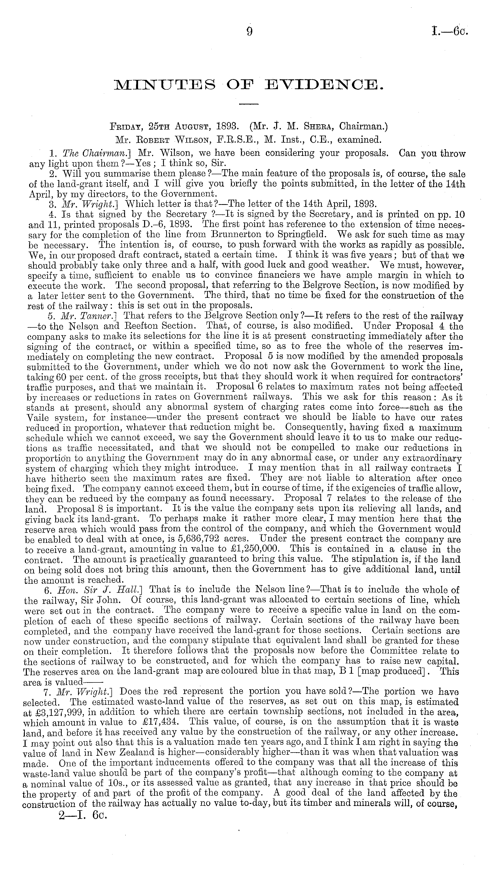 Feidat, 25th August, 1893. (Mr. J. M. Shbea, Chairman.) Mr. Eobeet Wilson, F.8.5.E., M. Inst., C.E., examined. 1. The Chairman.'] Mr. Wilson, we have been considering your proposals. Can you throw any light upon them ?—Yes ; I think so, Sir. 2. Will you summarise them please ?—The main feature of the proposals is, of course, the sale of the land-grant itself, and I will give you briefly the points submitted, in the letter of the 14th April, by my directors, to the Government. 3. Mr. Wright.] Which letter is that ?—The letter of the 14th April, 1893. 4. Is that signed by the Secretary ?—lt is signed by the Secretary, and is printed on pp. 10 and 11, printed proposals D.-6, 1893. The first point has reference to the extension of time necessary for the completion of the line from Brunnerton to Springfield. We ask for such time as may be necessary. The intention is, of course, to push forward with the works as rapidly as possible. We, in our proposed draft contract, stated a certain time. I think it was five years ; but of that we should probably take only three and a half, with good luck and good weather. We must, however, specify a time, sufficient to enable us to convince financiers we have ample margin in which to execute the work. The second proposal, that referring to the Belgrove Section, is now modified by a later letter sent to the Government. The third, that no time be fixed for the construction of the rest of the railway: this is set out in the proposals. 5. Mr. Tanner.] That refers to the Belgrove Section only?—lt refers to the rest of the railway —to the Nelson and Eeefton Section. That, of course, is also modified. Under Proposal 4 the company asks to make its selections for the line it is at present constructing immediately after the signing of the contract, or within a specified time, so as to free the whole of the reserves immediately on completing the new contract. Proposal sis now modified by the amended proposals submitted to the Government, under which we do not now ask the Government to work the line, taking 60 per cent, of the gross receipts, but that they should work it when required for contractors' traffic purposes, and that we maintain it. Proposal 6 relates to maximum rates not being affected by increases or reductions in rates on Government railways. This we ask for this reason :As it stands at present, should any abnormal system of charging rates come into force—such as the Vaile system, for instance —under the present contract we should be liable to have our rates reduced in proportion, whatever that reduction might be. Consequently, having fixed a maximum schedule which we cannot exceed, we say the Government should leave it to us to make our reductions as traffic necessitated, and that we should not be compelled to make our reductions in proportion to anything the Government may do in any abnormal case, or under any extraordinary system of charging which they might introduce. I may mention that in all railway contracts I have hitherto seen the maximum rates are fixed. They are- not liable to alteration after once being fixed. The company cannot exceed them, but in course of time, if the exigencies of traffic allow, they can be reduced by the company as found necessary. Proposal 7 relates to the release of the land. Proposal Bis important. It is the value the company sets upon its relieving all lands, and giving back its land-grant. To perhaps make it rather more clear, I may mention here that the reserve area which would pass from the control of the company, and which the Government would be enabled to deal with at once, is 5,636,792 acres. Under the present contract the company are to receive a land-grant, amounting in value to £1,250,000. This is contained in a clause in the contract. The amount is practically guaranteed to bring this value. The stipulation is, if the land on being sold does not bring this amount, then the Government has to give additional land, until the amount is reached. 6. Hon. Sir J. Hall.] That is to include the Nelson line ? —That is to include the whole of the railway, Sir John. Of course, this land-grant was allocated to certain sections of line, which were set out in the contract. The company were to receive a specific value in land on the completion of each of these specific sections of railway. Certain sections of the railway have been completed, and the company have received the land-grant for those sections. Certain sections are now under construction, and the company stipulate that equivalent land shall be granted for these on their completion. It therefore follows that the proposals now before the Committee relate to the sections of railway to be constructed, and for which the company has to raise new capital. The reserves area on the land-grant map are coloured blue in that map, B 1 [map produced]. This area is valued 7. Mr. Wright.] Does the red represent the portion you have sold?— The portion we have selected. The estimated waste-land value of the reserves, as set out on this map, is estimated at £3,127,999, in addition to which there are certain township sections, not included, in the area, which amount in value to £17,434. This value, of course, is on the assumption that it is waste land, and before it has received any value by the construction of the railway, or any other increase. I may point out also that this is a valuation made ten years ago, and I think I am right in saying the value of land in New Zealand is higher—considerably higher —than it was when that valuation was made. One of the important inducements offered to the company was that all the increase of this waste-land value should be part of the company's profit—that although coming to the company at a nominal value of 10s., or its assessed value as granted, that any increase in that price should be the property of and part of the profit of the company. A good deal of the land affected by the construction of the railway has a