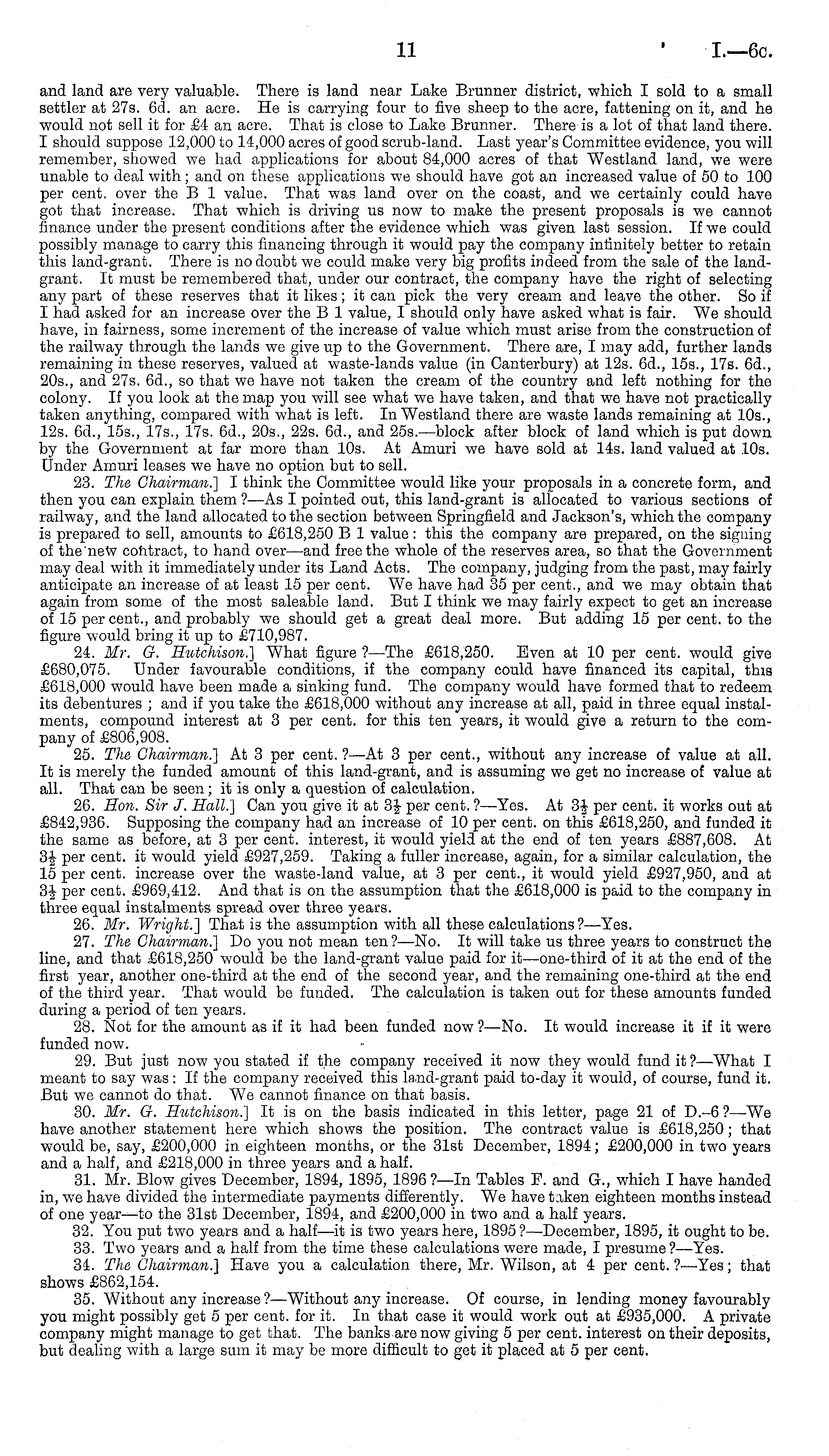 and land are very valuable. There is land near Lake Brunner district, which I sold to a small settler at 275. 6d. an acre. He is carrying four to five sheep to the acre, fattening on it, and he would not sell it for £4 an acre. That is close to Lake Brunner. There is a lot of that land there. I should suppose 12,000 to 14,000 acres of good scrub-land. Last year's Committee evidence, you will remember, showed we had applications for about 84,000 acres of that Westland land, we were unable to deal with; and on these applications we should have got an increased value of 50 to 100 per cent, over the B 1 value. That was land over on the coast, and we certainly could have got that increase. That which is driving us now to make the present proposals is we cannot finance under the present conditions after the evidence which was given last session. If we could possibly manage to carry this financing through it would pay the company infinitely better to retain this land-grant. There is no doubt we could make very big profits indeed from the sale of the landgrant. It must be remembered that, under our contract, the company have the right of selecting any part of these reserves that it likes; it can pick the very cream and leave the other. So if I had asked for an increase over the B 1 value, I should only have asked what is fair. We should have, in fairness, some increment of the increase of value which must arise from the construction of the railway through the lands we give up to the Government. There are, I may add, further lands remaining in these reserves, valued at waste-lands value (in Canterbury) at 12s. 6d., 155., 17s. 6d., 205., and 275. 6d., so that we have not taken the cream of the country and left nothing for the colony. If you look at the map you will see what we have taken, and that we have not practically taken anything, compared with what is left. In Westland there are waste lands remaining at 10s., 12s. 6d., 155., 175., 17s. 6d., 205., 225. 6d., and 25s. —block after block of land which is put down by the Government at far more than 10s. At Amuri we have sold at 14s. land valued at 10s. Under Amuri leases we have no option but to sell. 23. The Chairman.'] I think the Committee would like your proposals in a concrete form, and then you can explain them ? —As I pointed out, this land-grant is allocated to various sections of railway, and the land allocated to the section between Springfield and Jackson's, which the company is prepared to sell, amounts to £618,250 B 1 value : this the company are prepared, on the signing of the'neW contract, to hand over—and free the whole of the reserves area, so that the Government may deal with it immediately under its Land Acts. The company, judging from the past, may fairly anticipate an increase of at least 15 per cent. We have had 35 per cent., and we may obtain that again from some of the most saleable land. But I think we may fairly expect to get an increase of 15 per cent., and probably we should get a great deal more. But adding 15 per cent, to the figure would bring it up to £710,987. 24. Mr. G. Hutchison.] What figure ?—The £618,250. Even at 10 per cent, would give £680,075. Under favourable conditions, if the company could have financed its capital, this £618,000 would have been made a sinking fund. The company would have formed that to redeem its debentures ; and if you take the £618,000 without any increase at all, paid in three equal instalments, compound interest at 3 per cent, for this ten years, it would give a return to the company of £806,908. 25. The Chairman.] At 3 per cent. ? —At 3 per cent., without any increase of value at all. It is merely the funded amount of this land-grant, and is assuming we get no increase of value at all. That can be seen; it is only a question of calculation. 26. Hon. Sir J. Hall.] Can you give it at 3J per cent. ? —Yes. At 3J per cent, it works out at £842,936. Supposing the company had an increase of 10 per cent, on this £618,250, and funded it the same as before, at 3 per cent, interest, it would yield at the end of ten years £887,608. At 3-| per cent, it would yield £927,259. Taking a fuller increase, again, for a similar calculation, the 15 per cent, increase over the waste-land value, at 3 per cent., it would yield £927,950, and at 3J per cent. £969,412. And that is on the assumption that the £618,000 is paid to the company in three equal instalments spread over three years. 26. Mr. Wright.'] That is the assumption with all these calculations ? —Yes. 27. The Chairman.] Do you not mean ten? —No. It will take us three years to construct the line, and that £618,250 would be the land-grant value paid for it—one-third of it at the end of the first year, another one-third at the end of the second year, and the remaining one-third at the end of the third year. That would be funded. The calculation is taken out for these amounts funded during a period of ten years. 28. Not for the amount as if it had been funded now ? —No. It would increase it if it were funded now. 29. But just now you stated if the company received it now they would fund it ?—What I meant to say was : If the company received this la.nd-grant paid to-day it would, of course, fund it. But we cannot do that. We cannot finance on that basis. 30. Mr. G. Hutchison.] It is on the basis indicated in this letter, page 21 of D.-6 ?—We have another statement here which shows the position. The contract value is £618,250; that would be, say, £200,000 in eighteen months, or the 31st December, 1894; £200,000 in two years and a half, and £218,000 in three years and a half. 31. Mr. Blow gives December, 1894, 1895, 1896 ?—ln Tables P. and G., which I have handed in, we have divided the intermediate payments differently. We have taken eighteen months instead of one year—to the 31st December, 1894, and £200,000 in two and a half years. 32. You put two years and a half—it is two years here, 1895 ?—-D
