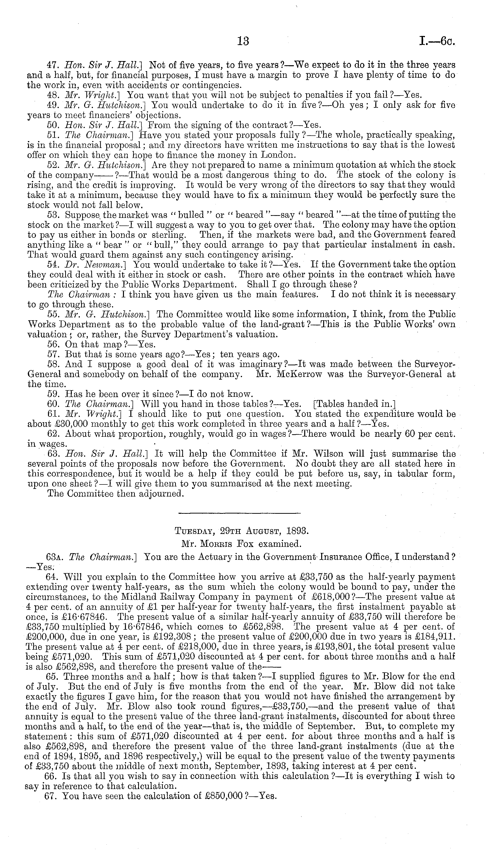 Tuesday, 29th August, 1893. Mr. Mobeis Fox examined. 63a. The Chairman.'] You are the Actuary in the Government Insurance Office, I understand ? Vpq _L CD. 64. Will you explain to the Committee how you arrive at £33,750 as the half-yearly payment extending over twenty half-years, as the sum which the colony would be bound to pay, under the circumstances, to the Midland Eailway Company in payment of £618,000 ?—The present value at 4 per cent, of an. annuity of £1 per half-year for twenty half-years, the first instalment payable at once, is £1667846. The present value of a similar half-yearly annuity of £33,750 will therefore be £33,750 multiplied by 16-67846, which comes to £562,898. The present value at 4 per cent, of £200,000, due in one year, is £192,308 ; the present value of £200,000 due in two years is £184,911. The present value at 4 per cent, of £218,000, due in three years, is £193,801, the total present value being £571,020. This sum of £571,020 discounted at 4 per cent, for about three months and a half is also £562,898, and therefore the present value of the65. Three months and a half; how is that taken?—l supplied figures to Mr. Blow for the end of July. But the end of July is five months from the end of the year. Mr. Blow did not take exactly the figures I gave him, for the reason that you would not have finished the arrangement by the end of July. Mr. Blow also took round figures,—£33,7so,—and the present value of that annuity is equal to the present value of the three land-grant instalments, discounted for about three months and a half, to the end of the year —that is, the middle of September. But, to complete my statement: this sum of £571,020 discounted at 4 per cent, for about three months and a half is also £562,898, and therefore the present value of the three land-grant instalments (due at the end of 1894,1895, and 1896 respectively,) will be equal to the present value of the twenty payments of £33,750 about the middle of next month, September, 1893, taking interest at 4 per cent. 66. Is that all you wish to say in connection with this calculation ? —lt is everything I wish to say in reference to that calculation. 67. You have seen the calculation of £850,000 ?—Yes.