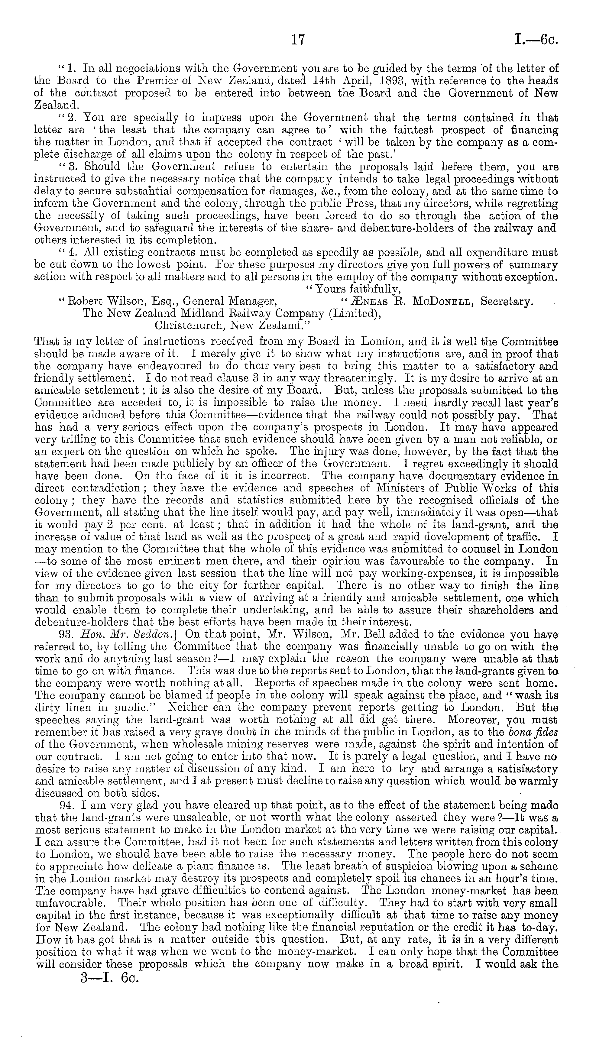 " 1. In all negociations with the Government you are to be guided by the terms of the letter of the Board to the Premier of New Zealand, dated 14th April, 1893, with reference to the heads of the contract proposed to be entered into between the Board and the Government of New Zealand. "2. You are specially to impress upon the Government that the terms contained in that letter are ' the least that the company can agree to' with the faintest prospect of financing the matter in London, and that if accepted the contract ' will be taken by the company as a complete discharge of all claims upon the colony in respect of the past.' "3. Should the Government refuse to entertain the proposals laid befere them, you are instructed to give the necessary notice that the company intends to take legal proceedings without delay to secure substantial compensation for damages, &c, from the colony, and at the same time to inform the Government and the colony, through the public Press, that my directors, while regretting the necessity of taking such proceedings, have been forced to do so through the action of the Government, and to safeguard the interests of the share- and debenture-holders of the railway and others interested in its completion. "4. All existing contracts must be completed as speedily as possible, and all expenditure must be cut down to the lowest point. For these purposes my directors give you full powers of summary action with respoct to all matters and to all persons in the employ of the company without exception. " Yours faithfully, " Bobert Wilson, Esq., General Manager, " .ZEneas E. McDonell, Secretary. The New Zealand Midland Eailway Company (Limited), Christchurch, New Zealand." That is my letter of instructions received from my Board in London, and it is well the Committee should be made aware of it. I merely give it to show what my instructions are, and in proof that the company have endeavoured to do their very best to bring this matter to a satisfactory and friendly settlement. Ido not read clause 3in any way threateningly. It is my desire to arrive at an amicable settlement; it is also the desire of my Board. But, unless the proposals submitted to the Committee are acceded to, it is impossible to raise the money. I need hardly recall last year's evidence adduced before this Committee—evidence that the railway could not possibly pay. That has had a very serious effect upon the company's prospects in London. It may have appeared very trifling to this Committee that such evidence should have been given by a man not reliable, or an expert on the question on which he spoke. The injury was done, however, by the fact that the statement had been made publicly by an officer of the Government. I regret exceedingly it should have been done. On the face of it it is incorrect. The company have documentary evidence in direct contradiction ; they have the evidence and speeches of Ministers of Public Works of this colony ; they have the records and statistics submitted here by the recognised officials of the Government, all stating that the line itself would pay, and pay well, immediately it was open—that it would pay 2 per cent, at least; that in addition it had. the whole of its land-grant, and the increase of value of that land as well as the prospect of a great and rapid development of traffic. I may mention to the Committee that the whole of this evidence was submitted to counsel in London —to some of the most eminent men there, and their opinion was favourable to the company. In view of the evidence given last session that the line will not pay working-expenses, it is impossible for my directors to go to the city for further capital. There is no other way to finish the line than to submit proposals with a view of arriving at a friendly and amicable settlement, one which would enable them to complete their undertaking, and be able to assure their shareholders and debenture-holders that the best efforts have been made in their interest. 93. Hon. Mr. Seddon.] On that point, Mr. Wilson, Mr. Bell added to the evidence you have referred to, by telling the Committee that the company was financially unable to go on with the work and do anything last season ? —I may explain the reason the company were unable at that time to go on with finance. This was due to the reports sent to London, that the land-grants given to the company were worth nothing at all. Eeports of speeches made in the colony were sent home. The company cannot be blamed if people in the colony will speak against the place, and " wash its dirty linen in public." Neither can the company prevent reports getting to London. But the speeches saying the land-grant was worth nothing at all did get there. Moreover, you must remember it has raised a very grave doubt in the minds of the public in London, as to the bona fides of the Government, when wholesale mining reserves were made, against the spirit and intention of our contract. lam not going to enter into that now. It is purely a legal question, and I have no desire to raise any matter of discussion of any kind. I am here to try and arrange a satisfactory and amicable settlement, and I at present must decline to raise any question which would be warmly discussed on both sides. 94. I am very glad you have cleared up that point, as to the effect of the statement being made that the land-grants were unsaleable, or not worth what the colony asserted they were ? —lt was a most serious statement to make in the London market at the very time we were raising our capital. I can assure the Committee, had it not been for such statements and letters written from this colony to London, we should have been able to raise the necessary money. The people here do not seem to appreciate how delicate a plant finance is. The least breath of suspicion blowing upon a scheme in the London market may destroy its prospects and completely spoil its chances in an hour's time. The company have had grave 
