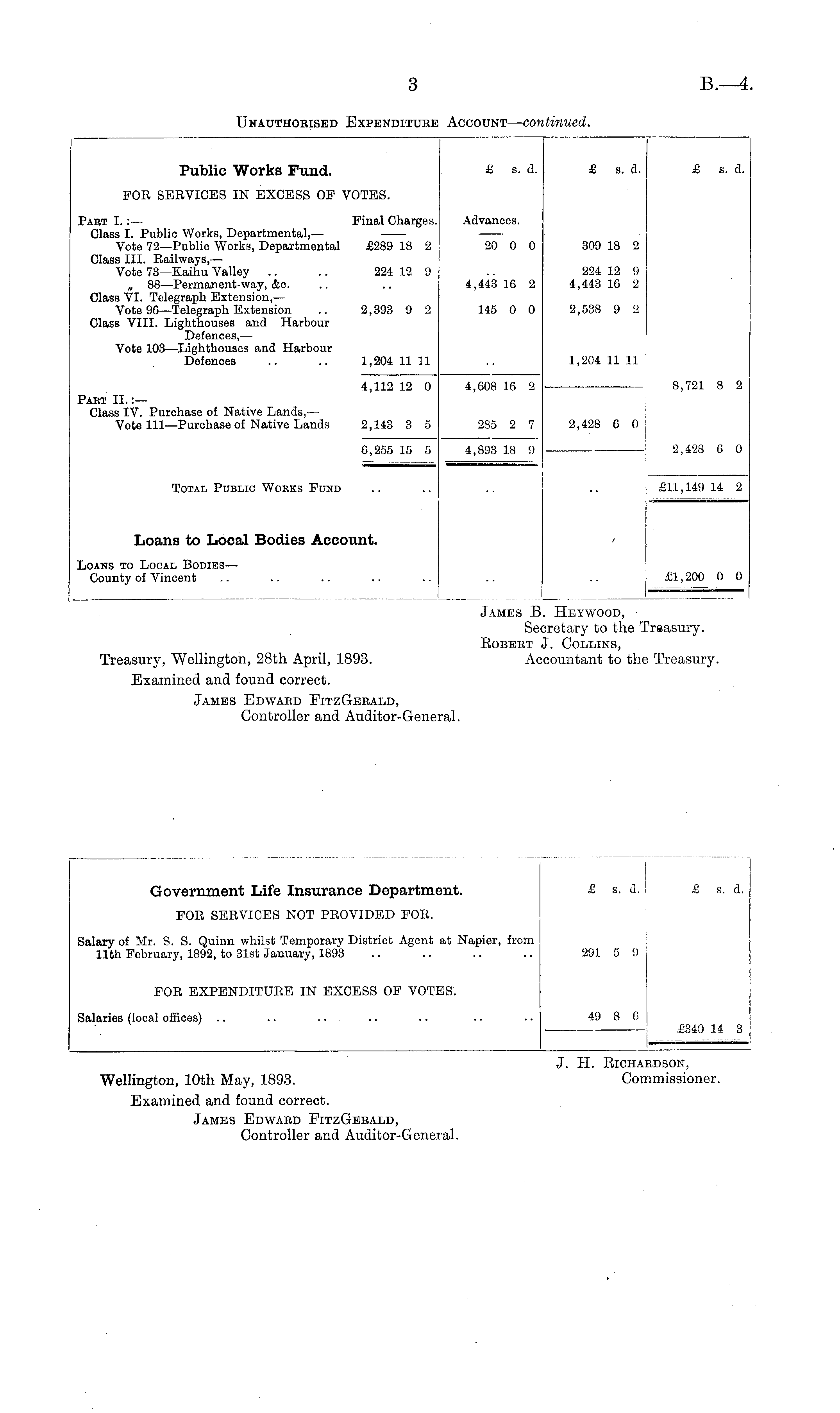James B. Heywood, Secretary to the Treasury. Eobeet J. Collins, Treasury, Wellington, 28th April, 1893. Accountant to the Treasury. Examined and found correct. James Edwaed EitzGeeald, Controller and Auditor-General.