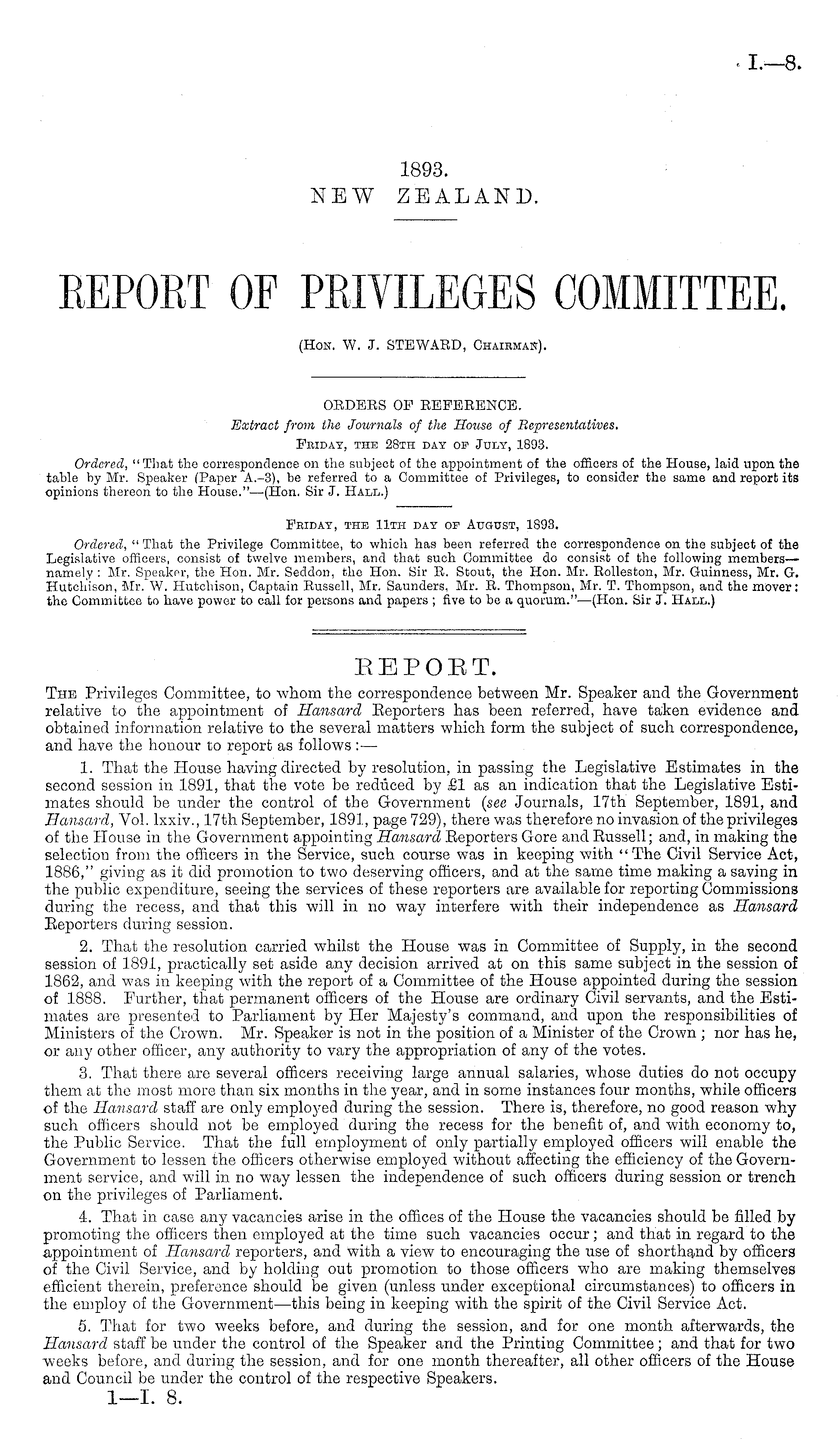 Friday, the 11th day of August, 1893. Ordered, " That the Privilege Committee, to which has been referred the correspondence on the subject of the Legislative officers, consist of twelve members, and that such Committee do consist of the following members— namely : Mr. Speaknr, the Hon. Mr. Seddon, the Hon. Sir R. Stout, the Hon. Mr. Rolleston, Mr. Guinness, Mr. G. Hutchison, Mr. W. Hutchison, Captain Eussell, Mr. Saunders, Mr. R. Thompson, Mr. T. Thompson, and the mover: the Committee to have power to call for persons and papers ; five to be a quorum."—(Hon. Sir J. Hall.)