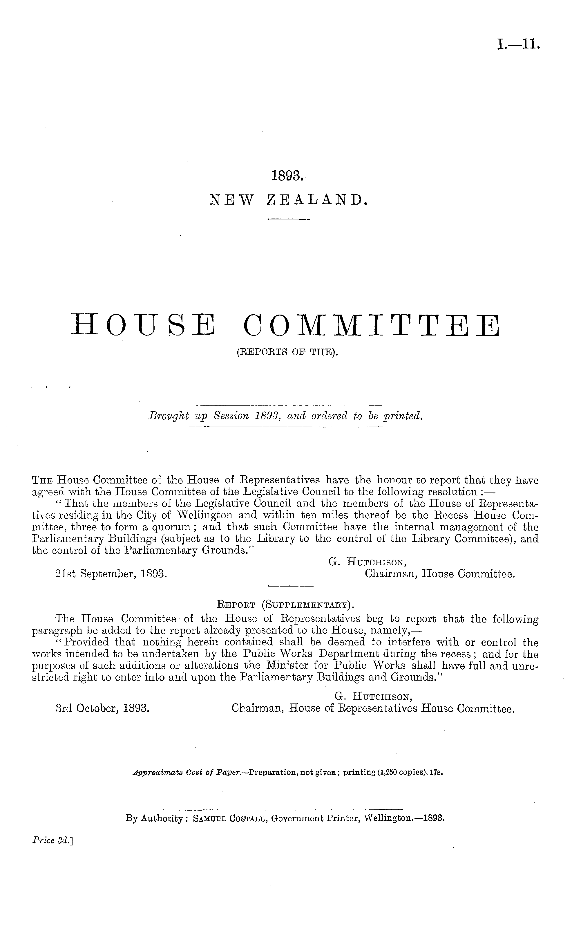 The House Committee of the House of Eepresentatives have the honour to report that they have agreed with the House Committee of the Legislative Council to the following resolution :— "That the members of the Legislative Council and the members of the House of Eepresentatives residing in the City of Wellington and within ten miles thereof be the Eecess House Committee, three to form a quorum; and that such Committee have the internal management of the Parliamentary Buildings (subject as to the Library to the control of the Library Committee), and the control of the Parliamentary Grounds." G. Hutchison, 21st September, 1893. Chairman, House Committee.