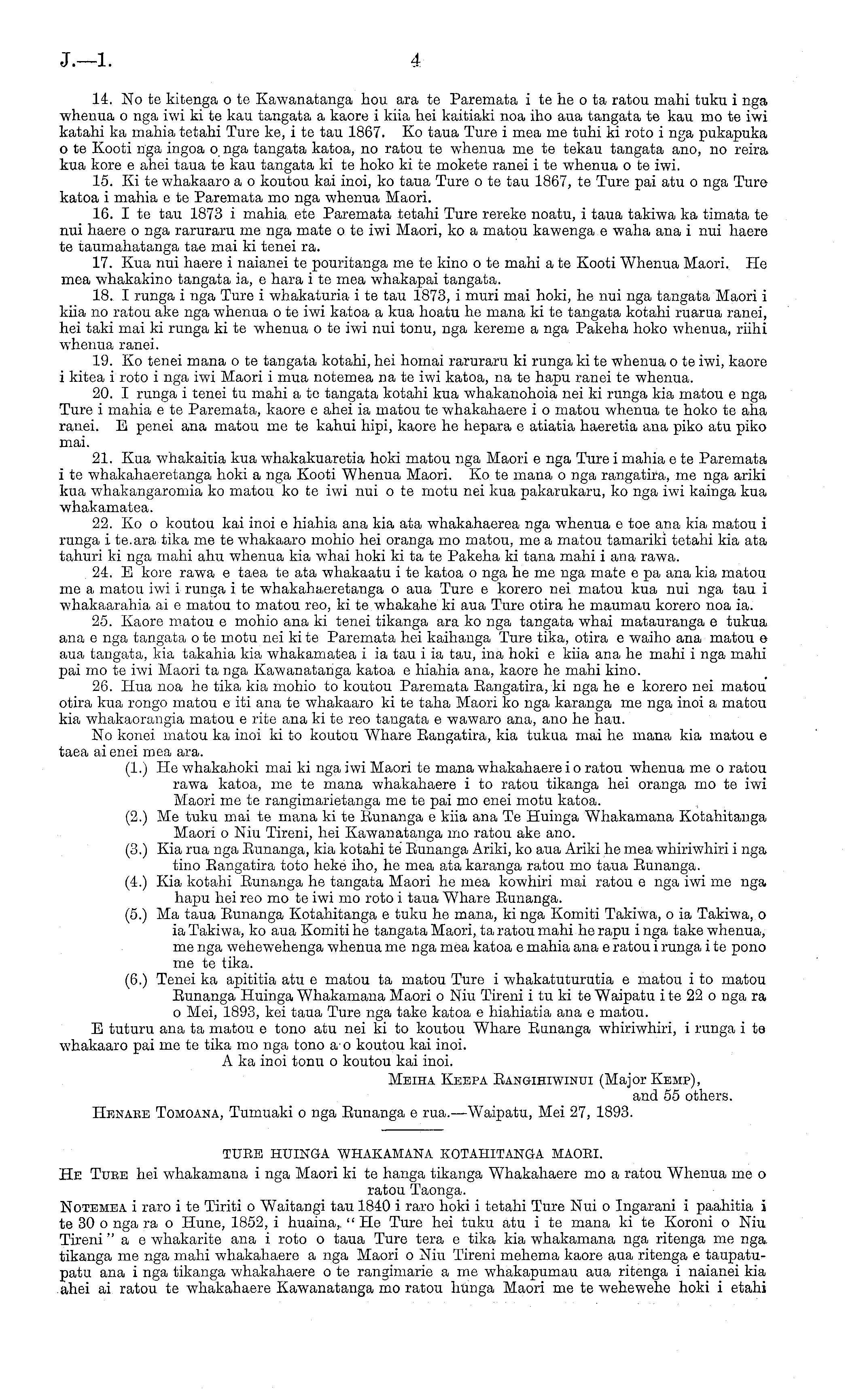 14. No te kitenga o te Kawanatanga hou ara te Paremata i te he o ta ratou mahi tuku i nga whenua o nga iwi kite kau tangata a kaore i kiia hei kaitiaki noa iho aua tangata te kau mo te iwi katahi ka mahia tetahi Ture ke, ite tau 1867. Ko taua Ture i mea me tuhi ki roto i nga pukapuka 0 te Kooti nga ingoa o nga tangata katoa, no ratou te whenua me te tekau tangata ano, no reira kua kore c ahei taua te kau tangata kite hoko kite mokete ranei i te whenua o te iwi. 15. Xi te whakaaro a o koutou kai inoi, ko taua Ture o te tau 1867, te Ture pai atu o nga Ture katoa i mahia c te Paremata mo nga whenua Maori. 16. I te tau 1873 i mahia etc Paremata tetahi Ture rereke noatu, i taua takiwa ka timata te nui haere o nga raruraru me nga mate o te iwi Maori, ko a matou kawenga c waha ana i nui haere te taumahatanga tae mai ki tenei ra. 17. Kua nui haere i naianei te pouritanga me te kino ote mahi ate Kooti Whenua Maori. He mea whakakino tangata ia, c hara i te mea whakapai tangata. 18. I runga i nga Ture i whakaturia i te tau 1873, i muri mai hoki, he nui nga tangata Maori i kiia no ratou ake nga whenua o te iwi katoa a kua hoatu he mana kite tangata kotahi ruarua ranei, hei taki mai ki runga kite whenua o te iwi nui tonu, nga kereme a nga Pakeha hoko whenua, riihi whenua ranei. 19. Ko tenei mana o te tangata kotahi, hei homai raruraru ki runga kite whenua o te iwi, kaore 1 kitea i roto i nga iwi Maori i mua notemea na te iwi katoa, na te hapu ranei te whenua. 20. I runga i tenei tv mahi a to tangata kotahi kua whakanohoia nei ki runga kia matou c nga Ture i mahia c te Paremata, kaore c ahei ia matou te whakahaere i o matou whenua te hoko te aha ranei. E penei ana matou me te kahui hipi, kaore he hepara c atiatia haeretia ana piko atu piko mai. 21. Kua whakaitia kua whakakuaretia hoki matou nga Maori c nga Ture i mahia c te Paremata ite whakahaeretanga hoki a nga Kooti Whenua Maori. Ko te mana o nga rangatira, me nga ariki kua whakangaromia ko matou ko te iwi nui o te motu nei kua pakarukaru, ko nga iwi kainga kua whakamatea. 22. Ko o koutou kai inoi c hiahia ana kia ata whakahaerea nga whenua c toe ana kia matou i runga i te.ara tika me te whakaaro mohio hei oranga mo matou, me a matou tamariki tetahi kia ata tahuri ki nga mahi ahu whenua kia whai hoki ki ta te Pakeha ki tana mahi i ana rawa. 24. E kore rawa c taea te ata whakaatu i te katoa o nga he me nga mate c pa ana kia matou me a matou iwi i runga i te whakahaeretanga o aua Ture c korero nei matou kua nui nga tau i whakaarahia ai c matou to matou reo, kite whakahe ki aua Ture otira he maumau korero noa ia. 25. Kaore matou c mohio ana ki tenei tikanga ara ko nga tangata whai matauranga c tukua ana c nga tangata ote motu nei kite Paremata hei kaihanga Ture tika, otira c waiho ana matou c aua tangata, kia takahia kia whakamatea i ia tau i ia tau, ma hoki c kiia ana he mahi i nga mahi pai mo te iwi Maori ta nga Kawanatanga katoa c hiahia ana, kaore he mahi kino. 26. Hua noa he tika kia mohio to koutou Paremata Eangatira, ki nga he c korero nei matou otira kua rongo matou c iti ana te whakaaro kite taha Maori ko nga karanga me nga inoi a matou kia whakaorangia matou c rite ana kite reo tangata c wawaro ana, ano he hau. No konei matou ka inoi ki to koutou Whare Eangatira, kia tukua mai he mana kia matou c taea aienei mea ara. (1.) He whakahoki mai ki nga iwi Maori te mana whakahaere i o ratou whenua me o ratou rawa katoa, me te mana whakahaere i to ratou tikanga hei oranga mo te iwi Maori me te rangimarietanga me te pai mo enei motu katoa. (2.) Me tuku mai te mana kite Eunanga c kiia ana Te Huinga Whakamana Kotahitanga Maori o Niu Tireni, hei Kawanatanga mo ratou ake ano. (3.) Kia rua nga Eunanga, kia kotahi te Eunanga Ariki, ko aua Ariki he mea whiriwhiri i nga tino Eangatira toto heke iho, he mea ata karanga ratou mo taua Eunanga. (4.) Kia kotahi Eunanga he tangata Maori he mea kowhiri mai ratou c nga iwi me nga hapu hei reo mo te iwi mo roto i taua Whare Eunanga. (5.) Ma taua Eunanga Kotahitanga c tuku he mana, ki nga Komiti Takiwa, o ia Takiwa, o ia Takiwa, ko aua Komiti he tangata Maori, ta ratou mahi he rapu i nga take whenua, me nga wehewehenga whenua me nga mea katoa c mahia ana c ratou i runga i te pono me te tika. (6.) Tenei ka apititia atu c matou ta matou Ture i whakatuturutia c matou i to matou Eunanga Huinga Whakamana Maori o Niu Tireni i tv kite Waipatu i te 22 o nga ra o Mci, 1893, kei taua Ture nga take katoa c hiahiatia ana c matou. E tuturu ana ta matou c tono atu nei ki to koutou Whare Eunanga whiriwhiri, i runga i te whakaaro pai me te tika mo nga tono a o koutou kai inoi. A ka inoi tonu o koutou kai inoi. Meiha Keepa Eangihiwinui (Major Kemp), and 55 others. Henaee Tomoana, Tumuaki o nga Eunanga c rua.—Waipatu, Mci 27, 1893.