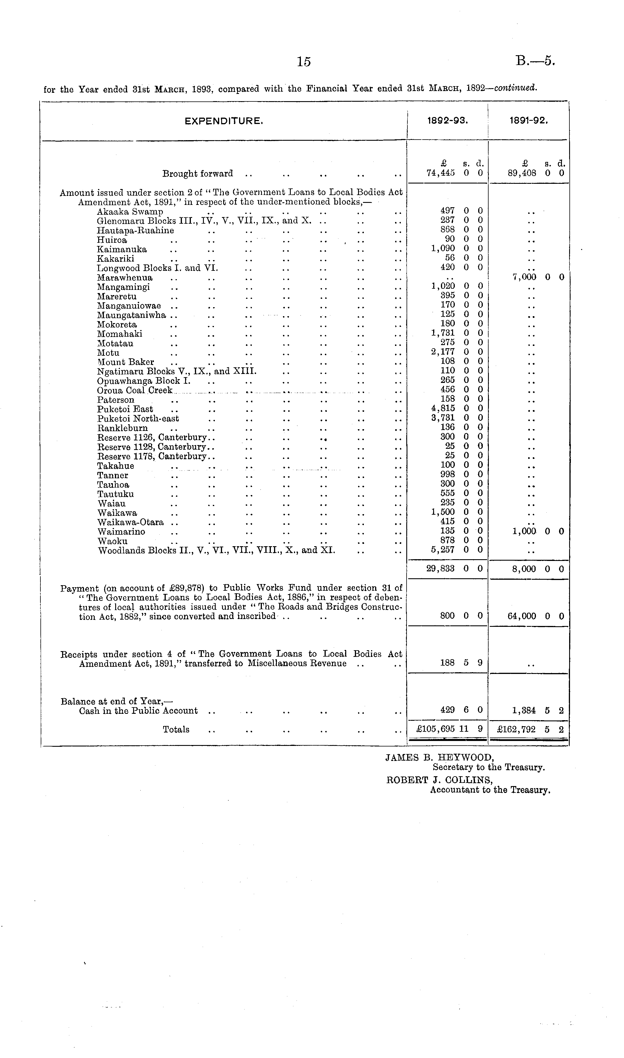 EXPENDITURE. 1892-93. 1891-92. £ s. d. 74,445 0 0 £ s. d. 89,403 0 0 Brought forward Amount issued under section 2 of " The Government Loans to Local Bodies Act Amendment Act, 1891," in respect of the under-mentioned blocks, — Akaaka Swamp Glenomaru Blocks III., IV., V., VII., IX., and X. .. Hautapa-Ruahine Huiroa .. .. .. .. .. ... Kaimanuka Kakariki Longwood Blocks I. and VI. Marawhenua Mangamingi Mareretu Manganuiowae Maungataniwha .. .. .. Mokoreta Momahaki Motatau Motu Mount Baker Ngatimaru Blocks V., IX., and XIII. Opuawhanga Block I. Oroua Coal Creek .......... .. ... .. Paterson Puketoi East Puketoi North-east Rankleburn .. .. .. Reserve 1126, Canterbury.. .. .. ., Reserve 1128, Canterbury.. Reserve 1178, Canterbury.. Takahue .. .. .. Tanner Tauhoa Tautuku Waiau Waikawa Waikawa-Otara Waimarino Waoku Woodlands Blocks II., V., VI., VII., VIII., X., and XI. 497 0 0 237 0 0 868 0 0 90 0 0 1,090 0 0 56 0 0 420 0 0 1,020 0 0 395 0 0 170 0 0 125 0 0 180 0 0 1,731 0 0 275 0 0 2,177 0 0 108 0 0 110 0 0 265 0 0 456 0 0 158 0 0 4.815 0 0 3,731 0 0 136 0 0 300 0 0 25 0 0 25 0 0 100 0 0 998 0 0 300 0 0 555 0 0 235 0 0 1,500 0 0 415 0 0 135 0 0 878 0 0 5,257 0 0 7,000 0 0 1,000 0 0 Payment (on account of £89,878) to Public Works Fund under section 31 of " The Government Loans to Local Bodies Act, 1886," in respect of debentures of local authorities issued under " The Roads and Bridges Construction Act, 1882," since converted and inscribed .. 29,833 0 0 8,000 0 0 800 0 0 64,000 0 0 Receipts under section 4 of " The Government Loans to Local Bodies Act Amendment Act, 1891," transferred to Miscellaneous Revenue 188 5 9 Balance at end of Year, — Cash in the Public Account Totals 429 6 0 £105,695 11 9 1,384 5 2 £162,792 5 2