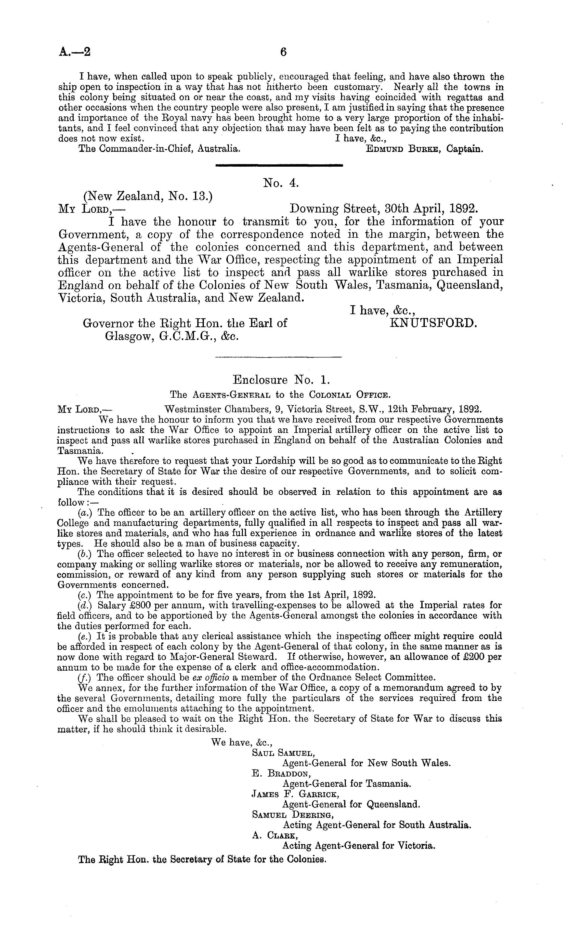 No. 4. (New Zealand, No. 13.) My Loed, — Downing Street, 30th April, 1892. I have the honour to transmit to you, for the information of your Government, a copy of the correspondence noted in the margin, between the Agents-General of the colonies concerned and this department, and between this department and the War Office, respecting the appointment of an Imperial officer on the active list to inspect and pass all warlike stores purchased in England on behalf of the Colonies of New South Wales, Tasmania, Queensland, Victoria, South Australia, and New Zealand. I have, &c, Governor the Right Hon. the Earl of KNUTSFORD. Glasgow, G.C.M.G., &o.
