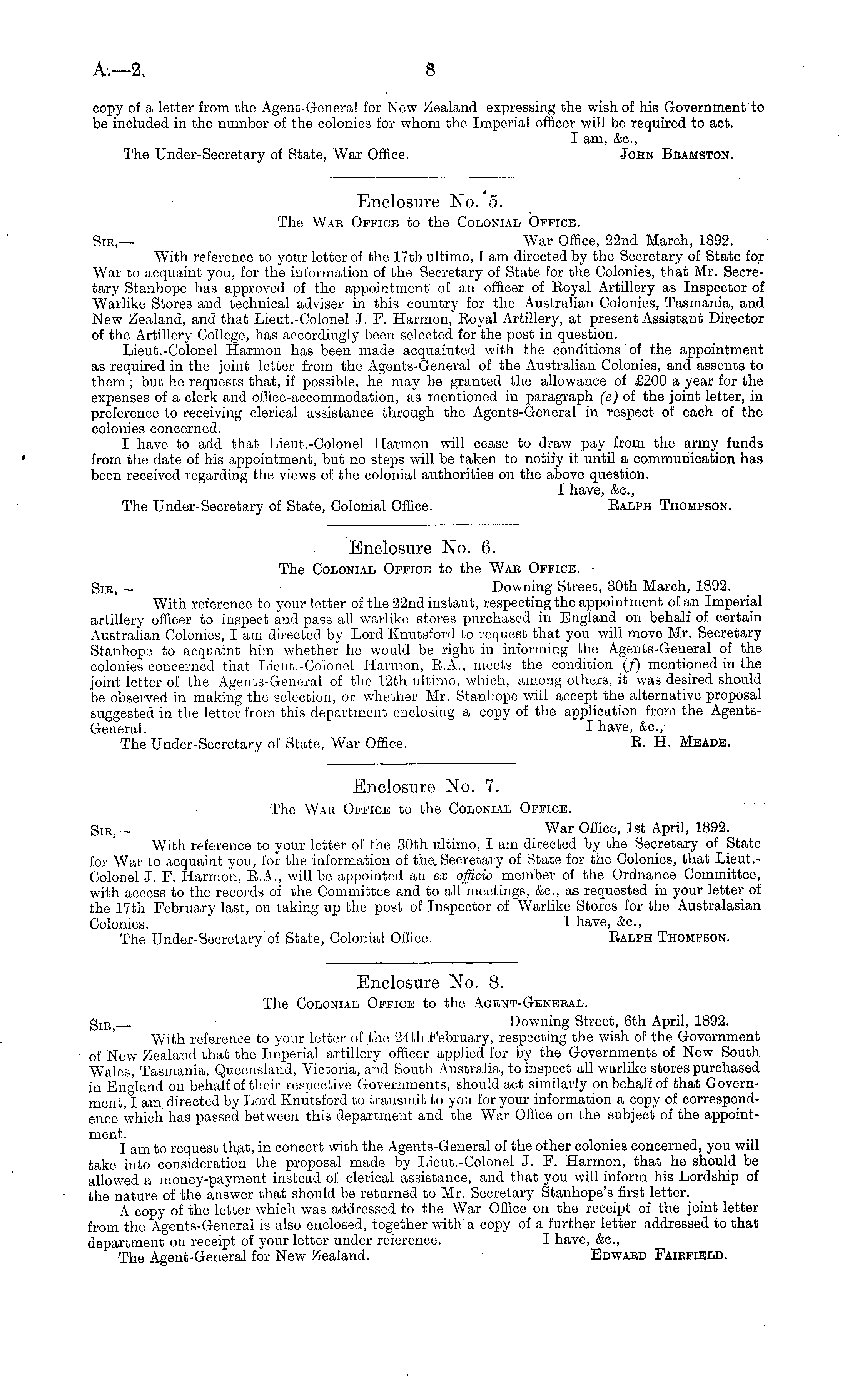 Enclosure No. 8. The Colonial Office to the Agent-Geneeal. Sib,— Downing Street, 6th April, 1892. With reference to your letter of the 24th February, respecting the wish of the Government of New Zealand that the Imperial artillery officer applied for by the Governments of New South Wales, Tasmania, Queensland, Victoria, and South Australia, to inspect all warlike stores purchased in England on behalf of their respective Governments, should act similarly on behalf of that Government, I am directed by Lord Knutsford to transmit to you for your information a copy of correspondence which has passed between this department and the War Office on the subject of the appointment. I am to request that, in concert with the Agents-General of the other colonies concerned, you will take into consideration the proposal made by Lieut.-Colonel J. F. Harmon, that he should be allowed a money-payment instead of clerical assistance, and that you will inform his Lordship of the nature of the answer that should be returned to Mr. Secretary Stanhope's first letter. A copy of the letter which was addressed to the War Office on the receipt of the joint letter from the Agents-General is also enclosed, together with a copy of a further letter addressed to that department on receipt of your letter under reference. I have, &c, The Agent-General for New Zealand. Edwaed Faiefield.