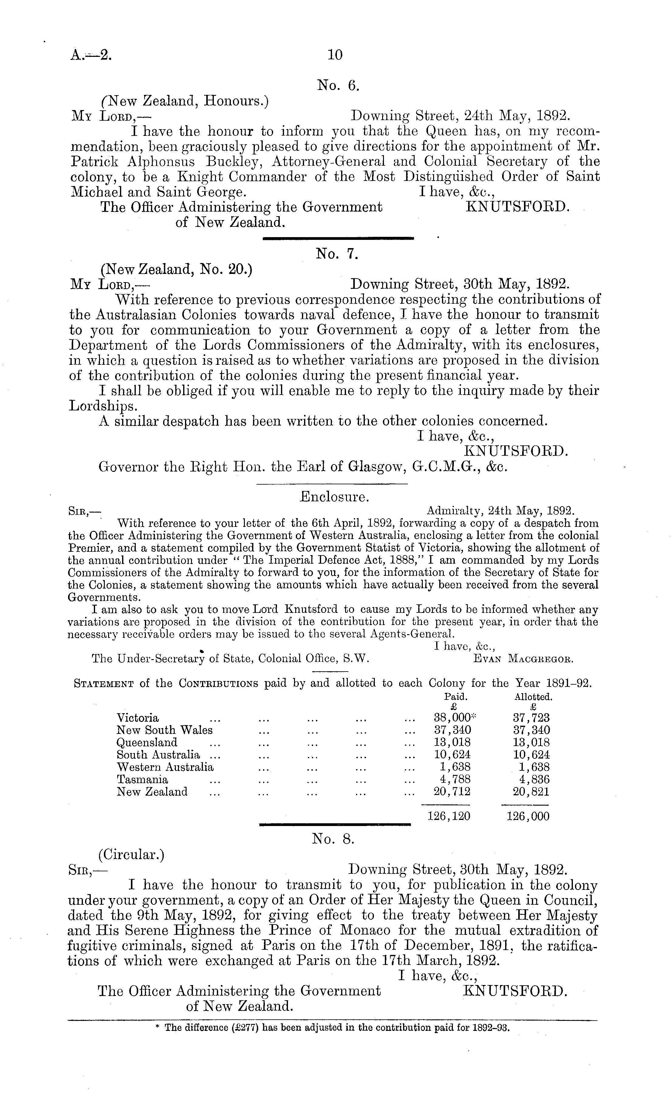 No. 7. (New Zealand, No. 20.) My Lord,— Downing Street, 30th May, 1892. With reference to previous correspondence respecting the contributions of the Australasian Colonies towards naval defence, I have the honour to transmit to you for communication to your Government a copy of a letter from the Department of the Lords Commissioners of the Admiralty, with its enclosures, in which a question is raised as to whether variations are proposed in the division of the contribution of the colonies during the present financial year. I shall be obliged if you will enable me to reply to the inquiry made by their Lordships. A similar despatch has been written to the other colonies concerned. I have, &c, KNUTSFOED. Governor the Eight Hon. the Earl of Glasgow, G.C.M.G., &c.